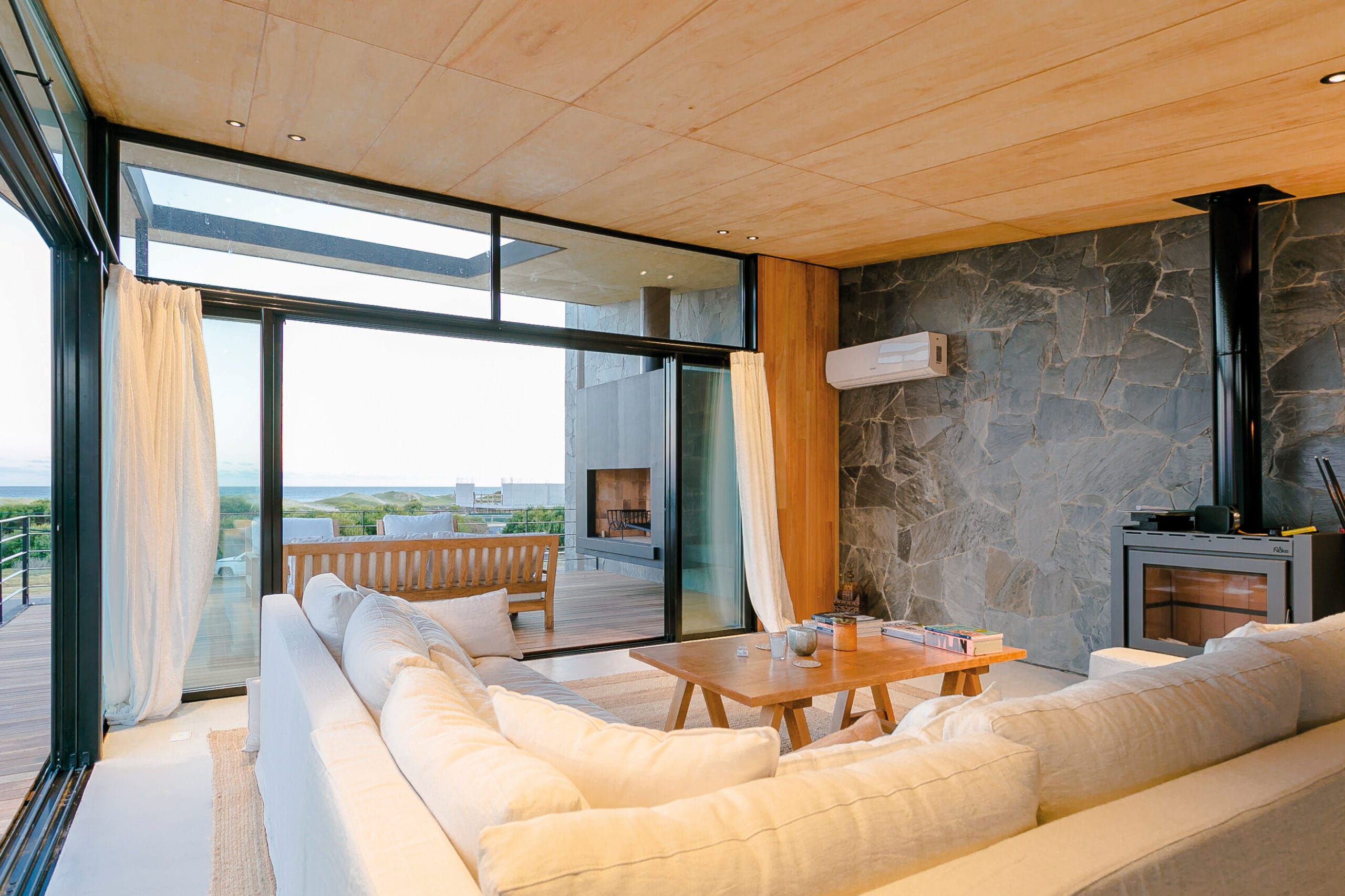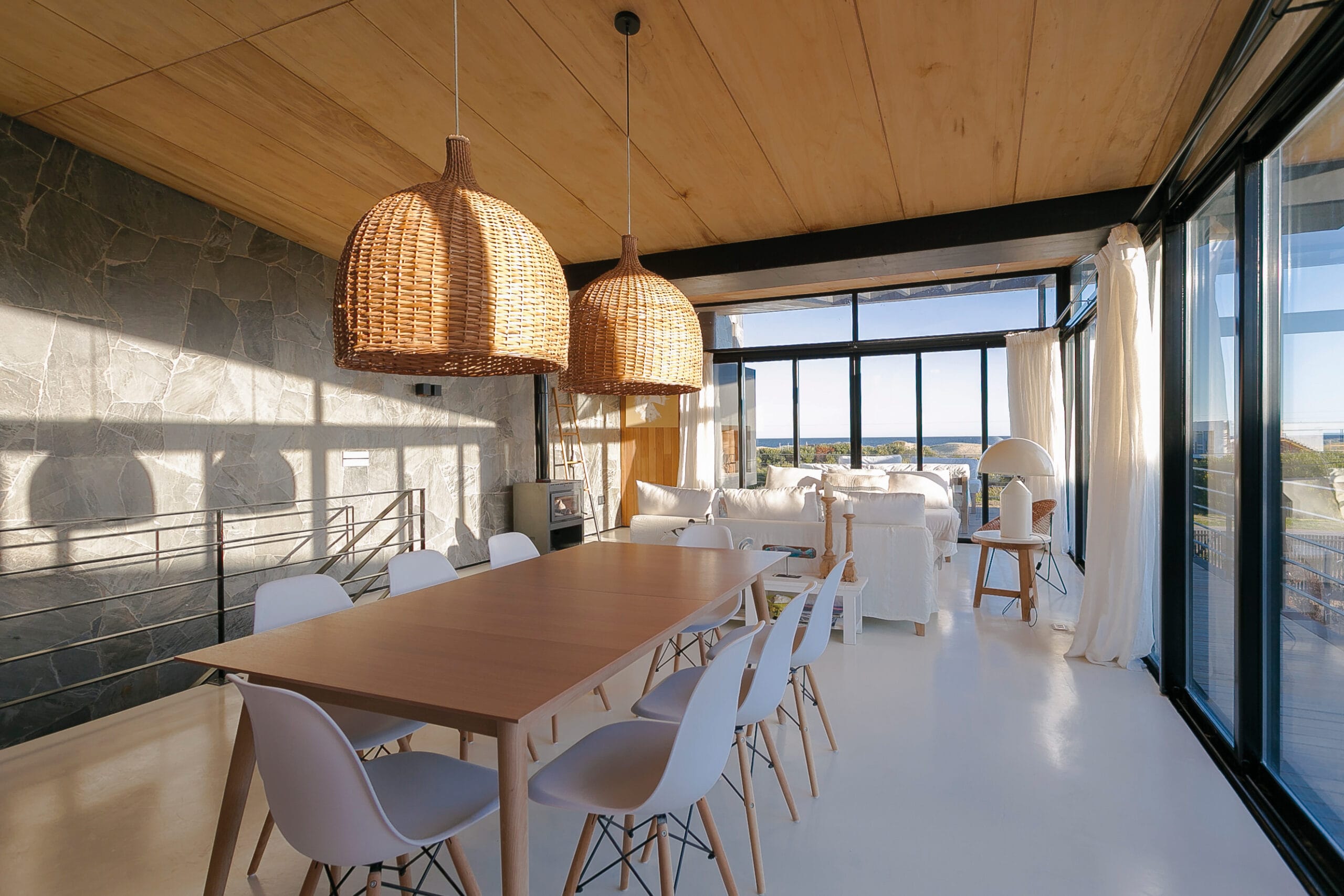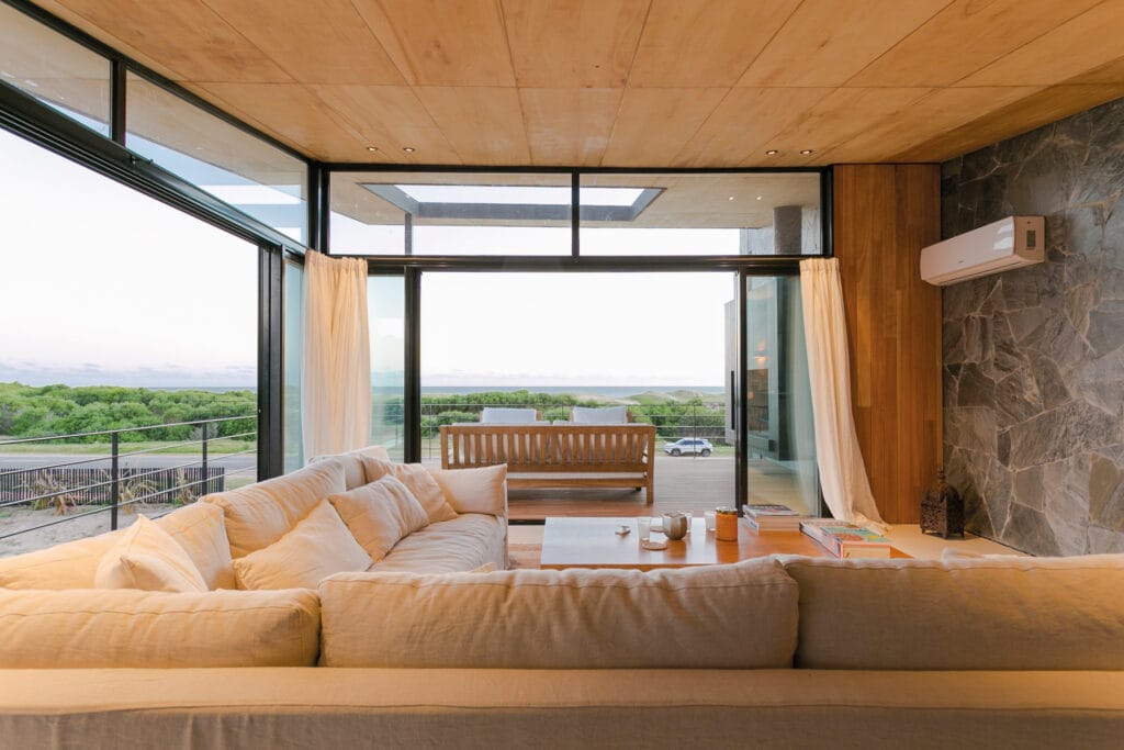 Los livings se ubican en la planta alta mirando hacia el mar, los dormitorios se desarrollan linealmente en toda la planta baja cada uno de ellos con salidas al jardín.