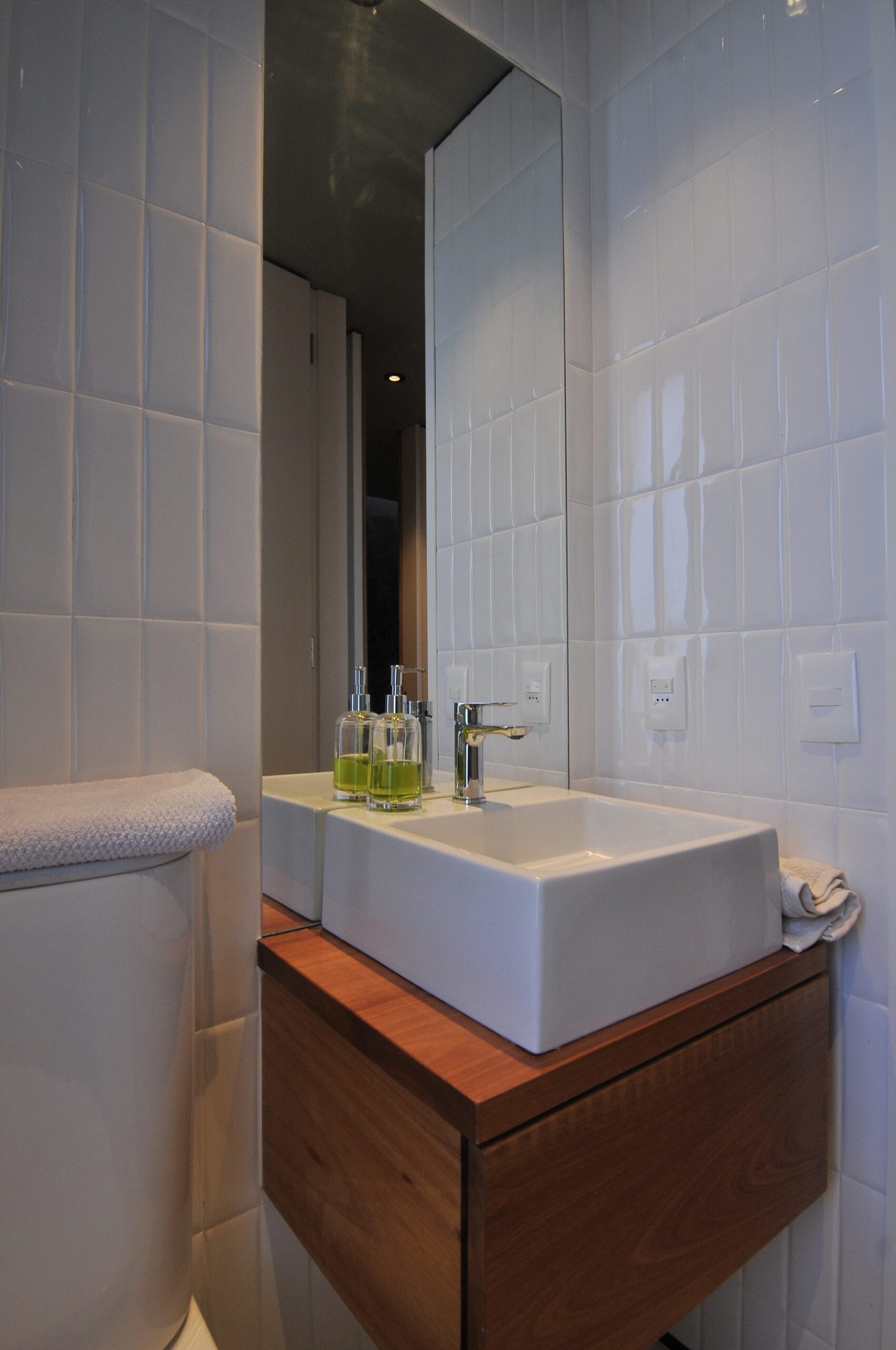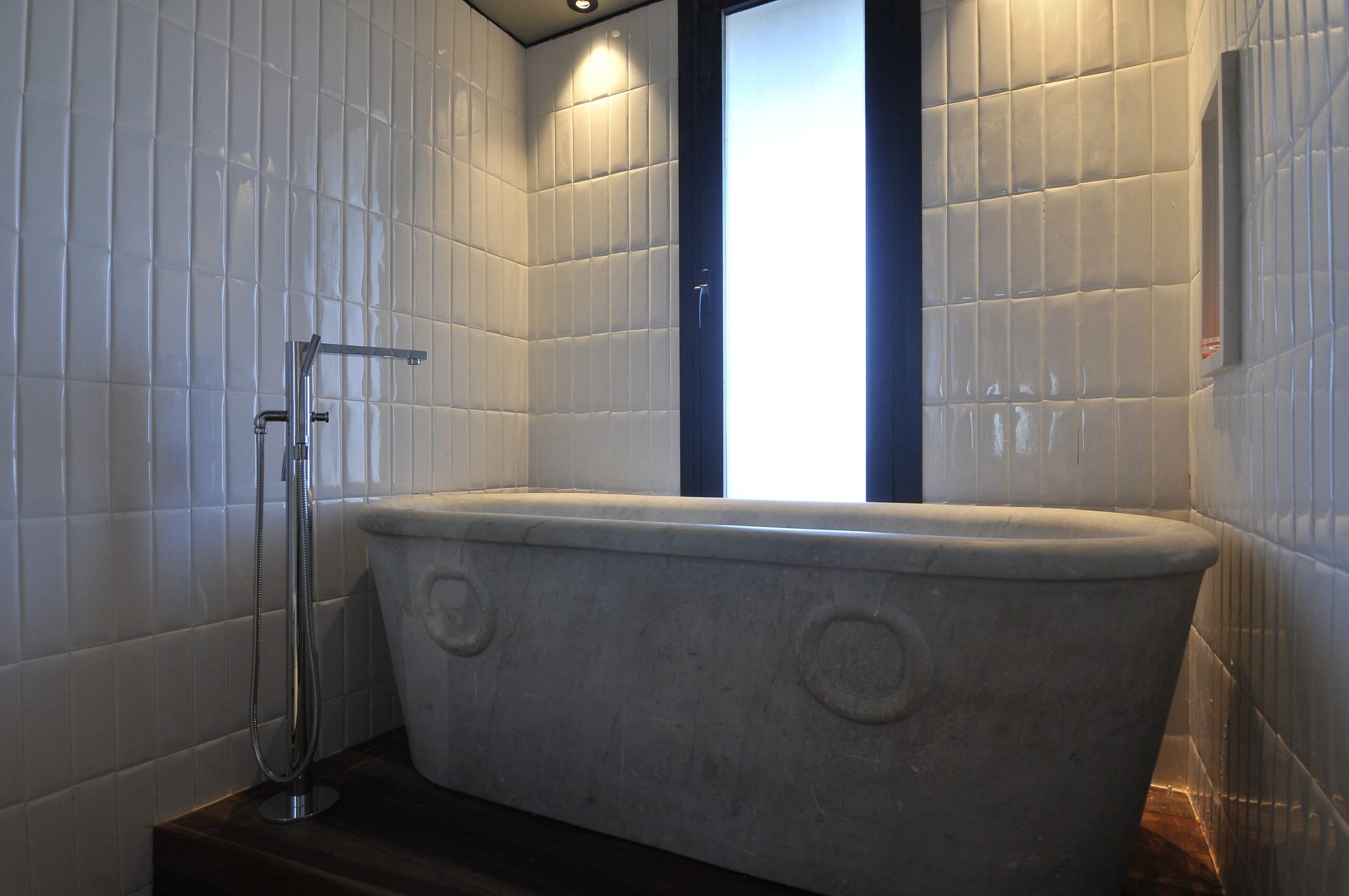 Los techos en “v” se expanden hacia el frente, amplias fajas rectangulares se abren en estos, los rayos del sol forman durante el día escenas de luces y sombras sobre las terrazas.