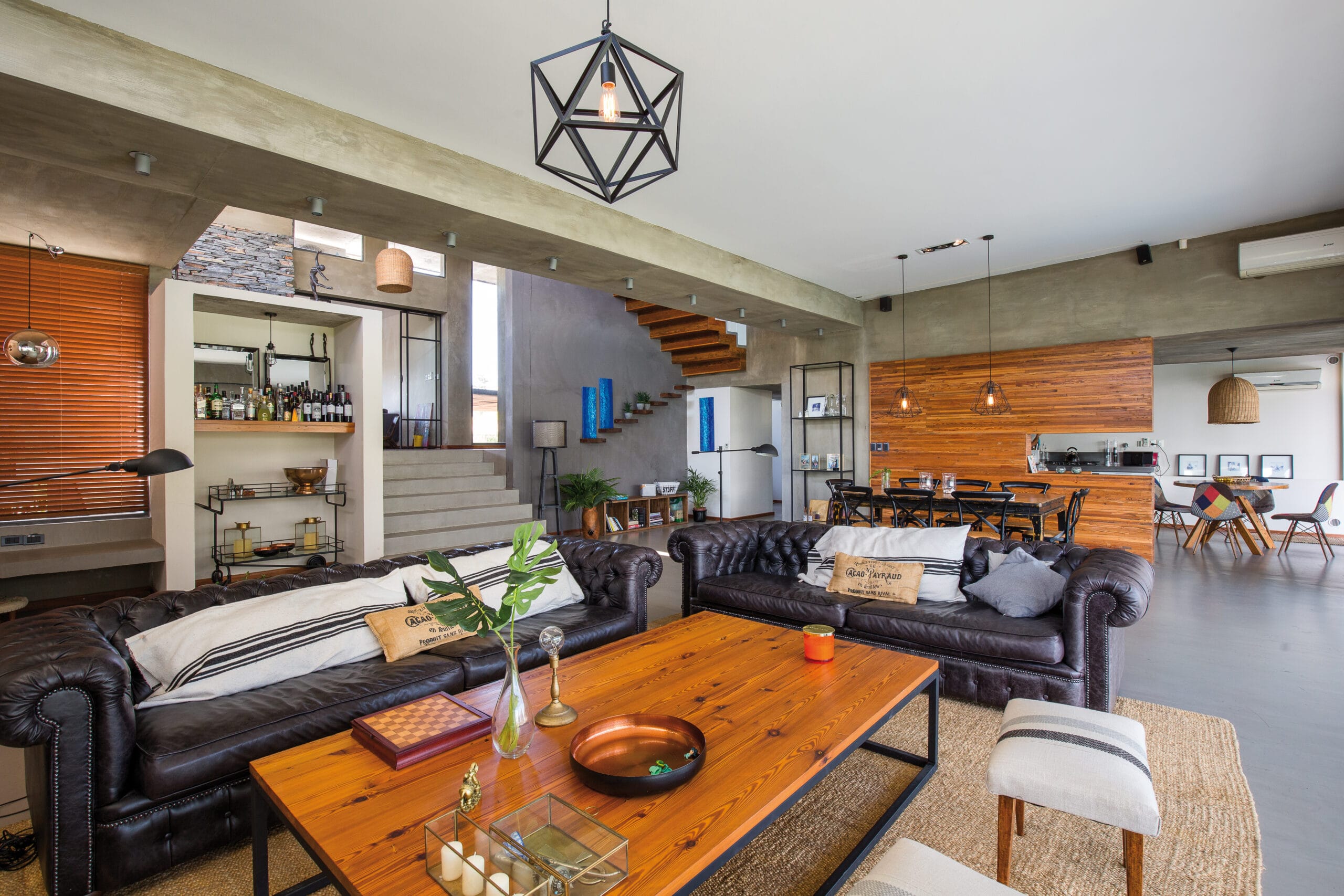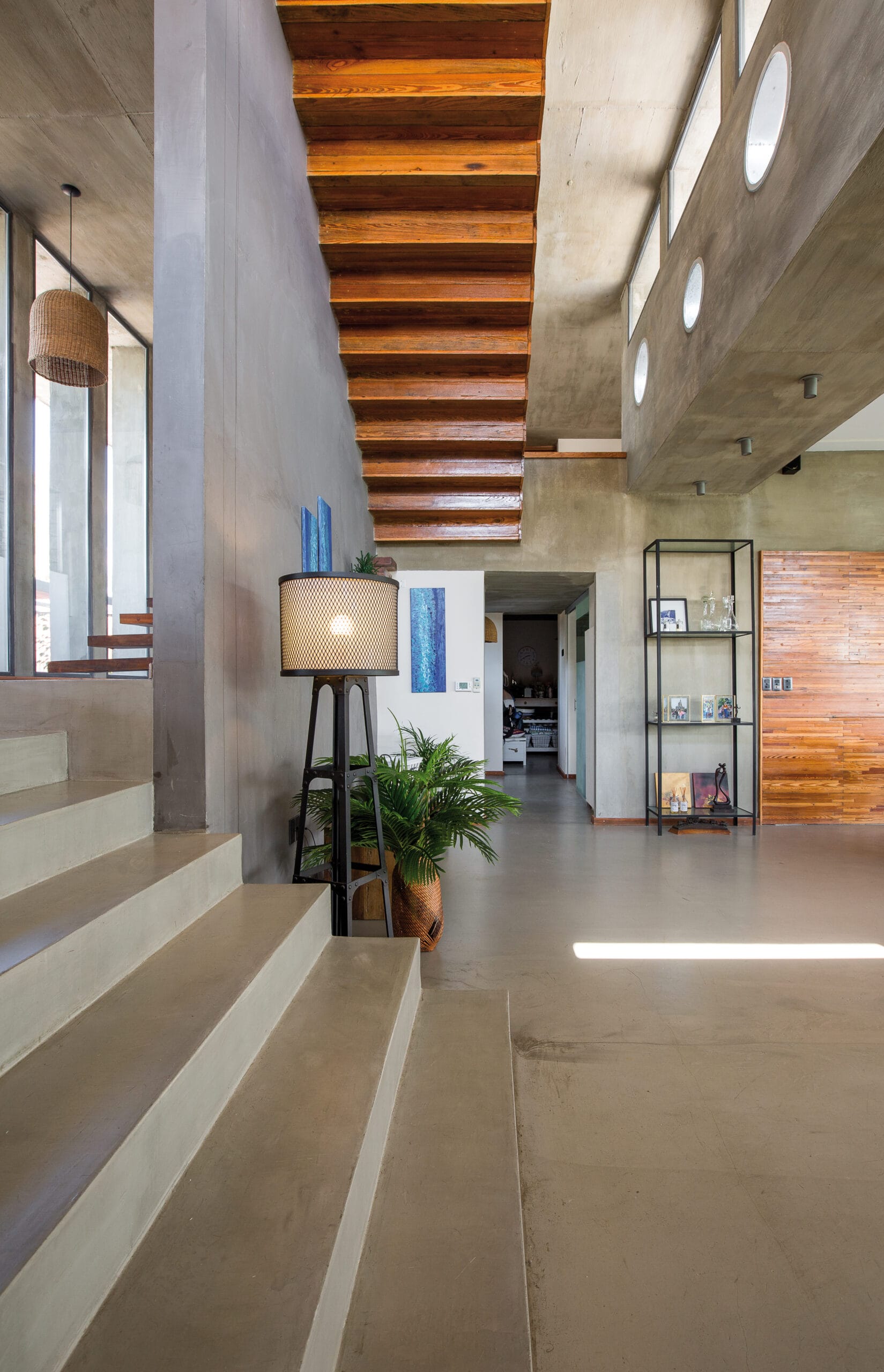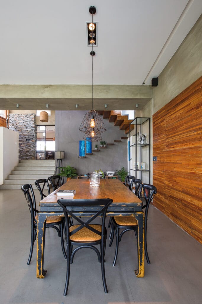 Hacia el interior los ambientes se desarrollan de forma amplia y despojada, lo que contribuye a la fluidez del espacio. Allí, el hormigón y la madera se combinan para dar una imagen limpia y serena. A través de los elementos de cerramientos, el exterior va permeando lentamente hasta lograr una vista amplia y profunda que remata en el lago.