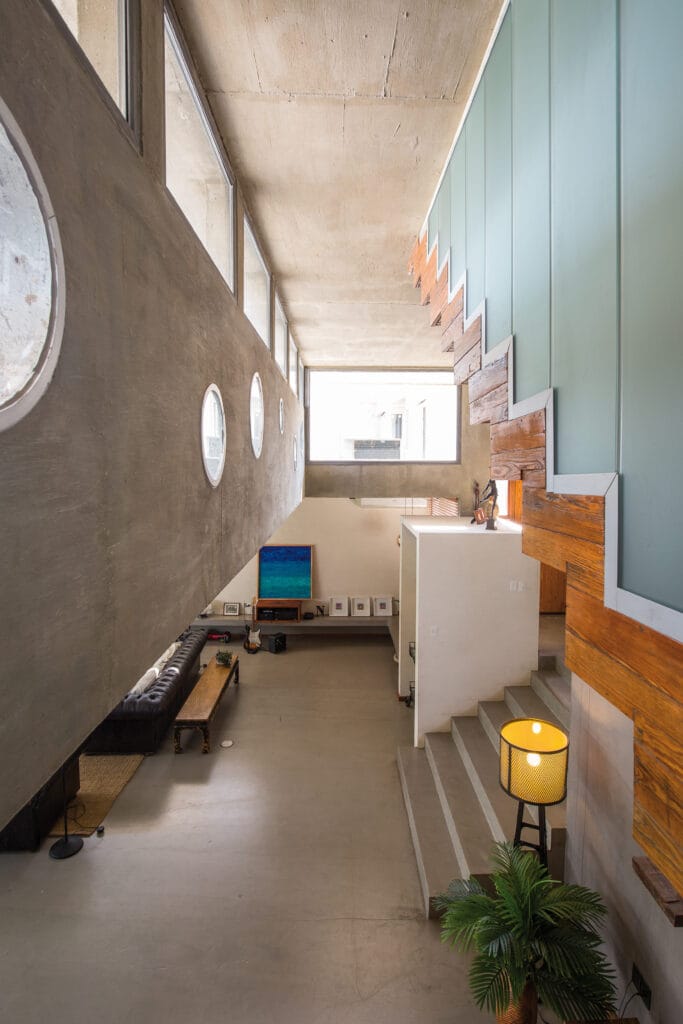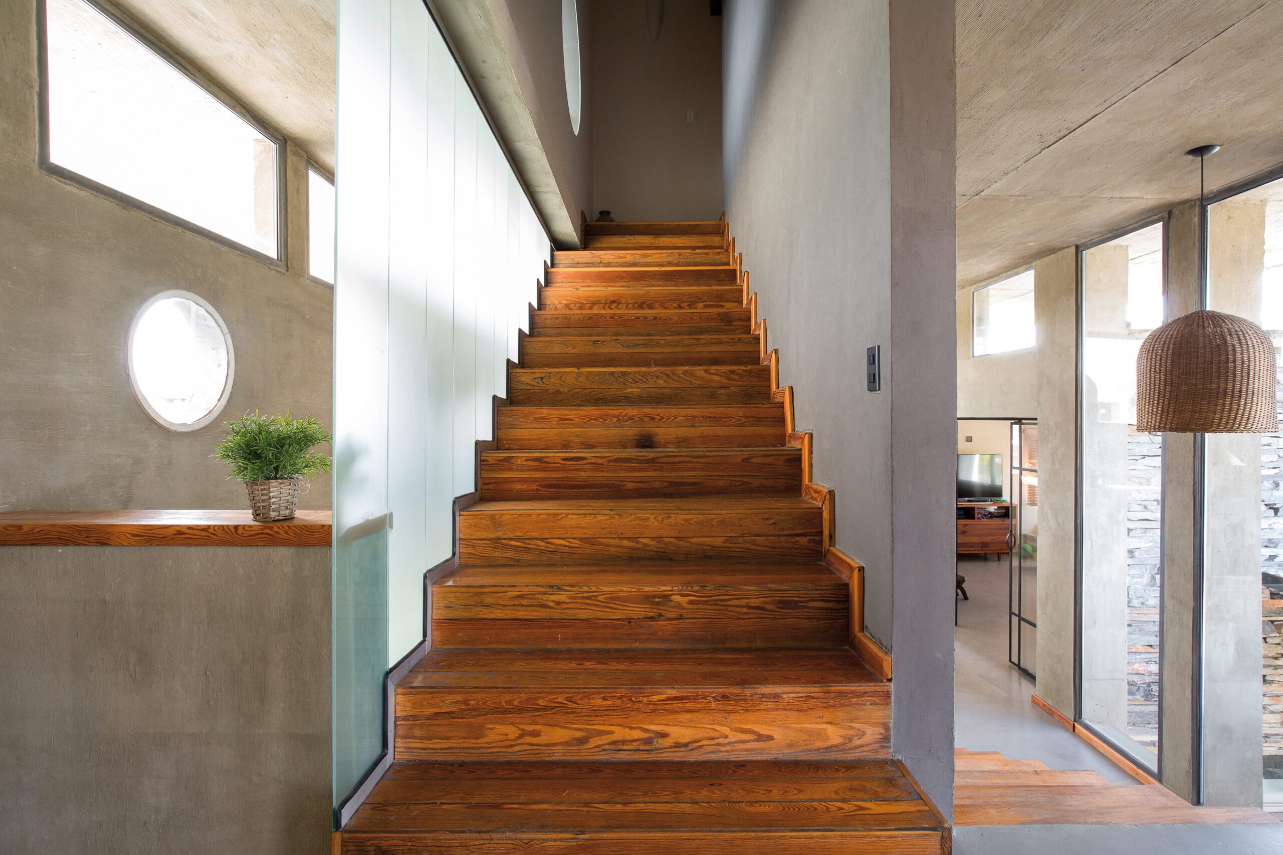 La casa utiliza alturas específicas para los diferentes espacios, lo que da origen a un dinámico intercambio de plantas que organiza los ambientes de acuerdo a su función. A lo externo, este sistema de niveles acentúa la propuesta volumétrica. Cada cuerpo utiliza materiales y texturas diferentes, apareciendo entonces piedras, revoques, maderas y hormigón, y tramando un diseño que yace en las proximidades de lo artístico. Hay en el uso de los materiales un original empleo de elementos geométricos que se plasma en el trazado de formas y planos, una característica que resulta ser muy propia en la obra de Scheweizer.