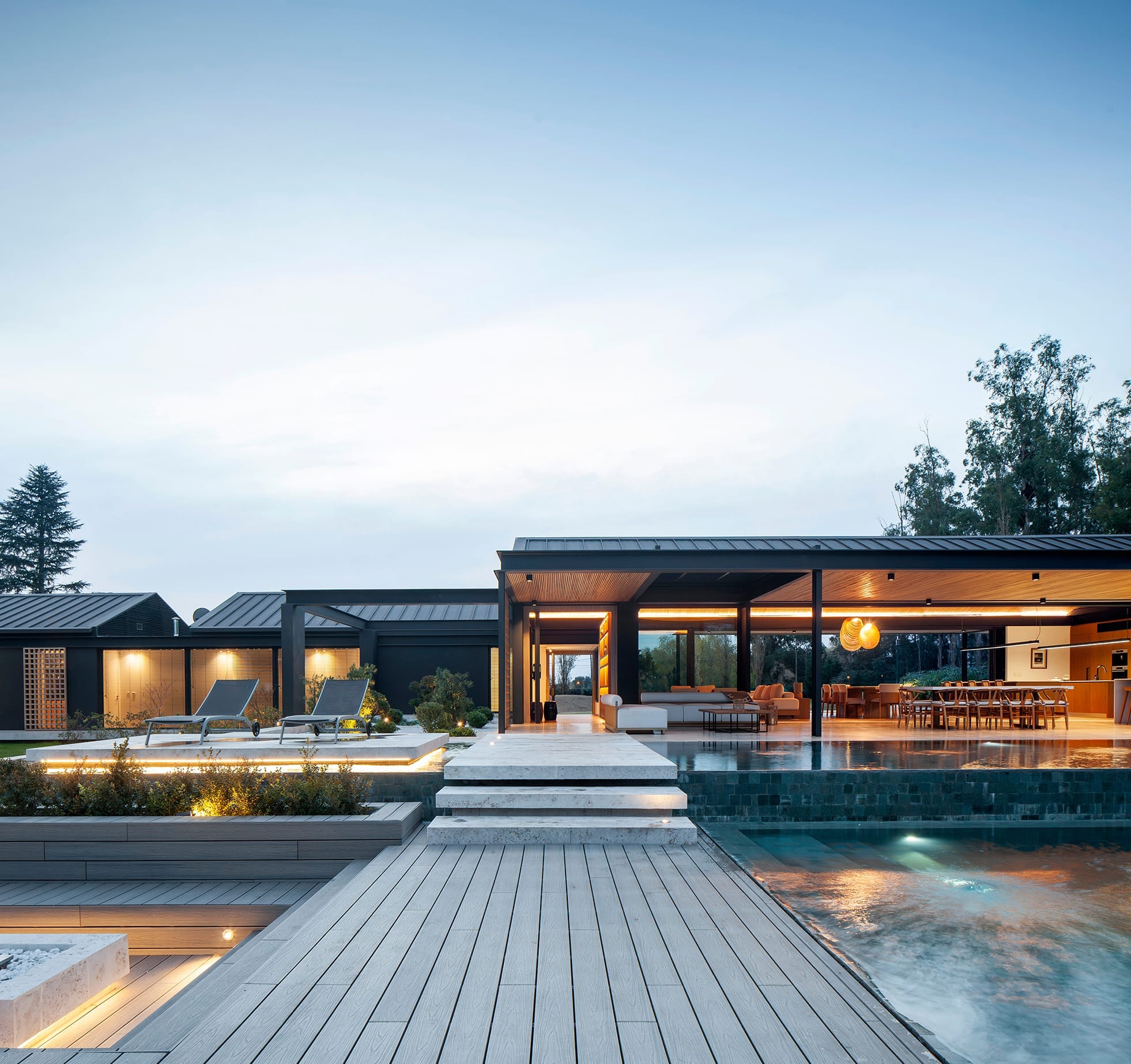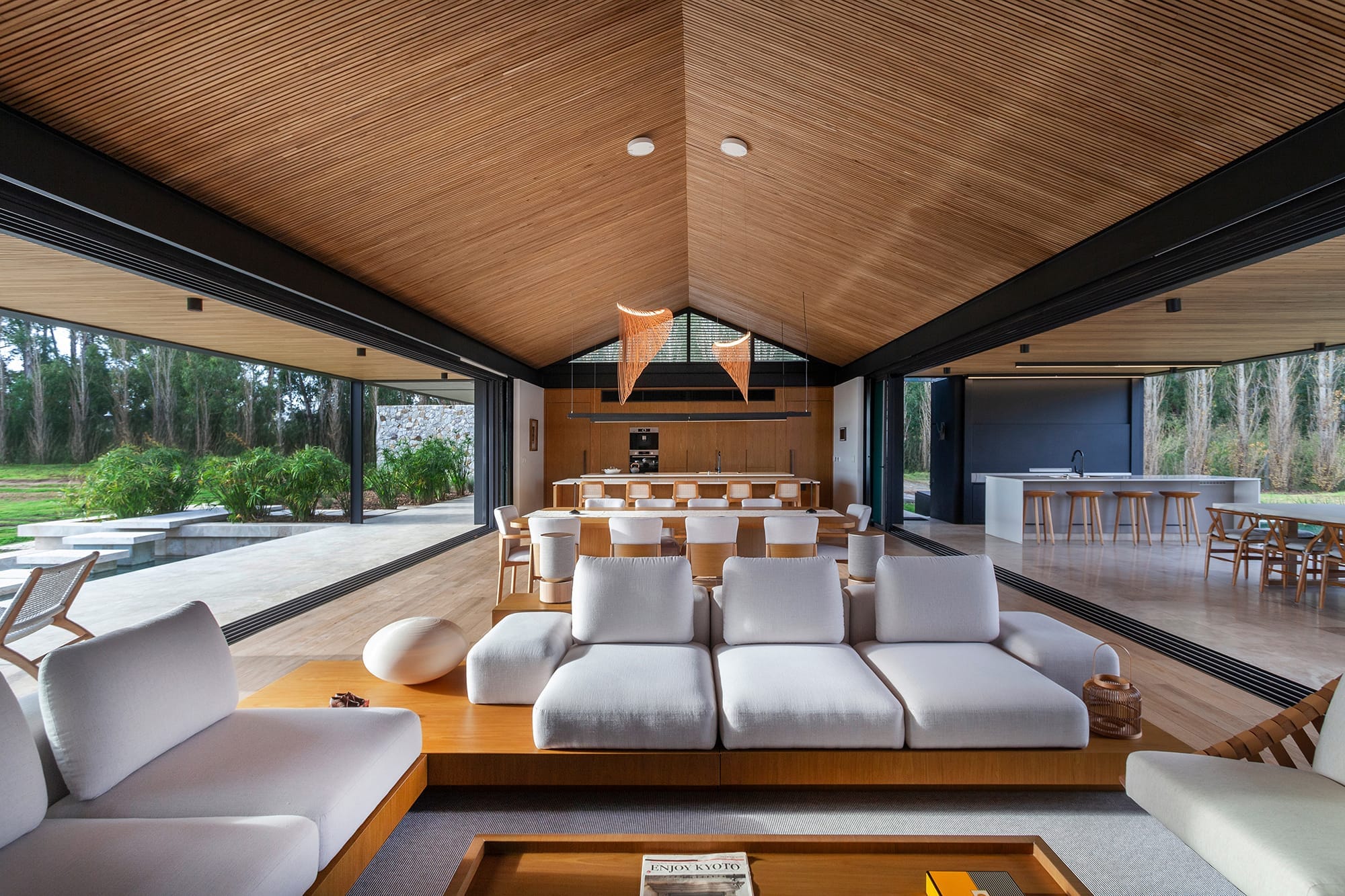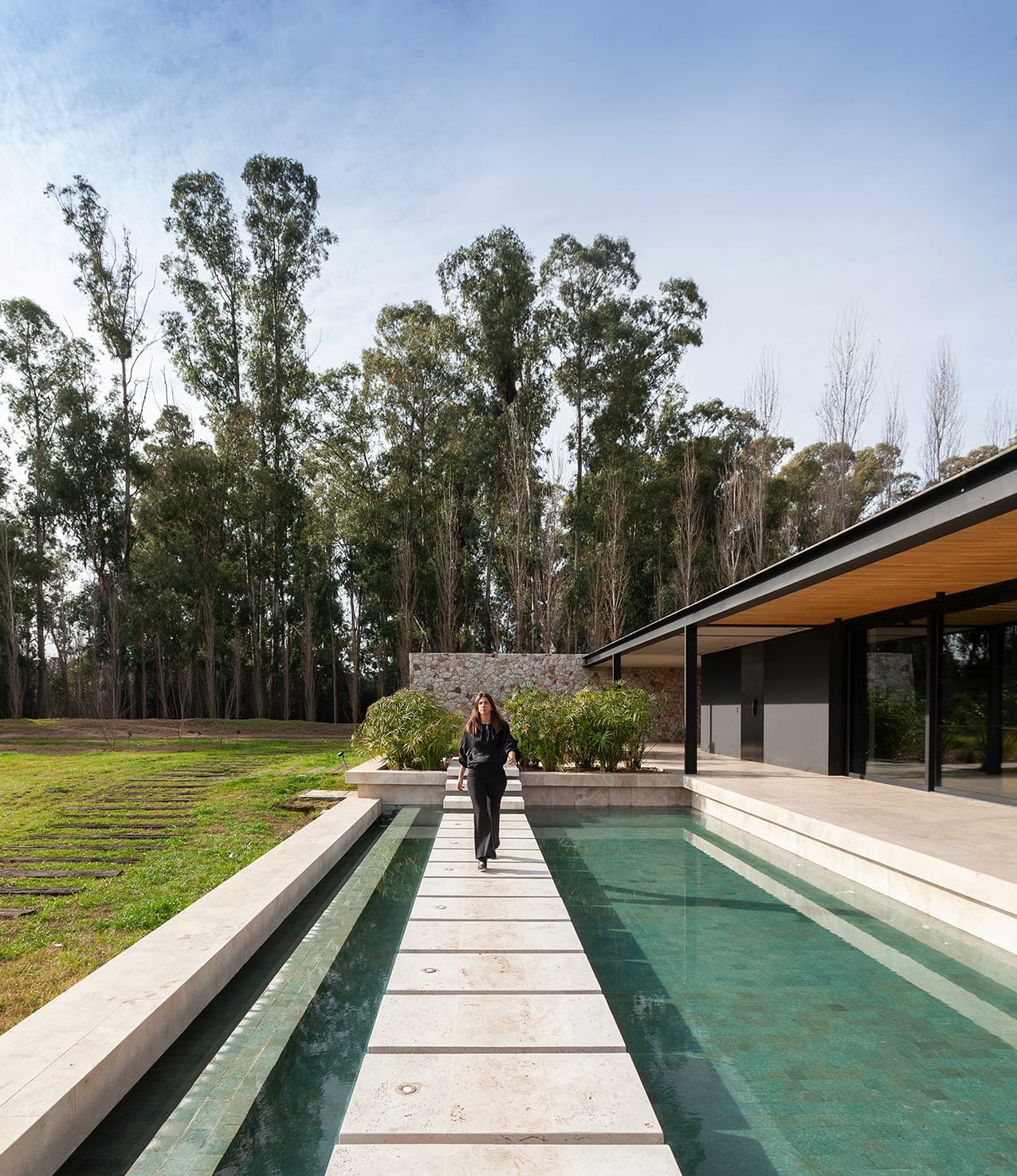 Es allí donde la utilización de paneles móviles y patios internos constituyeron un factor clave para generar juegos de luces y sombras, de espacios cerrados y abiertos, sumado a la utilización de gruesos muros de piedra para protegerla de los vientos. El programa está compuesto por un área pública principal, donde el cuarto de estar, comedor y cocina están acompañados por enormes aventanamientos que se desplazan y esconden dentro de muros que las contienen, logrando que ese espacio, rápidamente, se transforme en un semicubierto. En el sector sur, el más desfavorecido del sitio, se plantearon las áreas de servicio y accesos vehiculares. En cuanto al área privada, está compuesta por dos dormitorios amplios con vestidor y baño en suite, y culmina con el dormitorio principal donde el espacio de vestidor y baño son comunes para la pareja, pero no así el espacio de cama, dado que se plantearon dos dormitorios en espejo independientes. El agua que se aproxima al vagón central de la casa en ambos lados permite generar una sensación de libertad y amplitud con el entorno, lo que afirma aún más que es una casa que vive tanto del interior hacia el exterior como desde el exterior hacia el interior. Su transparencia controlada, combinada con el reflejo de las piscinas, genera sin duda esa sensación de infinito, como si uno estuviera parado en una orilla.