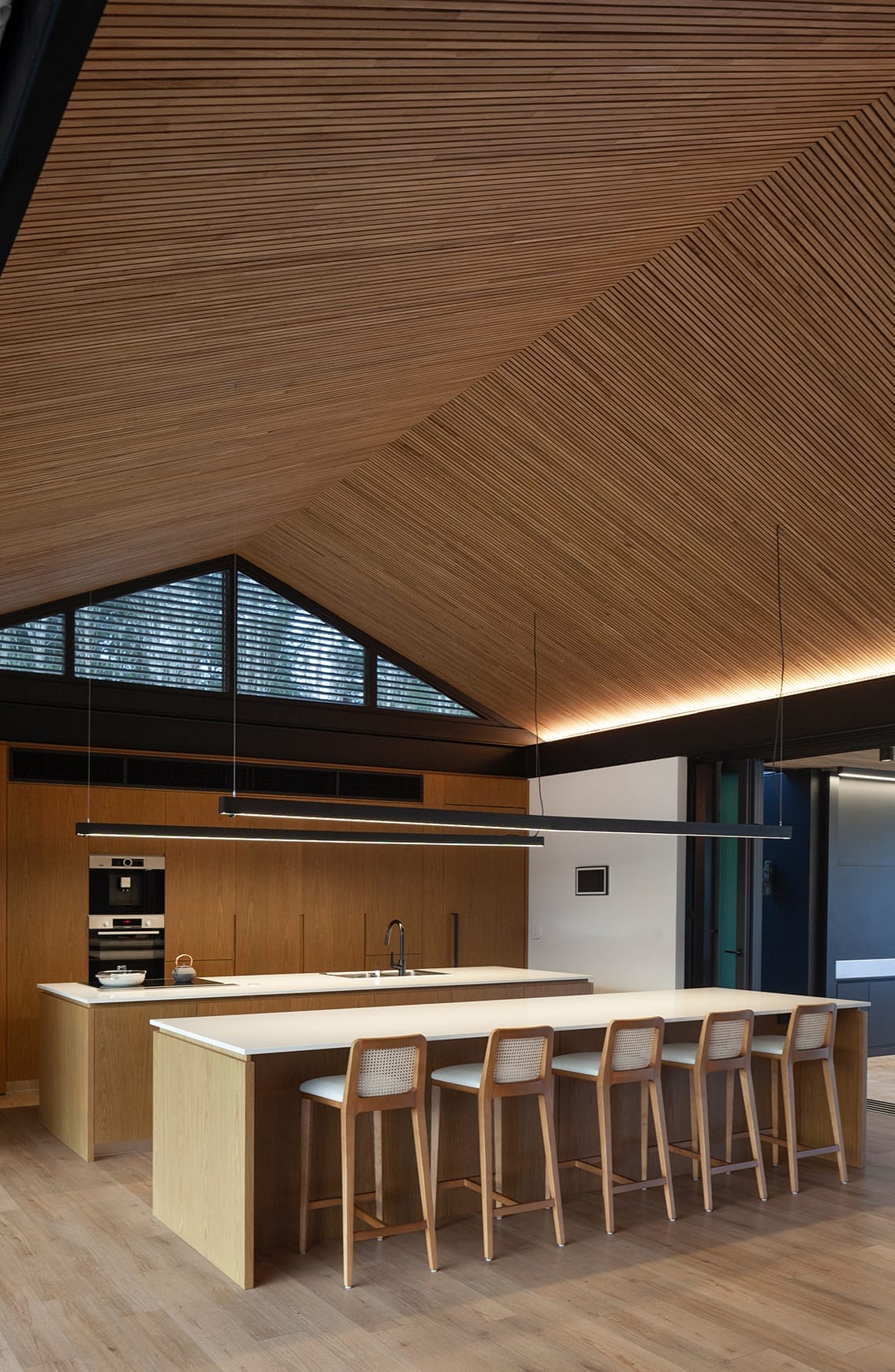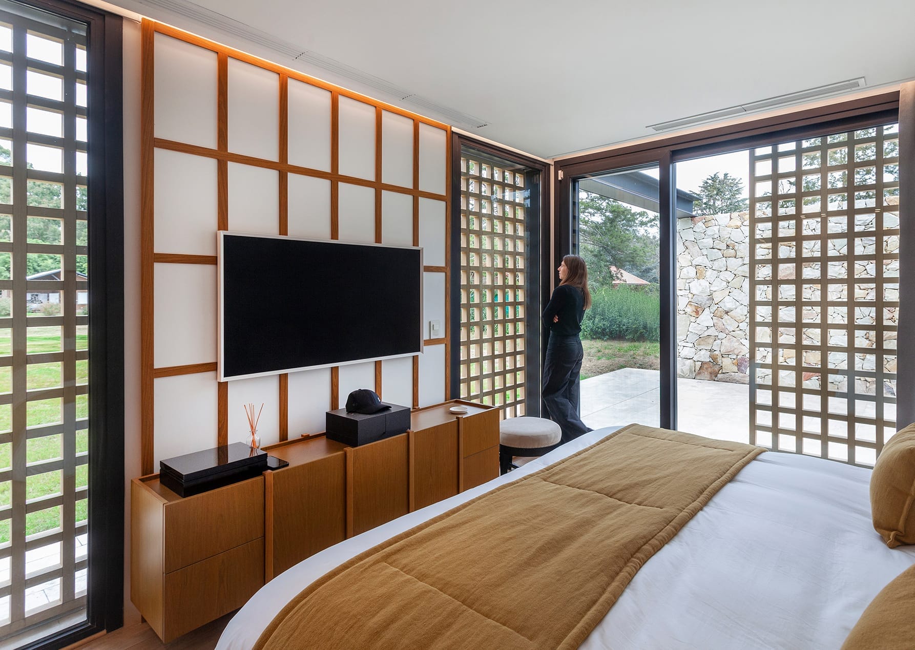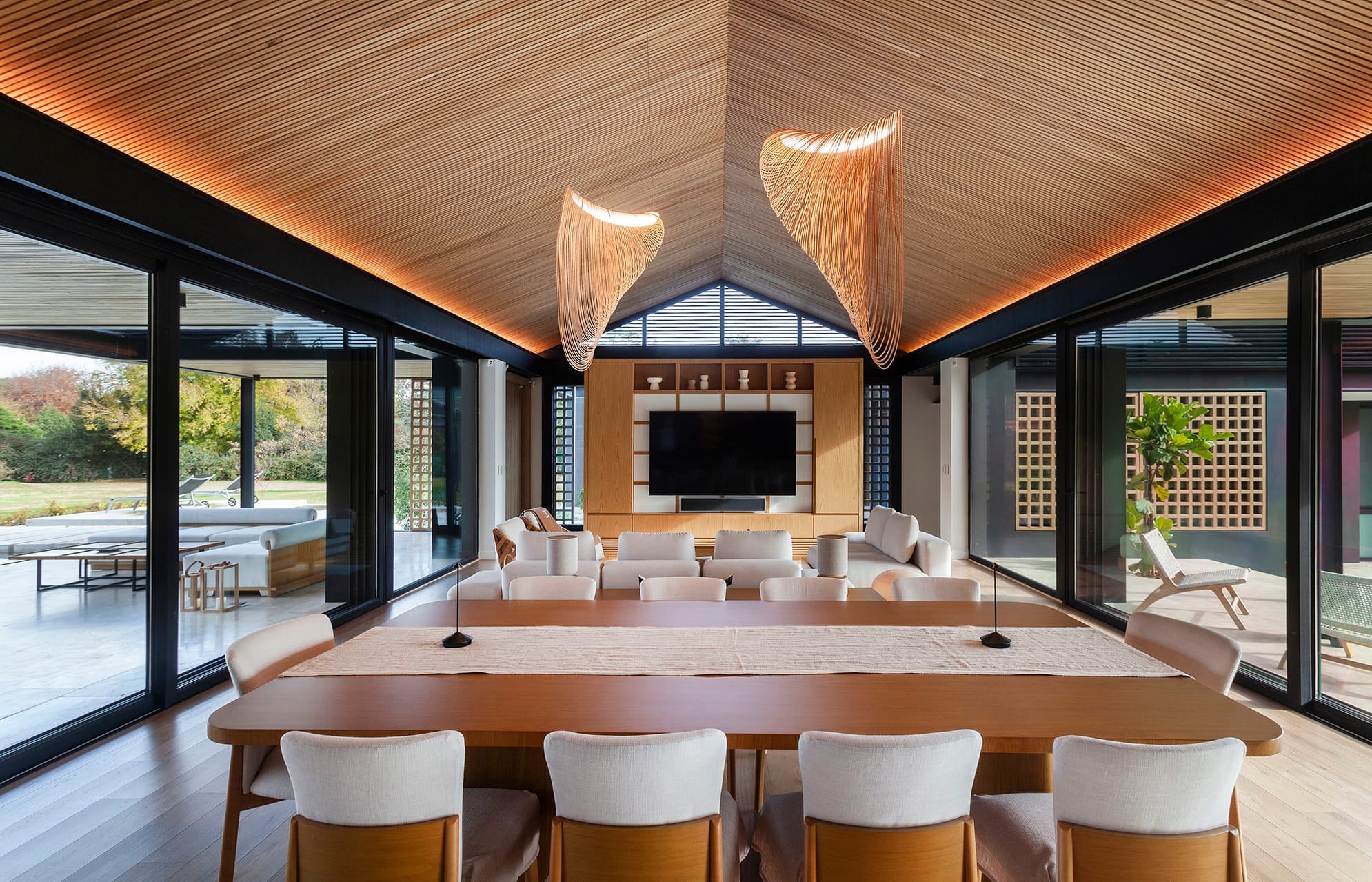 Es allí donde la utilización de paneles móviles y patios internos constituyeron un factor clave para generar juegos de luces y sombras, de espacios cerrados y abiertos, sumado a la utilización de gruesos muros de piedra para protegerla de los vientos. El programa está compuesto por un área pública principal, donde el cuarto de estar, comedor y cocina están acompañados por enormes aventanamientos que se desplazan y esconden dentro de muros que las contienen, logrando que ese espacio, rápidamente, se transforme en un semicubierto. En el sector sur, el más desfavorecido del sitio, se plantearon las áreas de servicio y accesos vehiculares. En cuanto al área privada, está compuesta por dos dormitorios amplios con vestidor y baño en suite, y culmina con el dormitorio principal donde el espacio de vestidor y baño son comunes para la pareja, pero no así el espacio de cama, dado que se plantearon dos dormitorios en espejo independientes. El agua que se aproxima al vagón central de la casa en ambos lados permite generar una sensación de libertad y amplitud con el entorno, lo que afirma aún más que es una casa que vive tanto del interior hacia el exterior como desde el exterior hacia el interior. Su transparencia controlada, combinada con el reflejo de las piscinas, genera sin duda esa sensación de infinito, como si uno estuviera parado en una orilla.