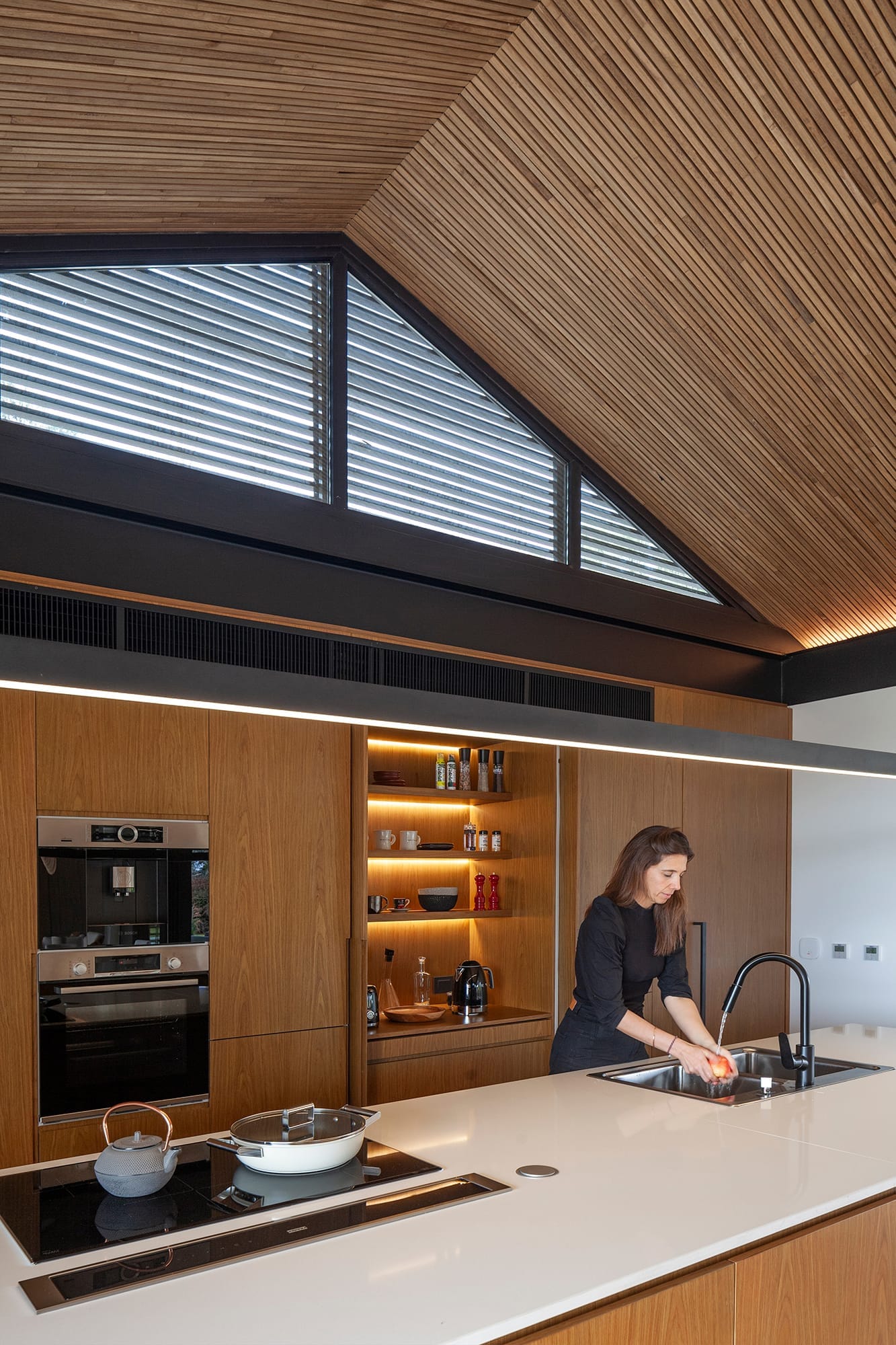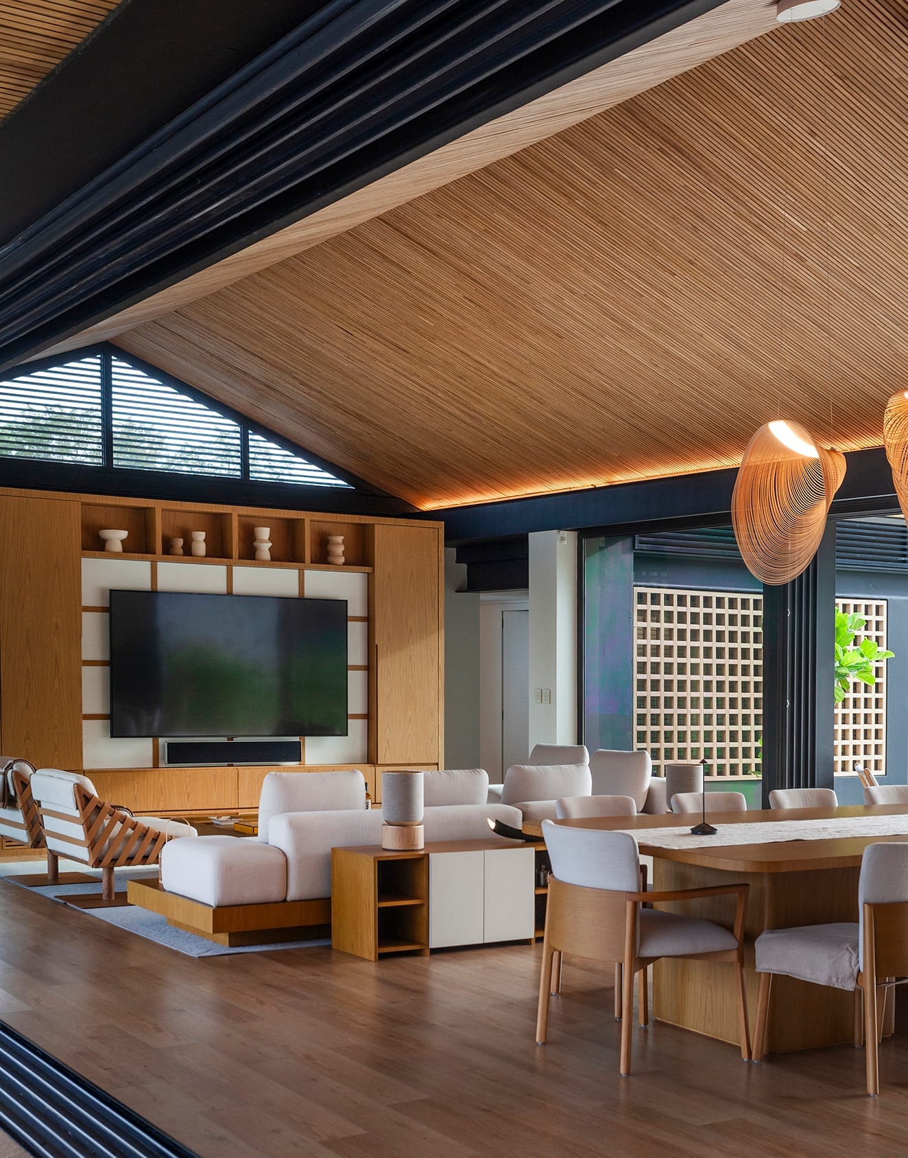 Desarrollada en una única planta en formato longitudinal, a través de dos bloques que se desafían y desplazan entre sí, la casa mantiene un punto de tensión particular donde se cruzan y diferencian las áreas privadas y públicas. Es allí donde los accesos principales de la casa se desarrollan y permiten una intersección de vías circulatorias claras para el recorrido de la casa. Orillas tiene dos vistas frontales, dado que se accede, se expande y se vive desde ambas fachadas longitudinales. Estas, constituidas por cubiertas inclinadas, fueron diseñadas con el objetivo de respetar el sitio y dialogar de la mejor forma con las construcciones adyacentes que marcan un precedente y estilo claro. Para su materialización, se añadió el factor de la naturaleza al formar la paleta de colores: una cáscara negra, envuelta por una serie de parasoles de madera y muros de piedra. El estudio del asoleamiento y la ubicación en el sitio fueron claves para el planteo de partido de la casa. Se deseaba una casa que se viviera de manera 360 grados, y que durante todas las estaciones del año que Buenos Aires ofrece, pudiera ser disfrutada desde todos los sectores.