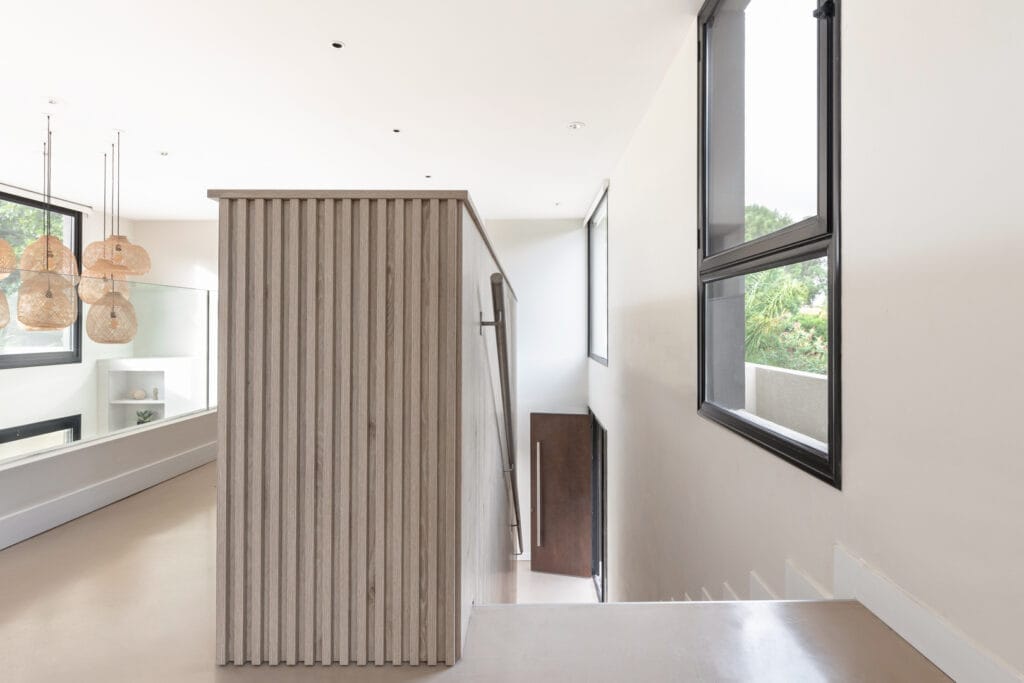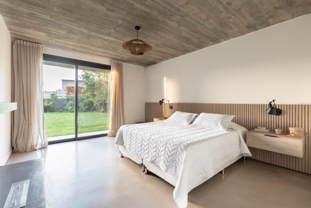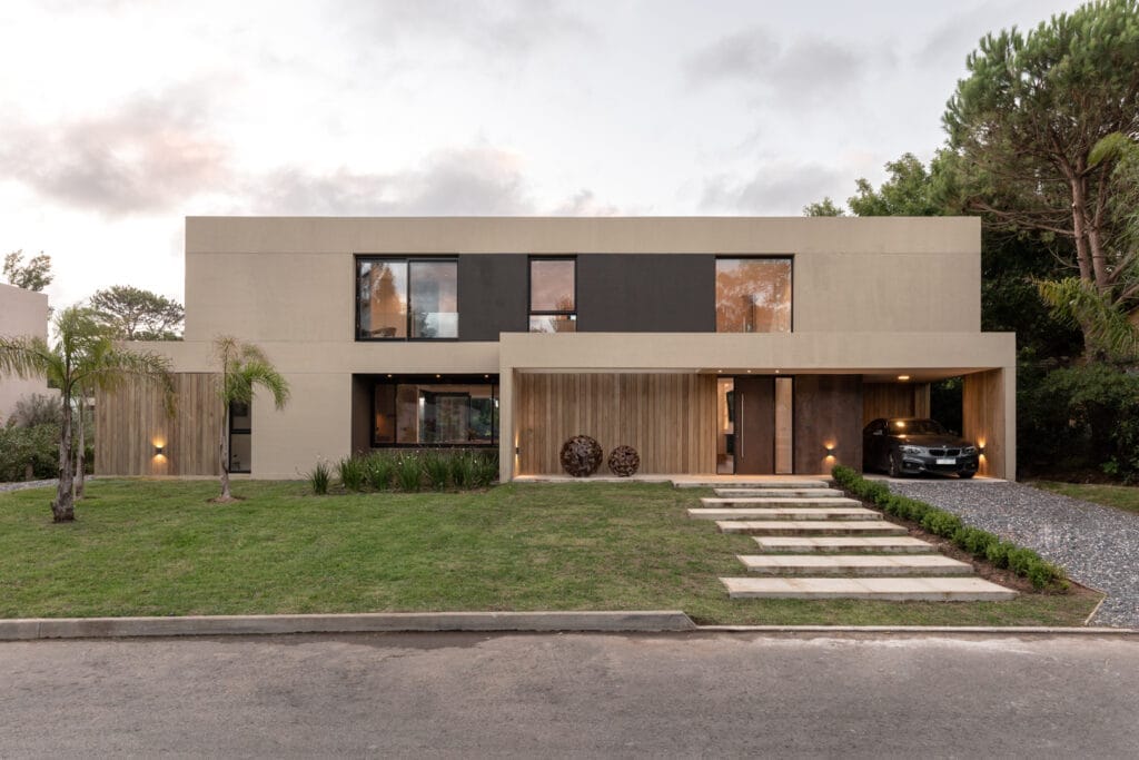 La casa-puente vincula los aspectos clásicos de la arquitectura como el espacio y la forma con los aspectos funcionales de la vivienda contemporánea. Es así que se plasmaron intenciones espaciales como el puente, la doble altura, la relación exterior/ interior con intenciones funcionales y de representación como el aprovechamiento máximo del frente del terreno, la búsqueda de impacto visual del volumen en el predio, la planta abierta que permita el uso todo el año y la integración de espacios exteriores. La casa se estructura en bandas horizontales independientes que refuerzan el carácter extendido y descansado de la casa sobre el predio, generando espacios en los distintos escalonamientos de fachadas. Los vanos y los revestimientos hacen el contrapunto como elementos de fuerte verticalidad. El proyecto se plantea abierto hacia el sol del norte que da por el fondo, vinculando los espacios Living comedor y cocina integrados de la planta baja con el jardín exterior a través del espacio intermedio de galería pergolada. Los espacios exteriores son proyecciones