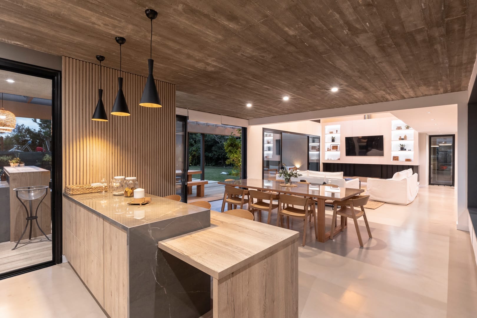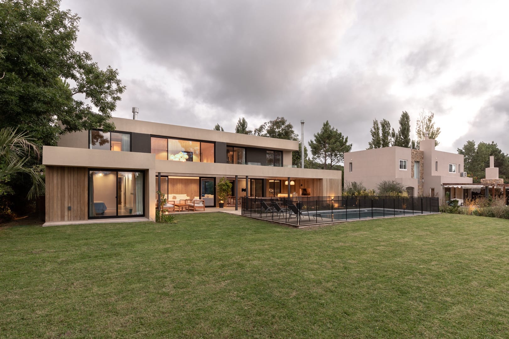 La casa-puente vincula los aspectos clásicos de la arquitectura como el espacio y la forma con los aspectos funcionales de la vivienda contemporánea. Es así que se plasmaron intenciones espaciales como el puente, la doble altura, la relación exterior/ interior con intenciones funcionales y de representación como el aprovechamiento máximo del frente del terreno, la búsqueda de impacto visual del volumen en el predio, la planta abierta que permita el uso todo el año y la integración de espacios exteriores. La casa se estructura en bandas horizontales independientes que refuerzan el carácter extendido y descansado de la casa sobre el predio, generando espacios en los distintos escalonamientos de fachadas. Los vanos y los revestimientos hacen el contrapunto como elementos de fuerte verticalidad. El proyecto se plantea abierto hacia el sol del norte que da por el fondo, vinculando los espacios Living comedor y cocina integrados de la planta baja con el jardín exterior a través del espacio intermedio de galería pergolada. Los espacios exteriores son proyecciones