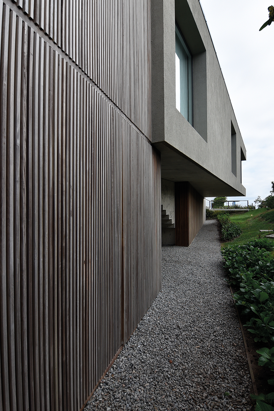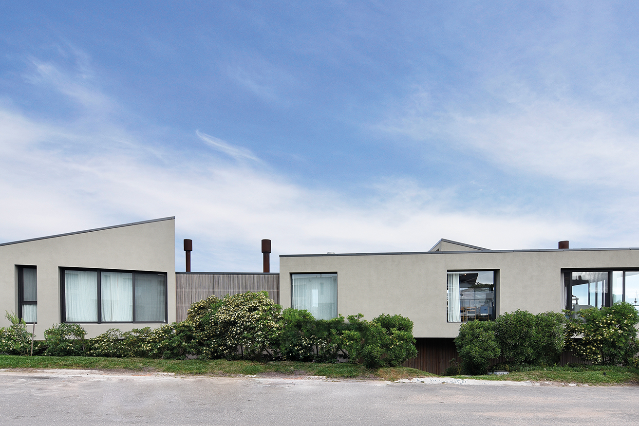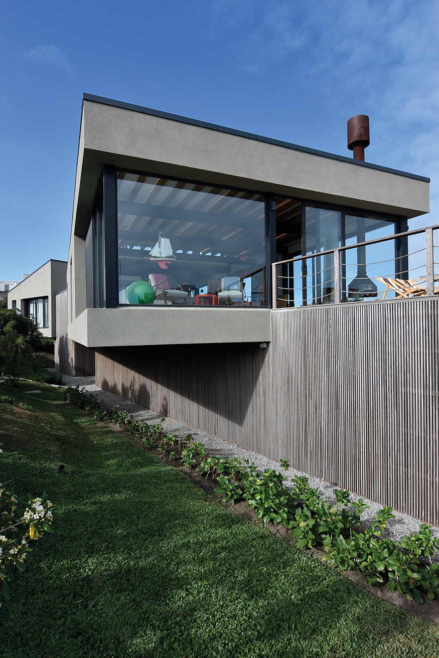 La casa se levanta sobre un predio de singulares características, ubicado en segunda línea sobre una de las pendientes que la península genera en la playa del Faro, en José Ignacio. Largo y angosto, con un pronunciado frente hacia la calle y lindero con otro terreno de iguales características, la implantación resuelta por Candida, orientando los volúmenes proyectados hacia la costa, lo convirtieron en algo bastante parecido a una esquina ochavada. Nuestra primera visión es un conjunto de volúmenes que se destacan entre sí desde distintos ángulos de la implantación, interconectados internamente. El volumen del piso superior se desplaza del volumen inferior generando una punta en voladizo que provoca un hecho estético que da como resultado dos volúmenes diferenciados y bien definidos, este tramo continúa con pocas aberturas debido a la necesidad de preservar la intimidad de los habitantes. Una red de encuentros toca el siguiente volumen desde un ángulo recto, el único volumen en el pavimento paralelo superior al pavimento inferior, ésta revestido en reglas de madera de lapacho, que a su vez toca el volumen siguiente, este retorcido en su ángulo que se orienta hacia el faro de José Ignacio en su eje completo.