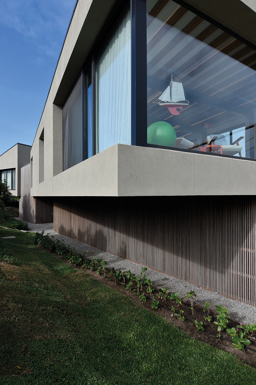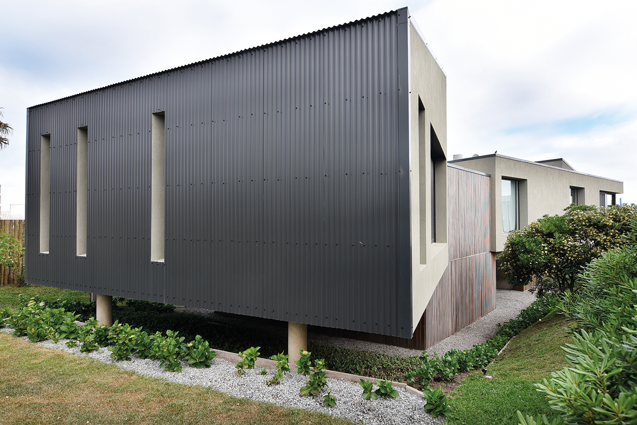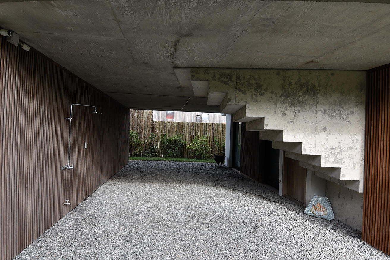 La casa se levanta sobre un predio de singulares características, ubicado en segunda línea sobre una de las pendientes que la península genera en la playa del Faro, en José Ignacio. Largo y angosto, con un pronunciado frente hacia la calle y lindero con otro terreno de iguales características, la implantación resuelta por Candida, orientando los volúmenes proyectados hacia la costa, lo convirtieron en algo bastante parecido a una esquina ochavada. Nuestra primera visión es un conjunto de volúmenes que se destacan entre sí desde distintos ángulos de la implantación, interconectados internamente. El volumen del piso superior se desplaza del volumen inferior generando una punta en voladizo que provoca un hecho estético que da como resultado dos volúmenes diferenciados y bien definidos, este tramo continúa con pocas aberturas debido a la necesidad de preservar la intimidad de los habitantes. Una red de encuentros toca el siguiente volumen desde un ángulo recto, el único volumen en el pavimento paralelo superior al pavimento inferior, ésta revestido en reglas de madera de lapacho, que a su vez toca el volumen siguiente, este retorcido en su ángulo que se orienta hacia el faro de José Ignacio en su eje completo.