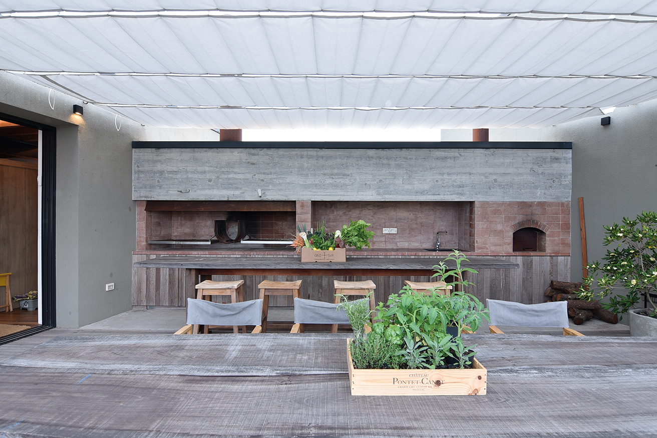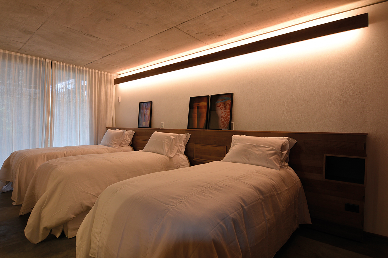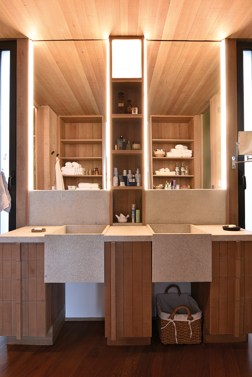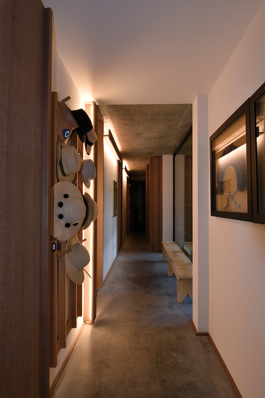 La planta baja, a nivel de calle, es toda de hormigón. Las paredes interiores se revistieron con listones de madera de eucaliptus grandis de reforestación, textura que también se utilizó en las cabeceras de todas las camas, para revestir los nichos, en la singular iluminación aérea diseñada especialmente para la casa, y en la carpintería general. Los pavimentos fueron revestidos en lapacho, salvo en la cocina, donde por razones higiénicas y prácticas se empleó cemento alisado. La elección del equipamiento quedó a cargo de la dueña de casa, que con mucho gusto y gracia, participó activamente del proceso de la obra, lo que se nota claramente al verificar la plena y total armonía que transmite la atmósfera lograda por Cándida que en este proyecto contó con la colaboración del Arquitecto Santiago Fernandez.