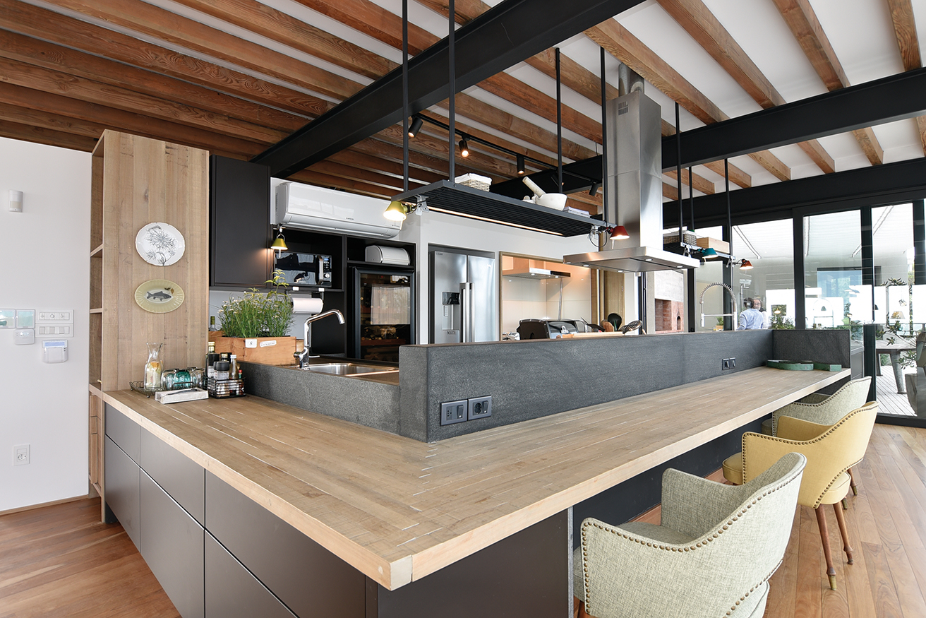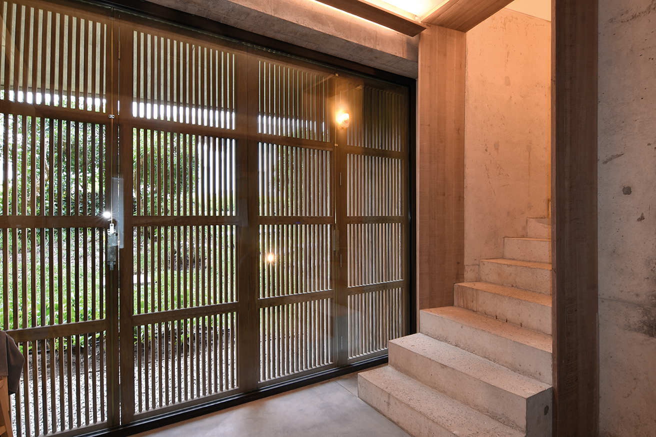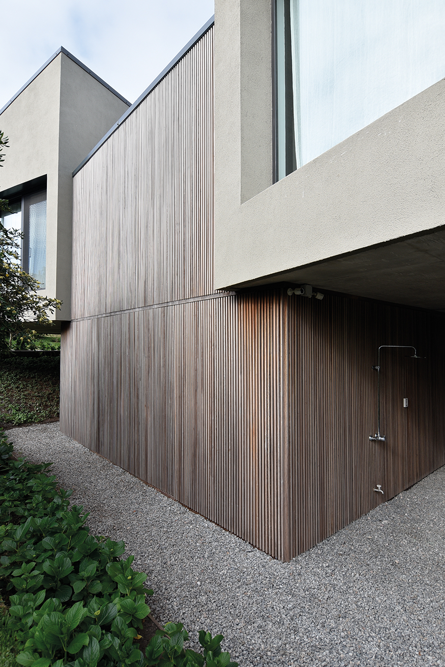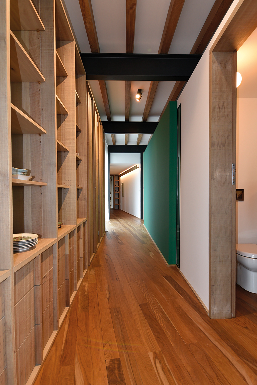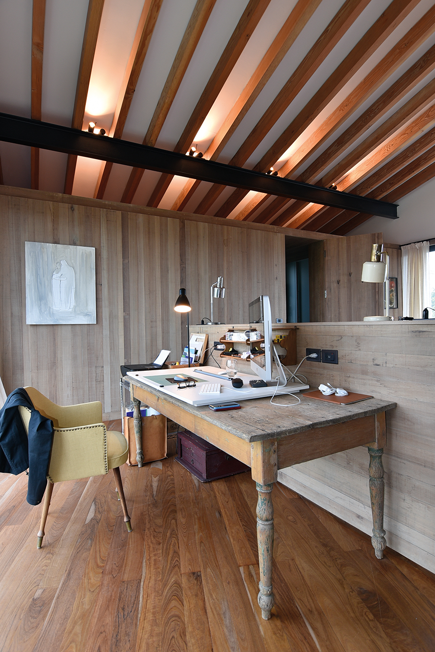 La planta baja, a nivel de calle, es toda de hormigón. Las paredes interiores se revistieron con listones de madera de eucaliptus grandis de reforestación, textura que también se utilizó en las cabeceras de todas las camas, para revestir los nichos, en la singular iluminación aérea diseñada especialmente para la casa, y en la carpintería general. Los pavimentos fueron revestidos en lapacho, salvo en la cocina, donde por razones higiénicas y prácticas se empleó cemento alisado. La elección del equipamiento quedó a cargo de la dueña de casa, que con mucho gusto y gracia, participó activamente del proceso de la obra, lo que se nota claramente al verificar la plena y total armonía que transmite la atmósfera lograda por Cándida que en este proyecto contó con la colaboración del Arquitecto Santiago Fernandez.