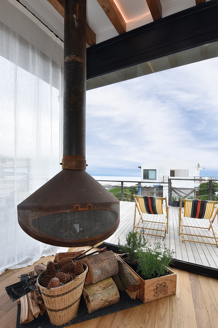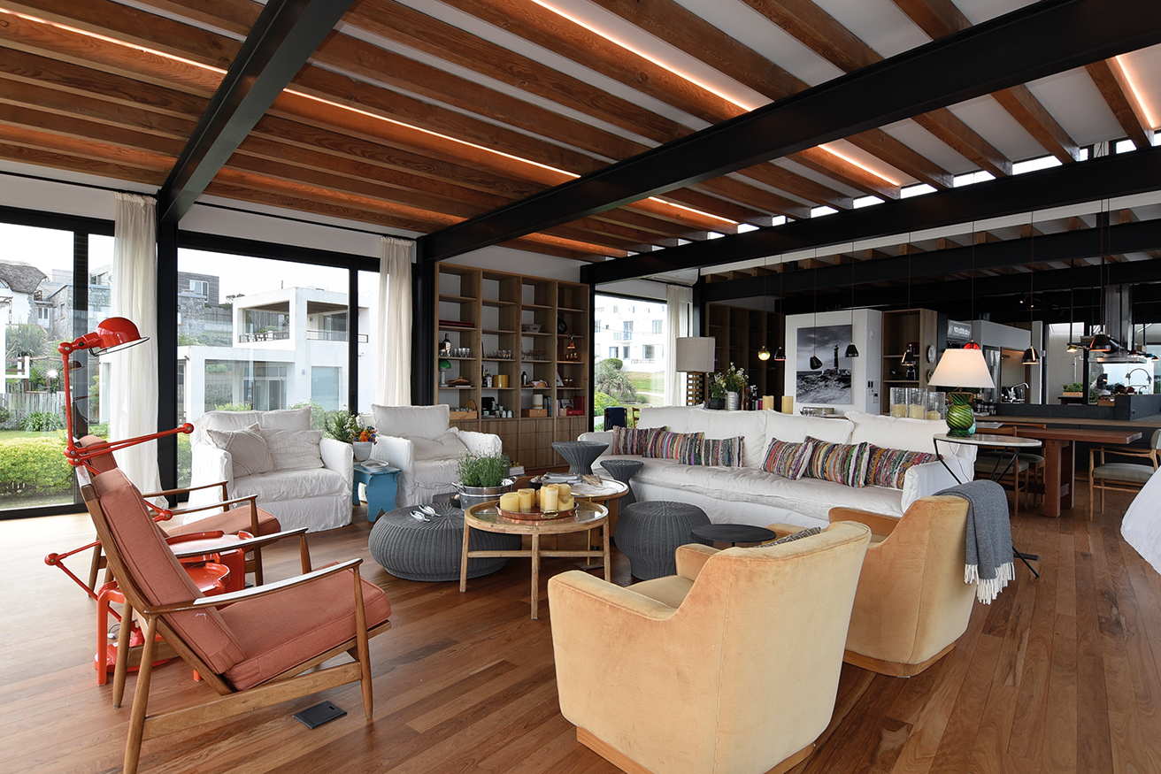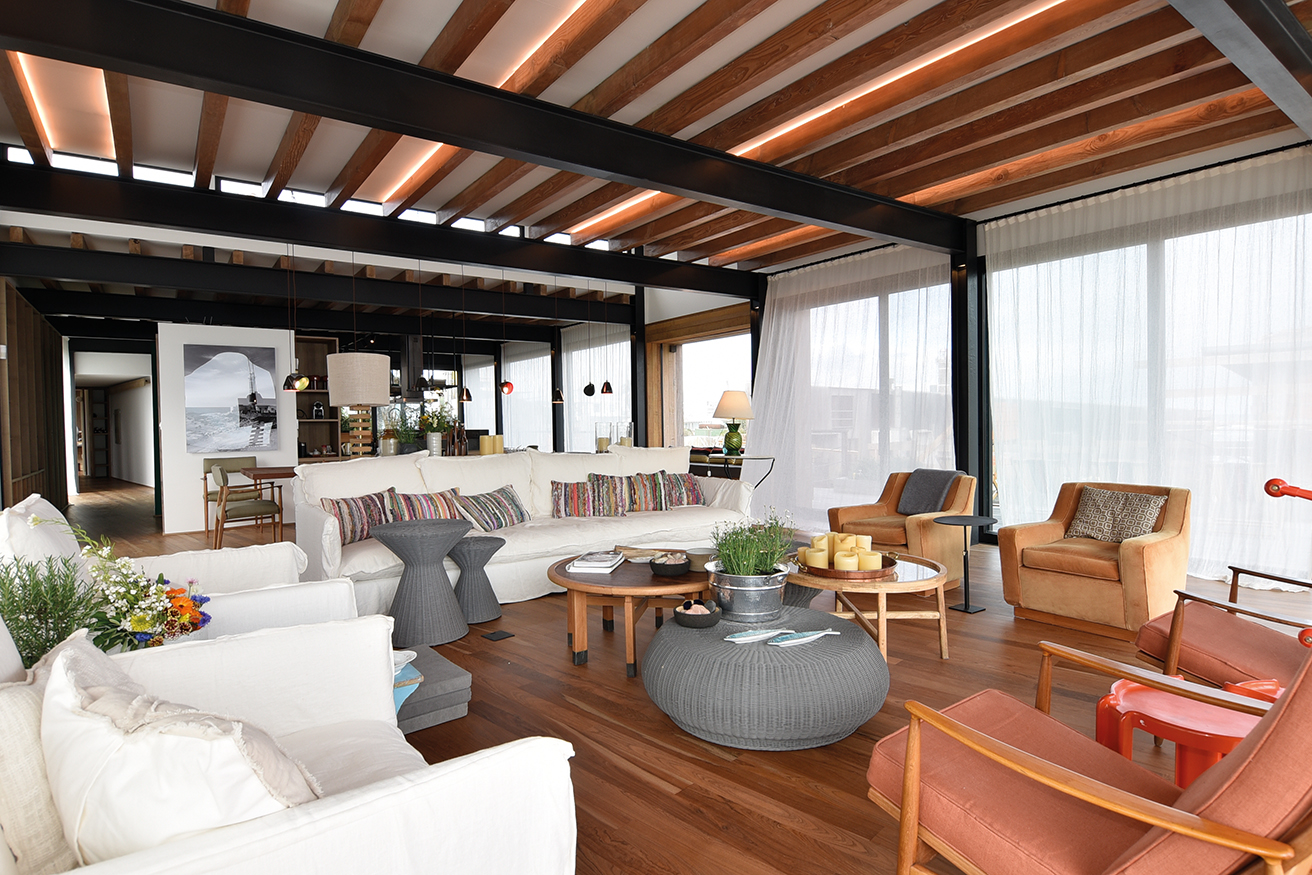 En la fachada opuesta tenemos una vista hacia el océano, luego la fachada está toda acristalada y enfrenta la mejor oportunidad para ver el mar. El desplazamiento del volumen de la planta alta sobre la losa de la planta baja también proporciona un deck de madera más amplio y cómodo, luego el deck gana proporciones y encontramos la cocina, la parrilla de concreto y ladrillo, un ambiente para recibir y compartir, siguiendo el volumen de la suite principal, acristalada en esta fachada, con vistas hacia el faro de José Ignacio. El piso inferior tiene las aberturas de las grandes ventanales de las suites de huéspedes que disfrutan del este y la vista hacia el mar. La distribución espacial es franca y sigue una lógica que se percibe armoniosa. En la planta alta se ubican las áreas sociales y en un ala, bien apartada, la suite principal. En el área social, abierta y despejada, la gran sala que se integra espacialmente al comedor y la cocina con mesada y toilette adjuntos, de manera práctica e integrada, junto a la cocina, de manera natural, el patio, el asador y horno de leña. En la planta baja se generaron tres suites para huéspedes, una sala de audio y video que también se convierte en dormitorio de ser necesario, un espacio vacío que contiene la escalera interna y una amplia gama de servicios. El proyecto de Candida se materializa con una estructura mixta que involucra madera, acero y hormigón, en el salón donde se exponen las estructuras vemos un conjunto de pórticos de acero y una subestructura de madera intercalada entre pórticos.