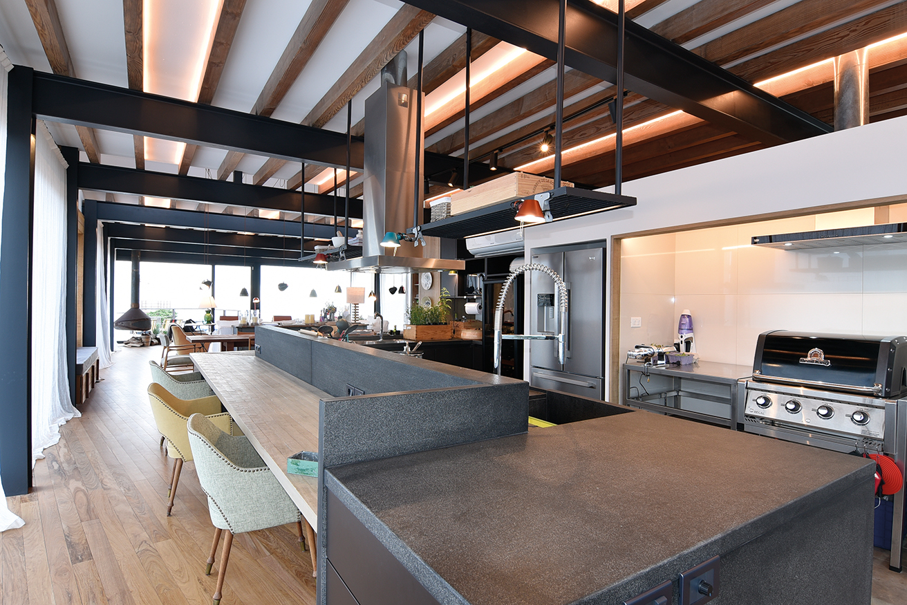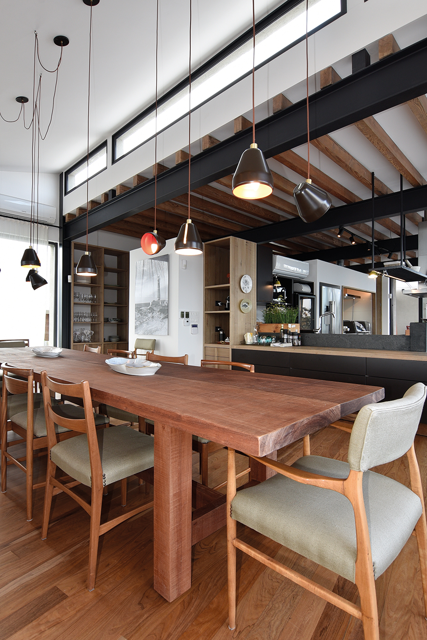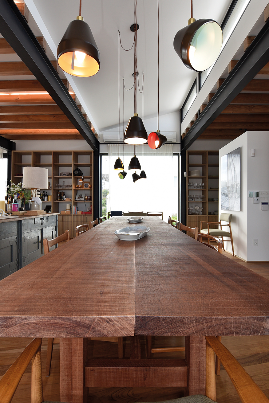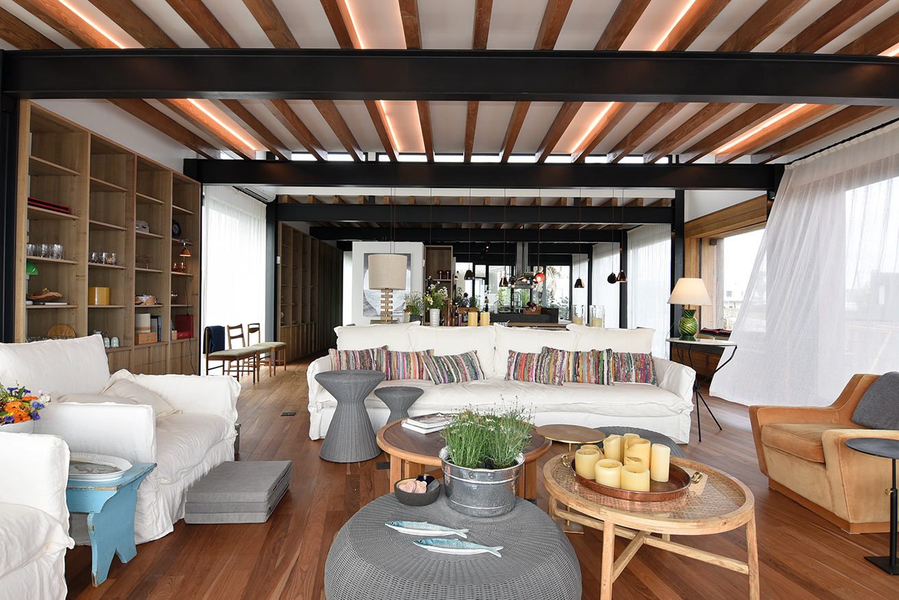 En la fachada opuesta tenemos una vista hacia el océano, luego la fachada está toda acristalada y enfrenta la mejor oportunidad para ver el mar. El desplazamiento del volumen de la planta alta sobre la losa de la planta baja también proporciona un deck de madera más amplio y cómodo, luego el deck gana proporciones y encontramos la cocina, la parrilla de concreto y ladrillo, un ambiente para recibir y compartir, siguiendo el volumen de la suite principal, acristalada en esta fachada, con vistas hacia el faro de José Ignacio. El piso inferior tiene las aberturas de las grandes ventanales de las suites de huéspedes que disfrutan del este y la vista hacia el mar. La distribución espacial es franca y sigue una lógica que se percibe armoniosa. En la planta alta se ubican las áreas sociales y en un ala, bien apartada, la suite principal. En el área social, abierta y despejada, la gran sala que se integra espacialmente al comedor y la cocina con mesada y toilette adjuntos, de manera práctica e integrada, junto a la cocina, de manera natural, el patio, el asador y horno de leña. En la planta baja se generaron tres suites para huéspedes, una sala de audio y video que también se convierte en dormitorio de ser necesario, un espacio vacío que contiene la escalera interna y una amplia gama de servicios. El proyecto de Candida se materializa con una estructura mixta que involucra madera, acero y hormigón, en el salón donde se exponen las estructuras vemos un conjunto de pórticos de acero y una subestructura de madera intercalada entre pórticos.