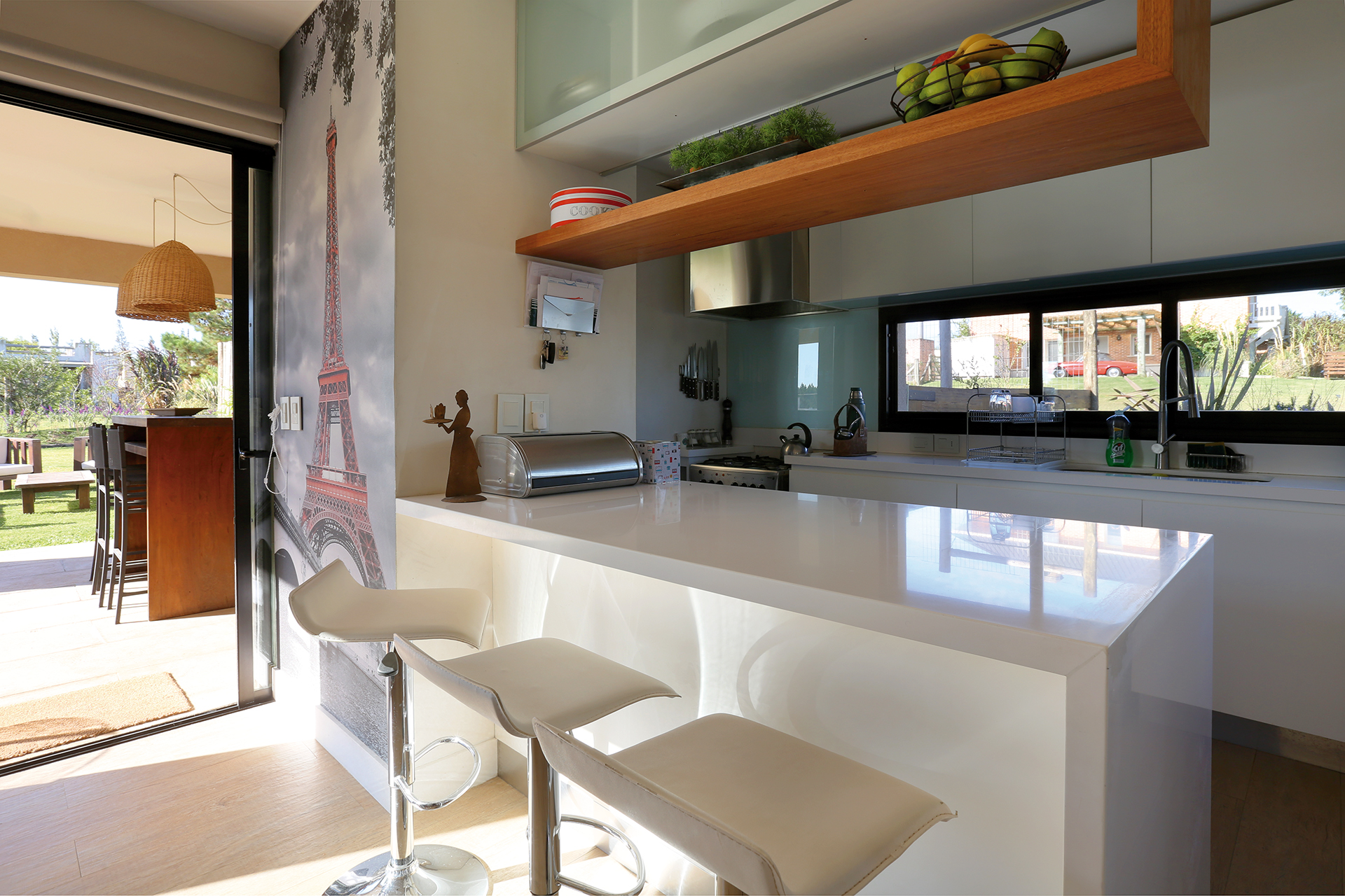 En relación a los espacios interiores, plantea un living comedor amplio, con un ventanal casi del ancho total del ambiente, abierto hacia el patio, donde se continúa con un deck cubierto por una pérgola, la cual protege al vano de la radiación solar del Norte. El modo de vivir la vivienda cambia en las distintas estaciones del año, por lo que se trató de dar una solución práctica, sin tener que recurrir a sistemas de toldos. La pérgola tiene una estructura de hierro que permite cubrir la luz total de ocho metros sin pilares intermedios. De estilo puro, con materiales rústicos, madera, hierro oxidado y equipada con muebles exteriores, se busca continuar el estilo de decoración y estética de la vivienda.