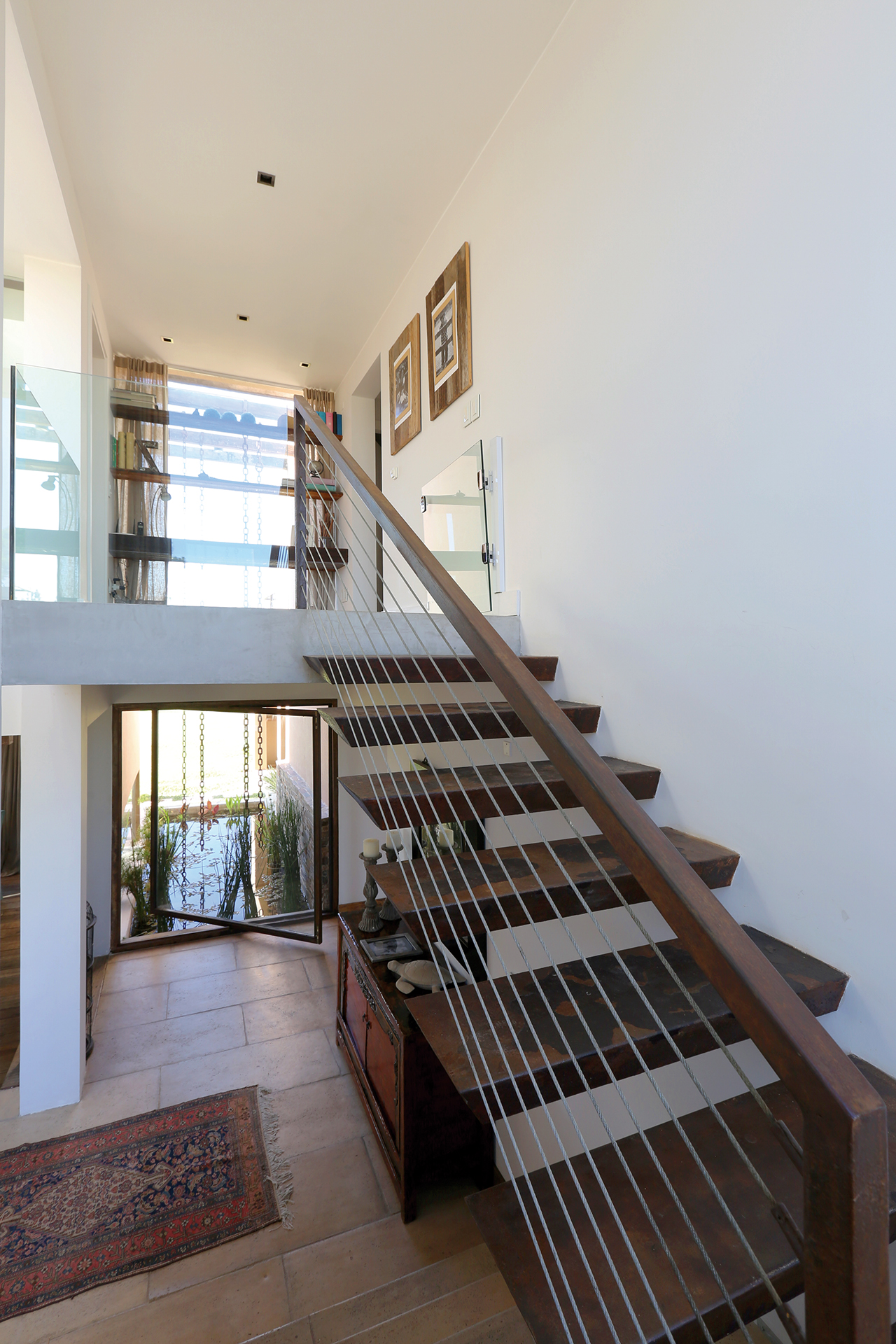 El volumen de circulación vertical también fue realizado de manera original, además del movimiento del volumen antes mencionado, cuenta con el peculiar diseño de la escalera, donde se construyó el primer tramo macizo, del ancho total de dos metros, dando la sensación de amplitud, que se equilibra con el diseño ligero del tramo restante, de peldaños volados y baranda con lingas metálicas. Se le dio un aspecto teatral con un gran ventanal en el descanso, cortinas de toda la altura y con un gran mortero de madera tipo tronco macizo. El arquitecto procuró en el diseño que la vivienda fuera apta para niños, tomó precauciones con respecto a la distancia entre los peldaños, las lingas de la baranda y la profundidad de los estanques, sin perder el sello personal.