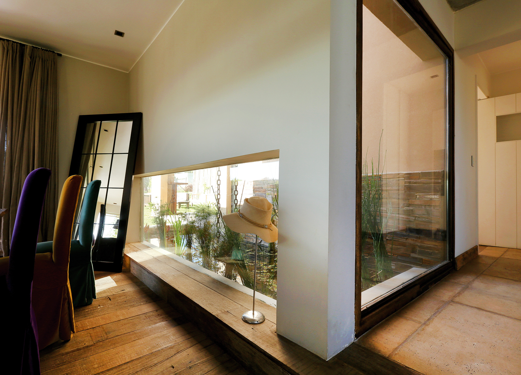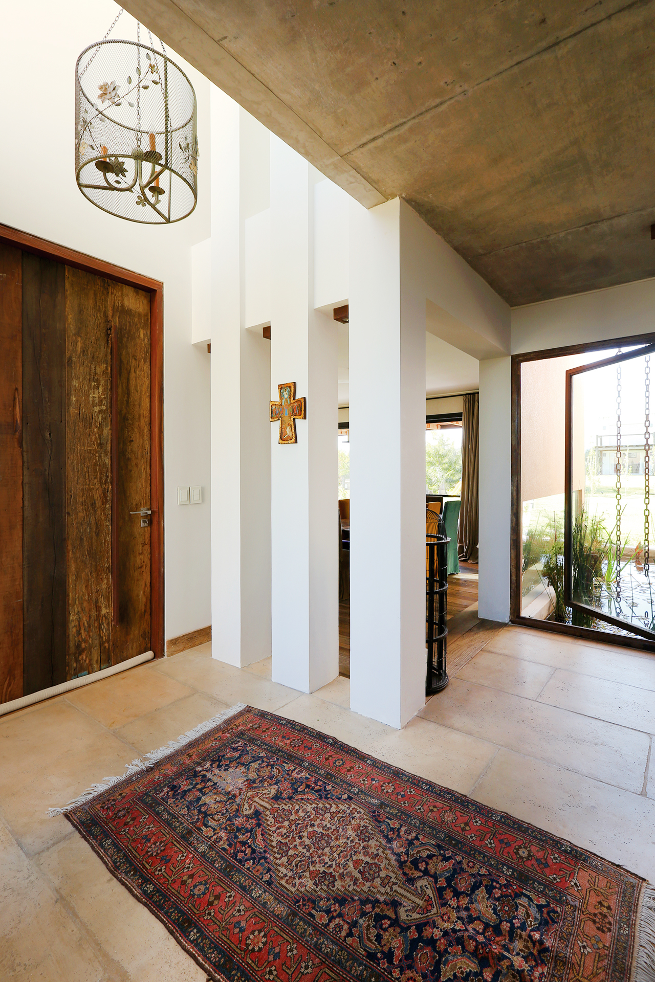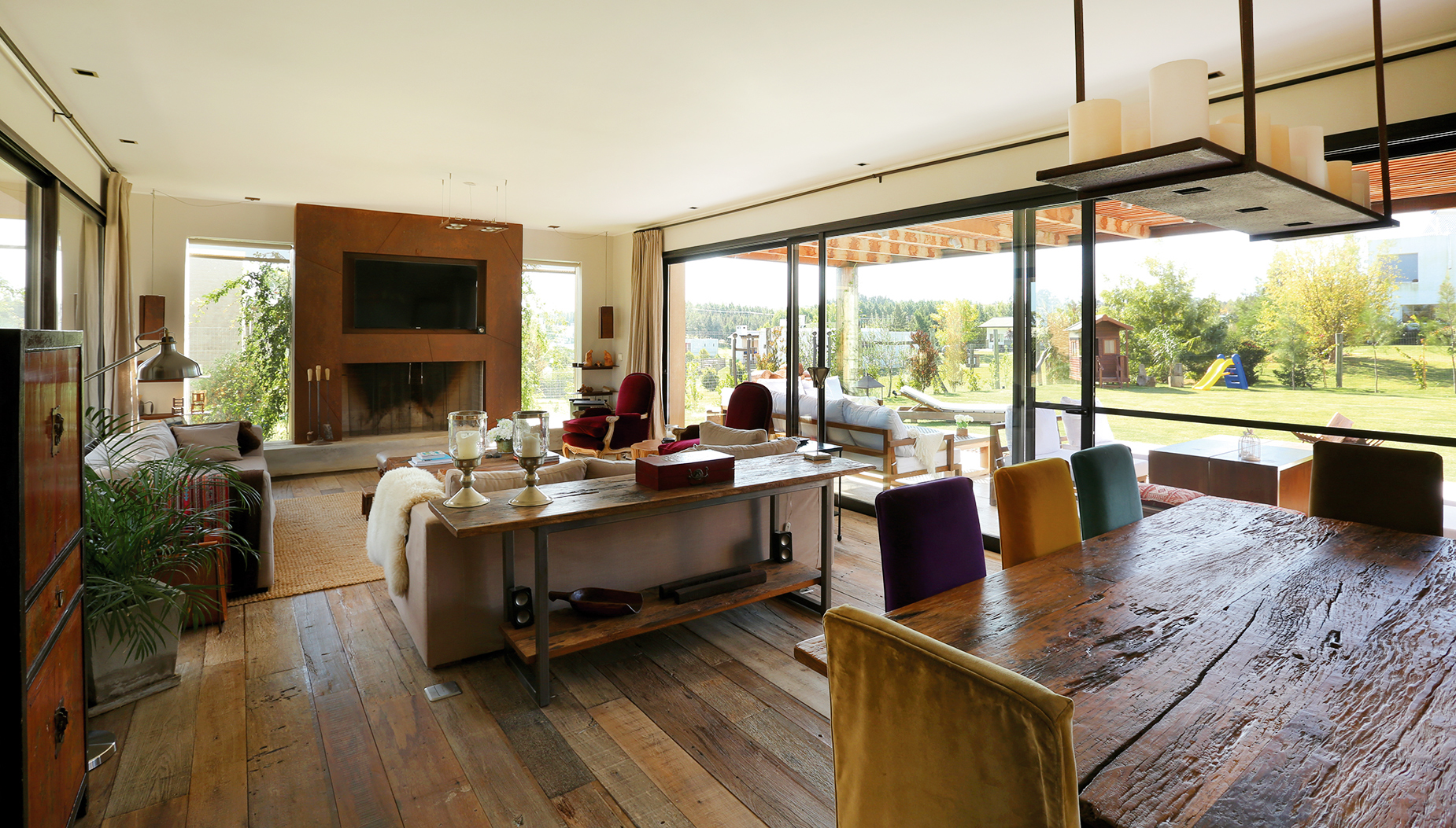 En los pavimentos del interior de la vivienda se busca continuar con materiales naturales, en la cocina se utiliza Porcelanato imitación madera y en las áreas de circulación baldosas calcáreas, pintadas a mano con tonos de beige por Eduardo Olascuaga, artista plástico. La terminación del piso del living comedor se realiza con tablones de madera rustica traída de Brasil, apenas con una limpieza y aplicación de cera natural. El revestimiento de la estufa repite la utilización de hierro oxidado tratado. Tanto las luminarias como la mesa del comedor fueron diseñadas por los propietarios. El resto de la decoración de este espacio se complementa con telas de lino en un tono entre beige y marrón, para cortinas y sofá. Las paredes se dejan en colores claros, logrando así el destaque de la madera, el hierro y las telas.
