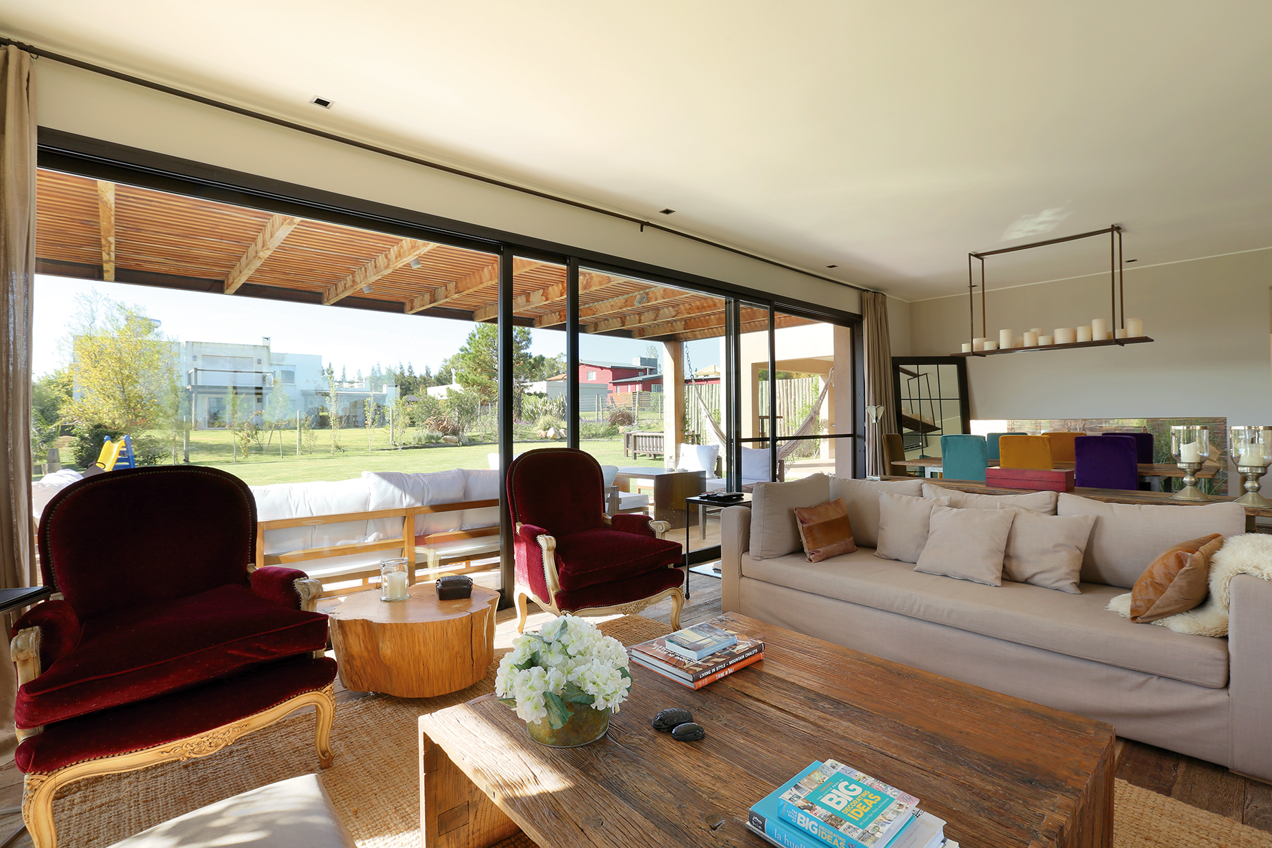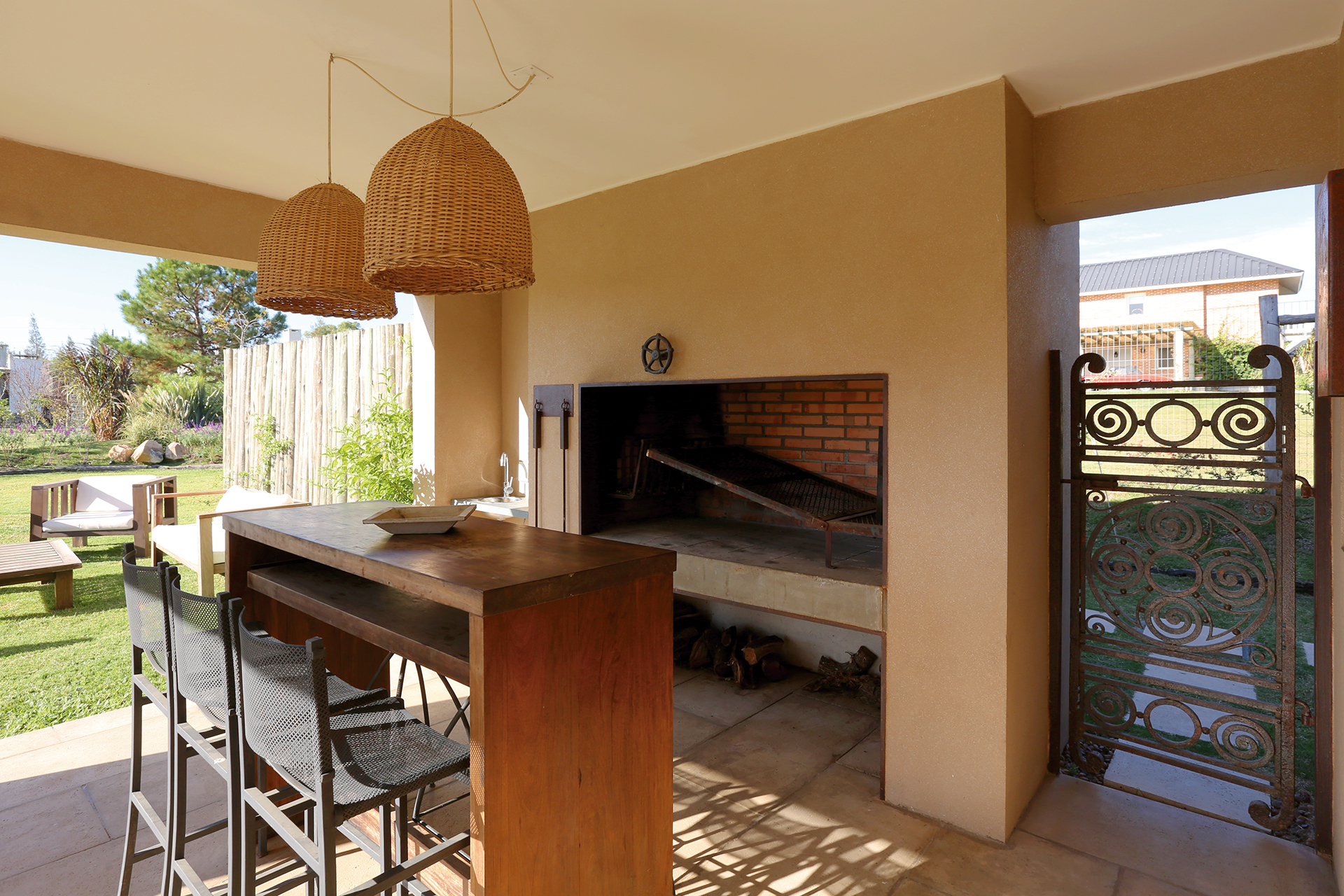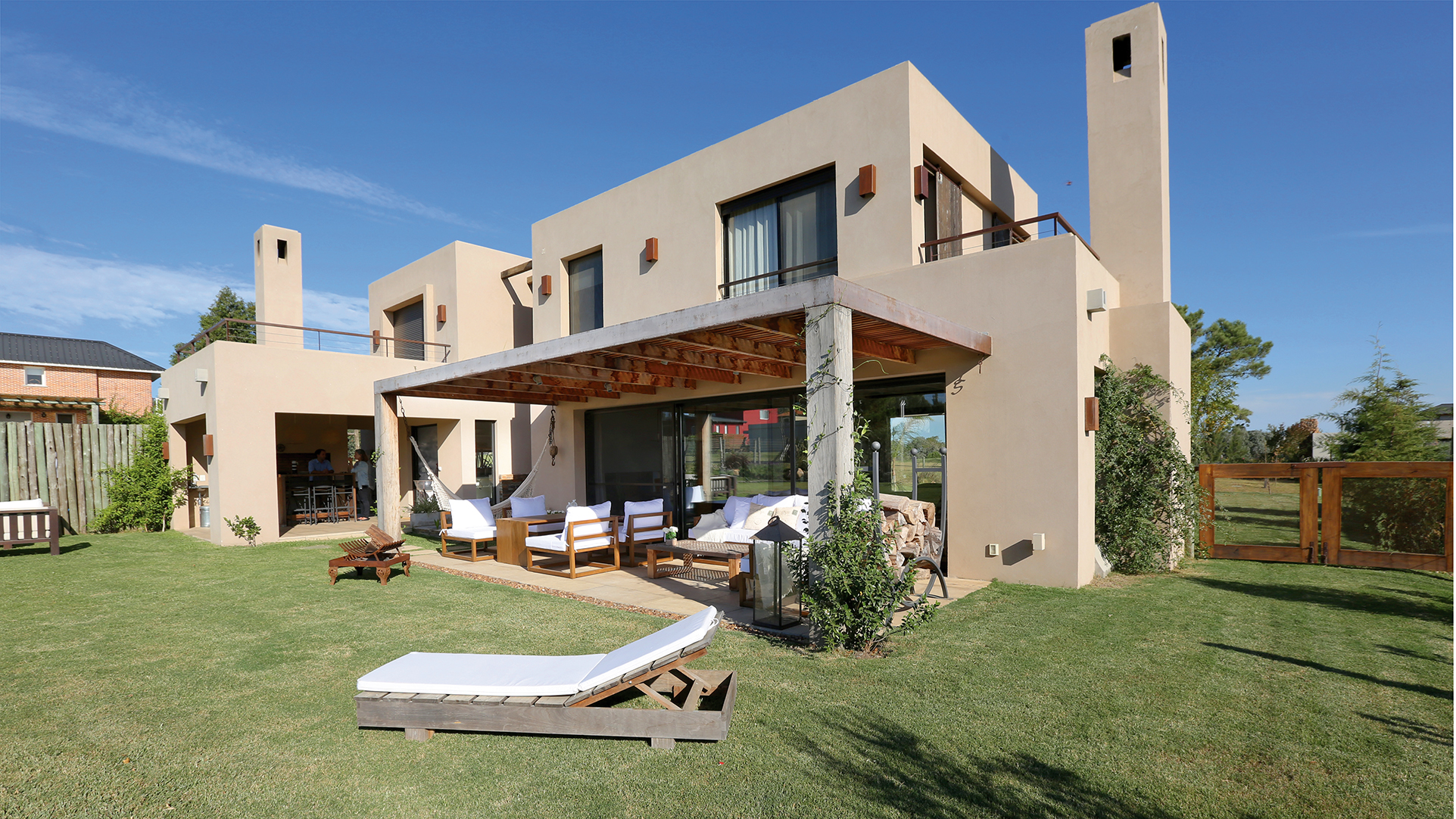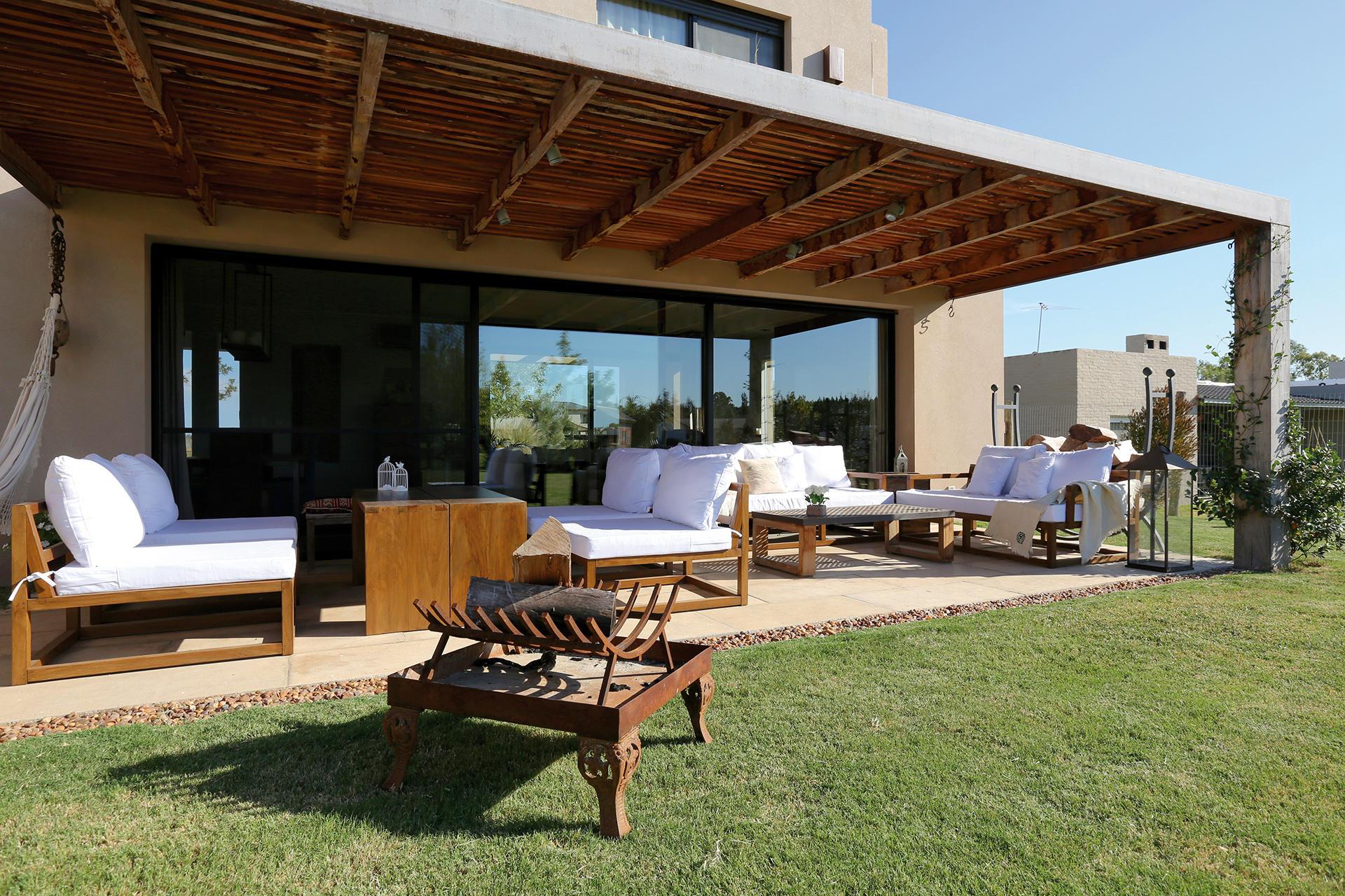 En relación a los espacios interiores, plantea un living comedor amplio, con un ventanal casi del ancho total del ambiente, abierto hacia el patio, donde se continúa con un deck cubierto por una pérgola, la cual protege al vano de la radiación solar del Norte. El modo de vivir la vivienda cambia en las distintas estaciones del año, por lo que se trató de dar una solución práctica, sin tener que recurrir a sistemas de toldos. La pérgola tiene una estructura de hierro que permite cubrir la luz total de ocho metros sin pilares intermedios. De estilo puro, con materiales rústicos, madera, hierro oxidado y equipada con muebles exteriores, se busca continuar el estilo de decoración y estética de la vivienda.