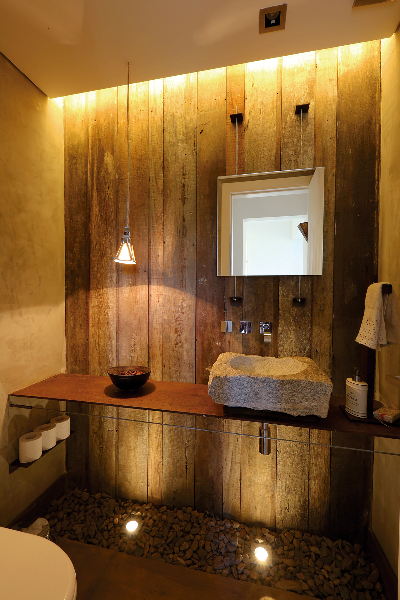 El arquitecto apuesta al diseño de espacios y elementos que componen su arquitectura, un ejemplo es el toilette en planta baja, el lugar más pequeño y donde aplicó el mayor diseño, utilizó una luminaria de hierro oxidada de Felicia, mesada de hierro y pileta tallada a partir de una pieza única de piedra, una de las paredes fue revestida con tablones de madera rustica y la línea de la mesada a nivel de piso se decoró con piedra partida, donde se colocaron pequeñas luminarias, con el fin de dar un toque diferente al ambiente. En estas pequeñas áreas es donde el arquitecto deja su sello personal en cuanto a decoración, buscando un equilibrio y diseñando sabiamente los espacios residuales.