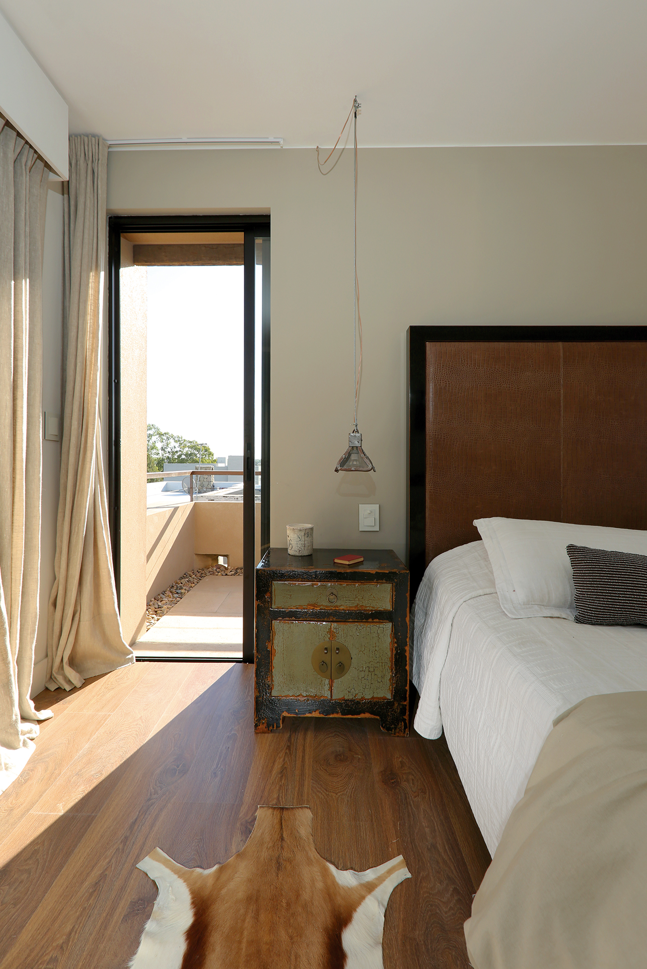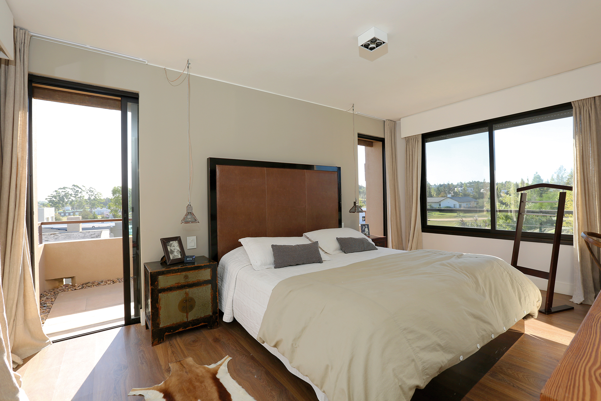 La planta alta se compone de dos alas con acceso desde el área de circulación, iluminada con luz natural captada por amplios ventanales. El ala principal, correspondiente al living comedor en planta baja, es destinada al dormitorio matrimonial en suite con vestidor. Su acceso es través de un pasillo donde a un lado se continúan las vistas hacia el campo de golf y el lago de viñedos y hacia el otro se diseña una pared ocultando sabiamente puertas de placares. También en este sector de la vivienda el arquitecto aplicó su sello personal en cuanto a la decoración, recicló tablones de madera de una antigua pérgola existente en su casa paterna para realizar los postigos de salida al balcón y en el baño diseñó la puerta en vidrio esmerilado y hierro, completando la decoración del espacio con mármol de Carrara, vidrio, revestimientos neutros y variada iluminación.
