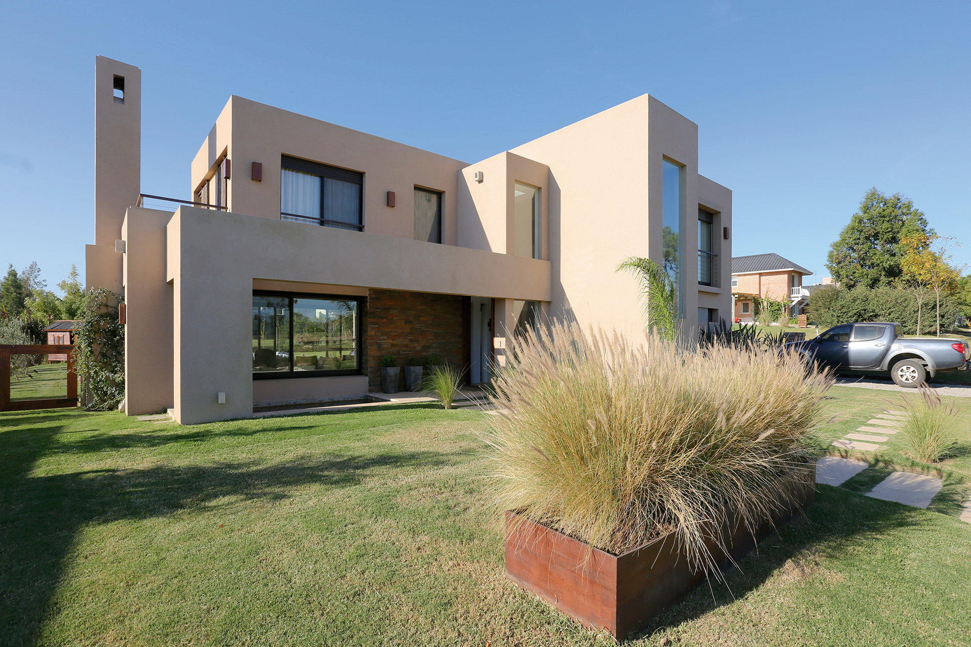 De estilo contemporáneo rústico, formas minimalistas geométricas y puras, sin ornamentación ni molduras, con vanos bien definidos y vidrios fijos embutidos sin marcos. Se procura romper con la forma cúbica jugando con los volúmenes, a través del movimiento de piezas y calando espacios para dar lugar a balcones en planta alta y espacios exteriores techados en planta baja. La calidez del hogar fue buscada en los colores y materiales naturales. El arquitecto proyecta diseñando arquitectura, jardines, muebles y luminarias.