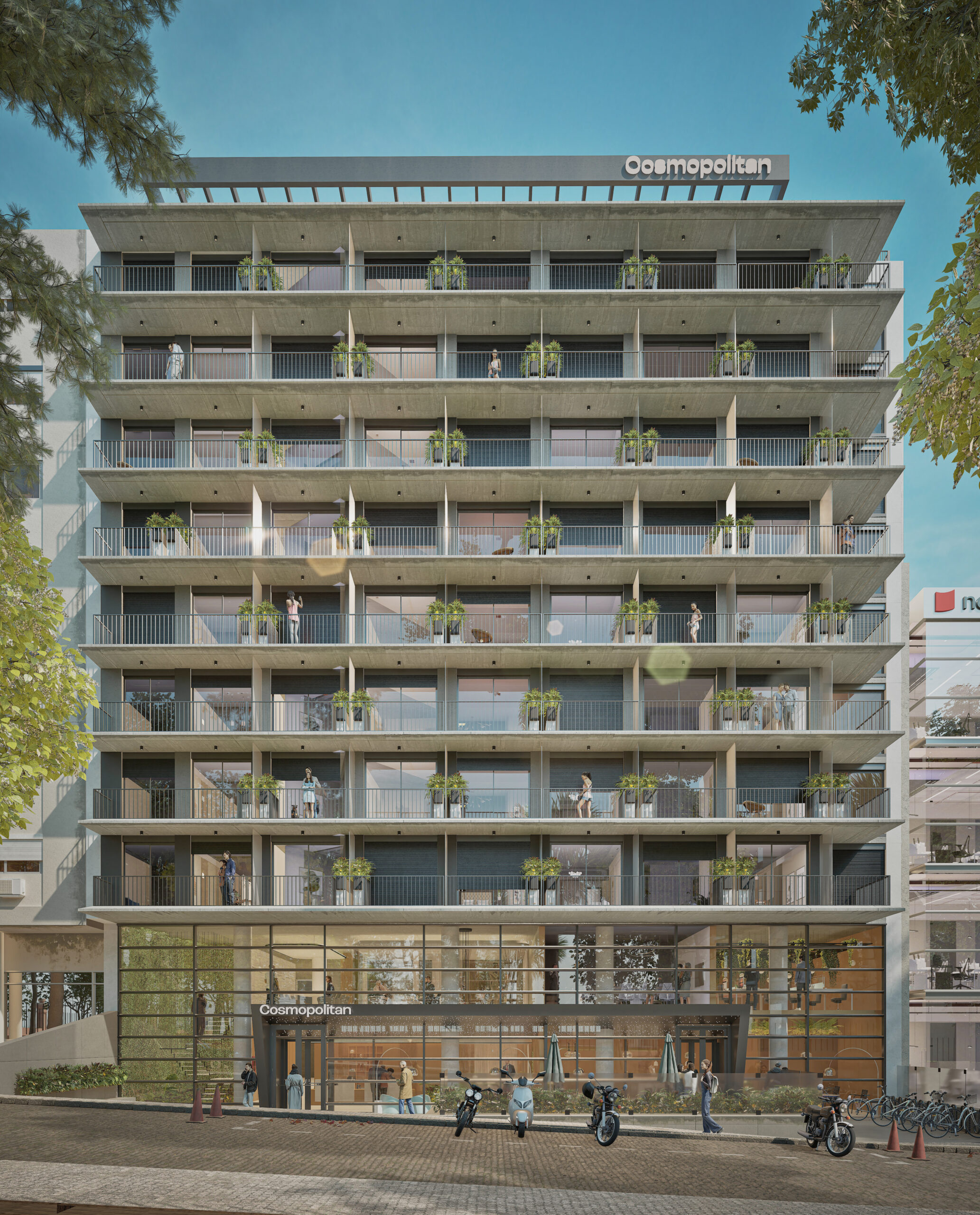 Más que un conjunto de unidades, Cosmopolitan es un espacio pensado para la interacción. En la planta baja, una cafetería abierta al público extiende la vida del edificio hacia la calle. En el último nivel, un rooftop panorámico se convierte en el lugar perfecto para cerrar el día con la ciudad y el río como telón de fondo.