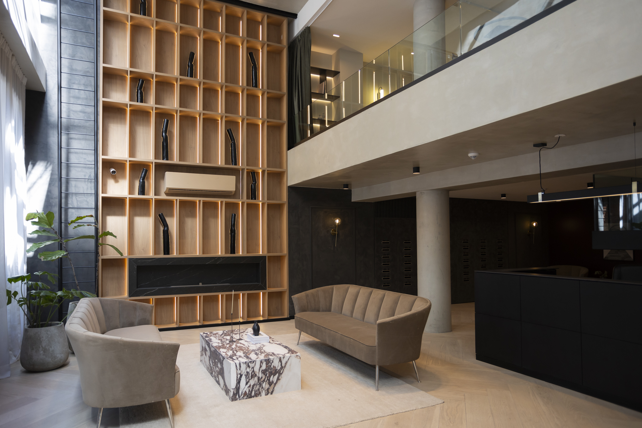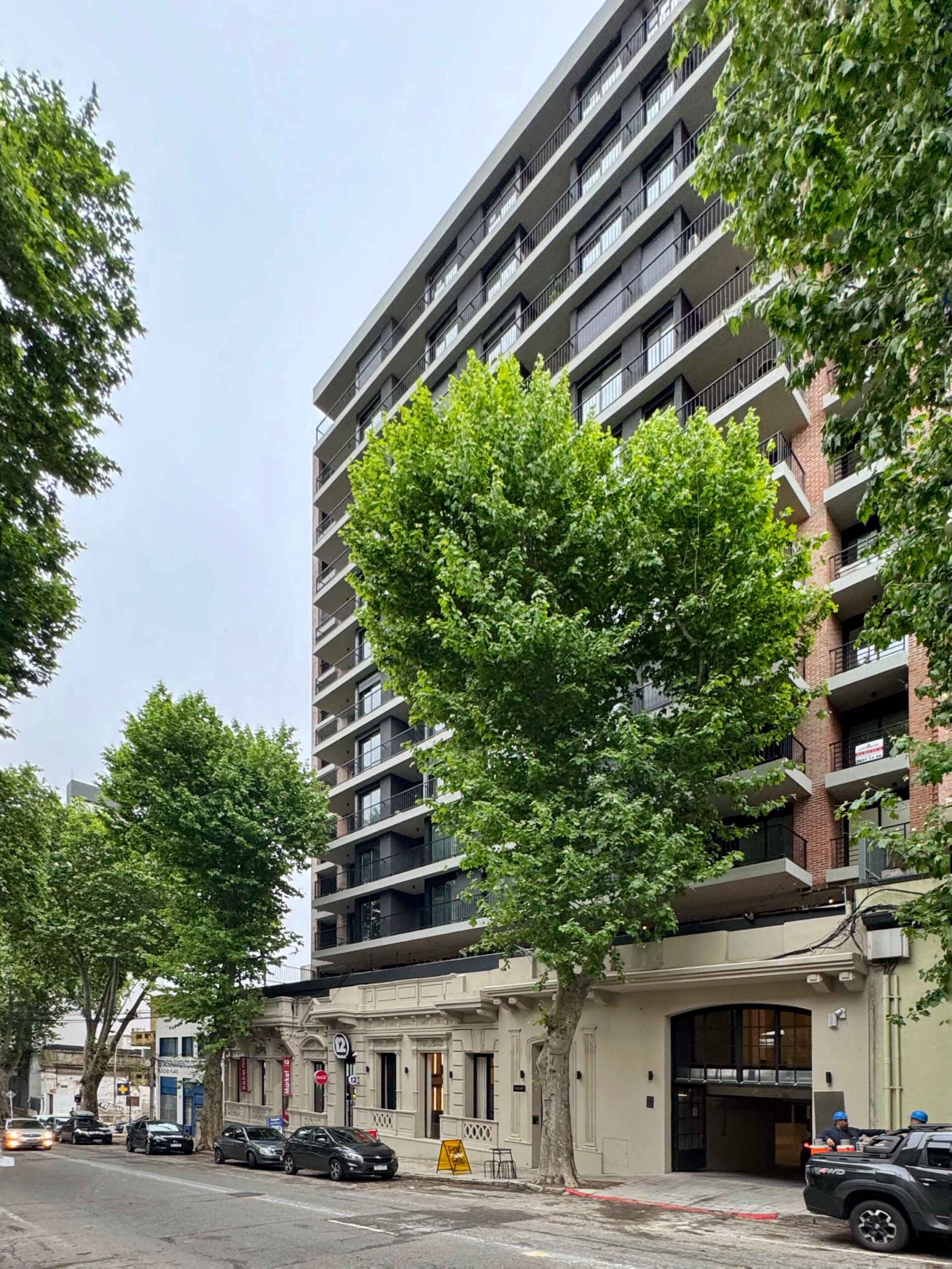 Conservando las viviendas originales de 1930, la fachada de la torre se adentra en el terreno con una propuesta que dialoga armónicamente con la memoria histórica del lugar. Al ingresar al edificio, se despliega una biblioteca de más de cinco metros de altura, enmarcando el espacio de doble altura y generando un impacto visual único. Este elemento central integra una estufa revestida en piedra y esculturas a medida, creadas por un artista uruguayo. La combinación de estos elementos, sumada a la iluminación de la biblioteca, aporta una calidez sofisticada que envuelve el ambiente.