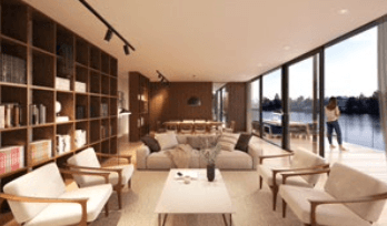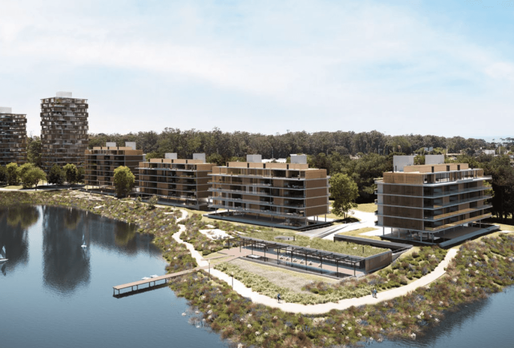 El proyecto se compone de cuatro edificios de vivienda que se articulan holgadamente sobre el gran parque a orillas del Lago. El conjunto es accesible desde la Avenida a la Playa a través de una calle serpenteante que transcurre entre los traslucidos halles de los distintos edificios donde el imponente paisaje del Lago es el protagonista. Las particularidades del predio, permiten disponer los distintos edificios logrando la mejor orientación en cuanto al asoleamiento y asegura vistas francas y despejadas al Lago desde cada unidad. El conjunto contará con un Club House ubicado a orillas del Lago con su muelle el cual permitirá desarrollar varias actividades náuticas. Entre las amenidades previstas figuran una piscina, solárium, gimnasio y barbacoa-home office. Los edificios han sido diseñados con seis niveles más un subsuelo. El nivel subsuelo, alberga los estacionamientos, los boxes de cada apartamento, y áreas de servicio común. El nivel de acceso está dado por un amplio hall transparente y una terraza semi techada que se abre hacia el paisaje. El acceso vehicular se realiza a través de un alero techado para dar resguardo al acceso y descenso de las personas. Este nivel dispone de cocheras de cortesía para visitas. Los cuatro niveles superiores albergan cuatro apartamentos por nivel. La generosidad del terreno y la disposición de los edificios permiten disfrutar de vistas francas y despejadas hacia el Lago y el paisaje desde todas las áreas de relación y dormitorios principales de cada unidad de vivienda del conjunto. El último nivel está asignado a dos amplios pent-houses que disponen de amplias terrazas. Importa saber que los Arquitectos Guerra y De Rossa asignan especial importancia al paisaje ya que de alguna manera aquel escenario natural que encontraron ha marcado y condicionado felizmente el proceso creativo del conjunto residencial. Por esa razón el proyecto de Paisajismo fue encargado al Estudio de Amalia Robredo.