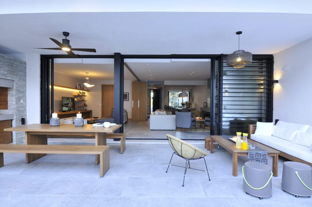 Una vez en el interior de la casa la transparencia hacia el fondo y hacia la piscina longitudinal que prolonga las visuales, es total. Aberturas de piso a techo dan al estar exterior techado (con parrillero), prolongación natural del interior. El living y el estar pueden separarse cerrando un gran panel plegable (realizado con un herraje importado especialmente). La cocina, al frente, y una escalera secundaria que vincula los 4 niveles de la casa, permiten al área de servicio funcionar con independencia del área de relación.