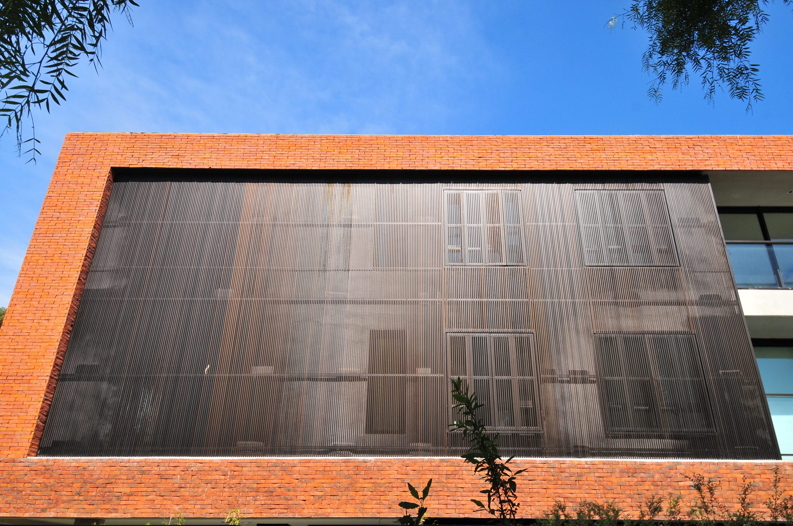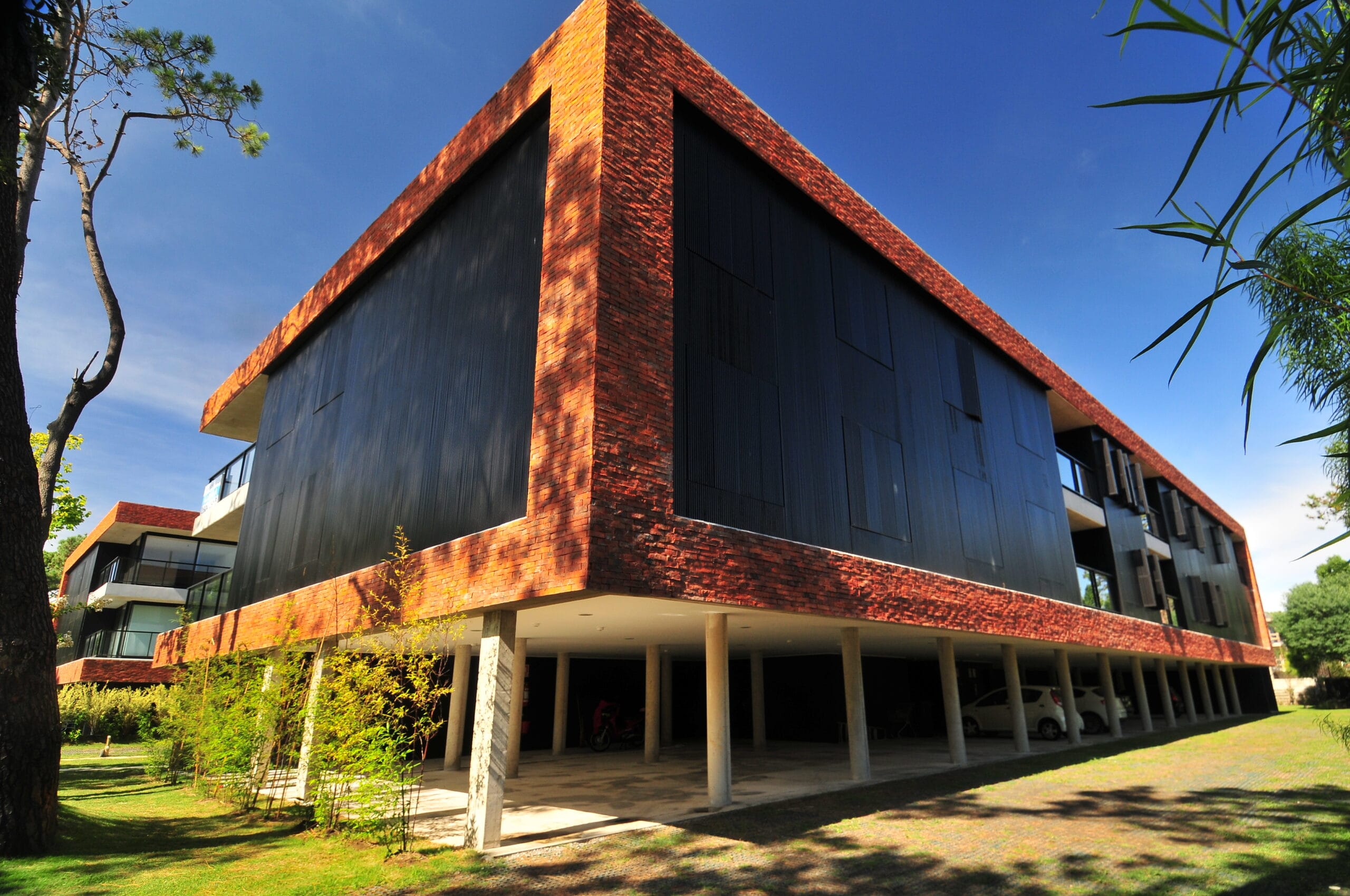 Estéticos distintivos que refieren al Estudio OBRAPRIMA. El revestimiento tamizado con ladrillos de campo aplicados sin junta y la madera noble dispuesta longitudinalmente confieren a los dos volúmenes bajos que componen al proyecto, un espíritu particular que se relaciona con el paisaje del lugar y su historia. El desarrollo de los volúmenes, enmarcados por una gran cinta revestida en ladrillo de campo, juega con los plenos y los vacíos, disponiendo de estos últimos hacia el centro, de modo tal de generar una suerte de volumen quebrado al centro.