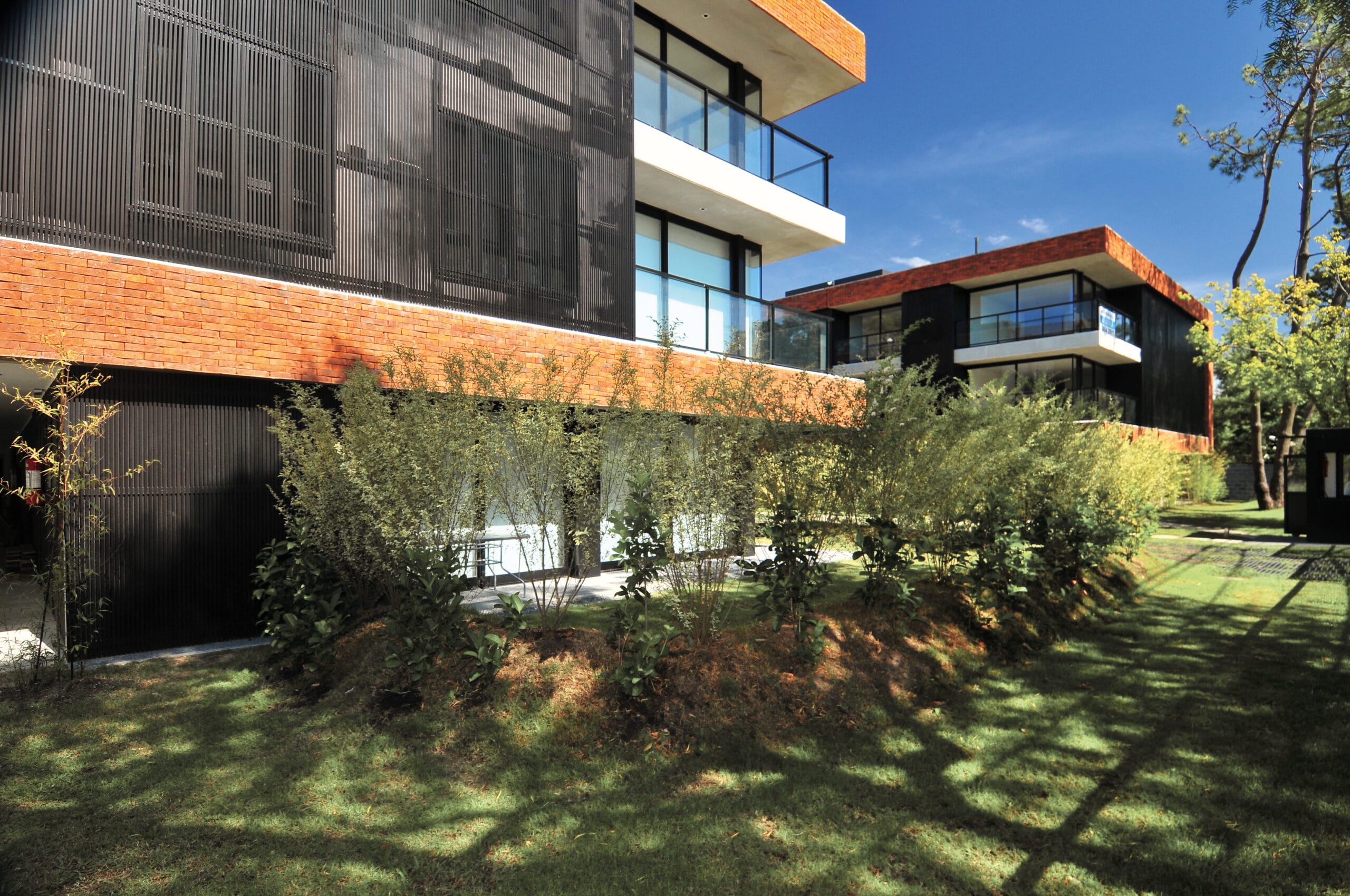La unión mediante una pérgola de madera supone un elemento de integración de marcado carácter residencial. Las 29 unidades, de uno y dos dormitorios, están concebidas con todo el confort posible, prestan especial atención a las terminaciones. Espacialmente son generosos y destacan a partir del concepto del apartamento para vivir, esto es, consagra especial importancia a los habitantes y sus necesidades. Los amenities incluyen piscina, gimnasio y áreas comunes donde predomina el verde de cuidados jardines que imponen su presencia a todas las unidades.