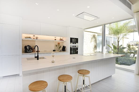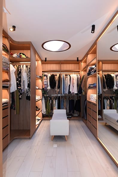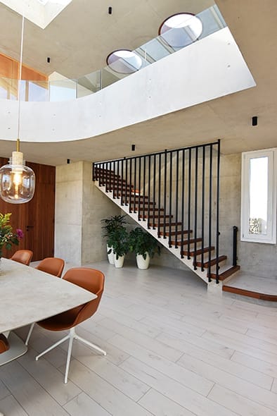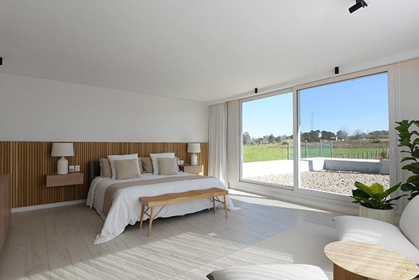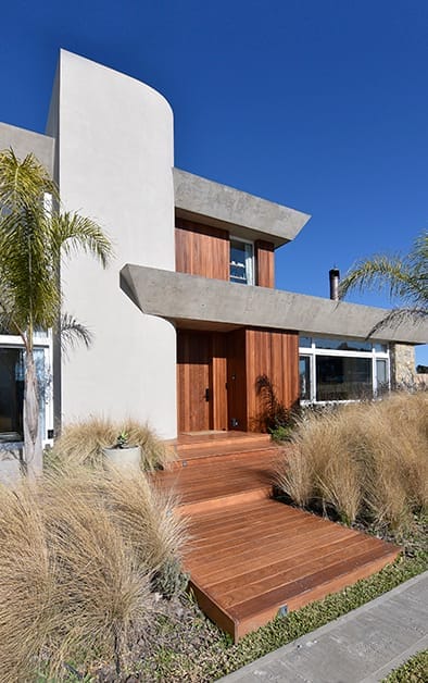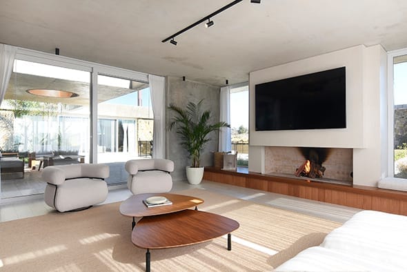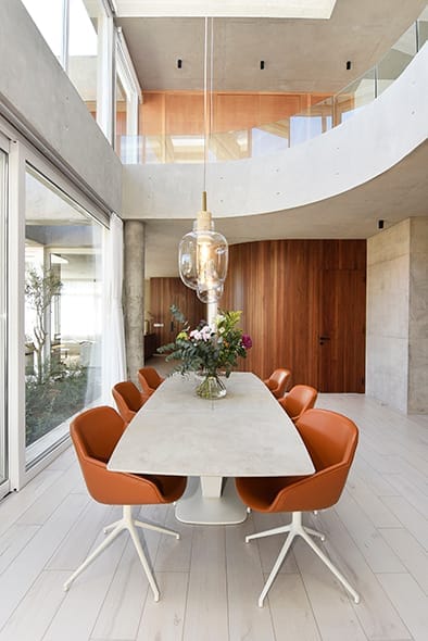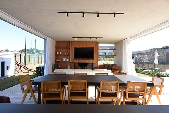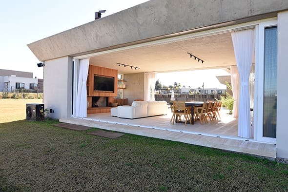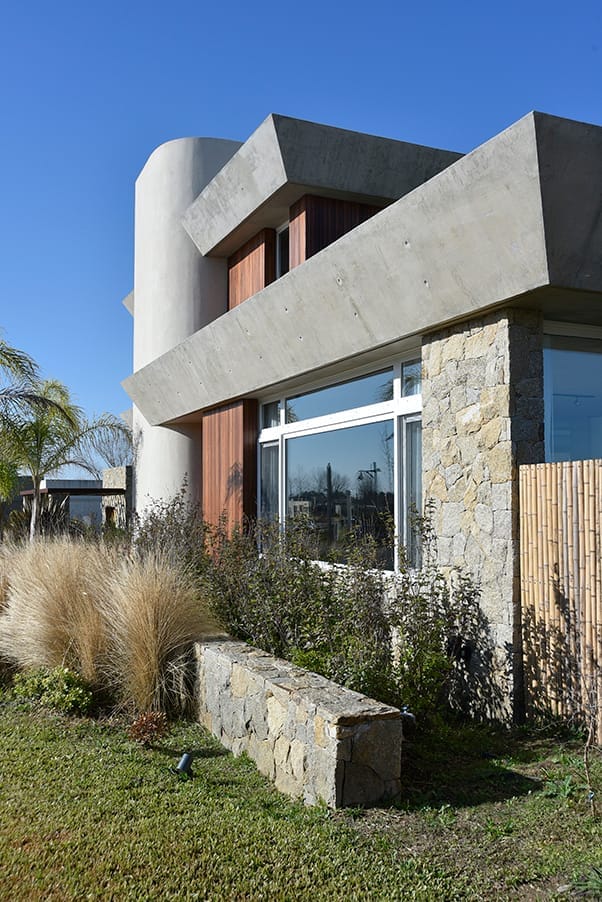 El acceso principal de la casa, ubicado siguiendo la proporción áurea, establece una primera impresión poderosa y armoniosa. La fachada principal, con su geometría rigurosa, se contrapone a una fachada posterior dinámica generando una planta completa en forma de “U”, donde las líneas rectas se enriquecen mediante bandas continuas y grandes losas que se proyectan hacia el jardín. Este diseño no solo crea una conexión visual entre la casa y su entorno natural, sino que también genera espacios semiabiertos que integran la vivienda con la piscina cercana, formando un vasto telón verde que enmarca la propiedad. El resultado es una serie de ambientes interiores donde la luz natural predomina, la sensación de amplitud espacial es importante y entonces, el equipamiento luce de manera distinta, siempre al servicio de las inquietudes y necesidades de los habitantes.