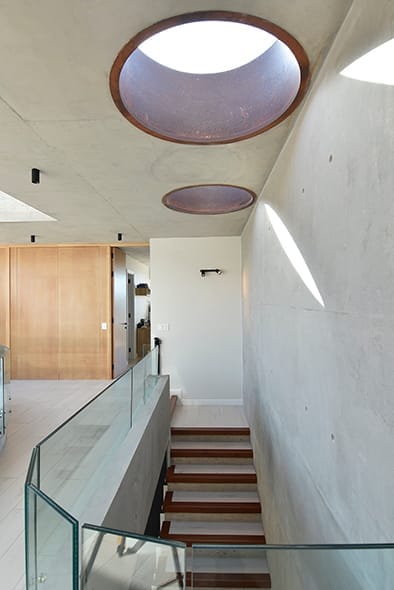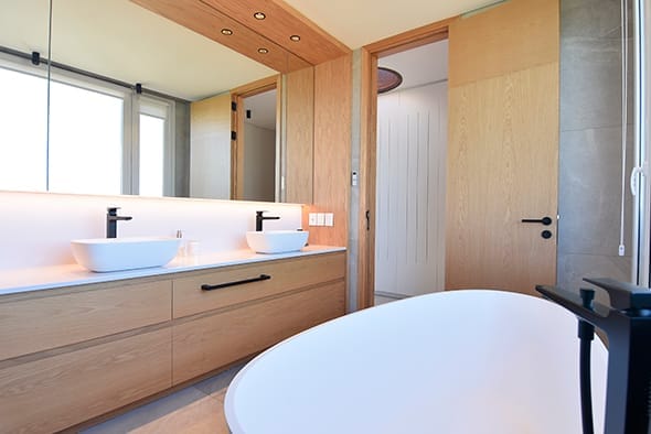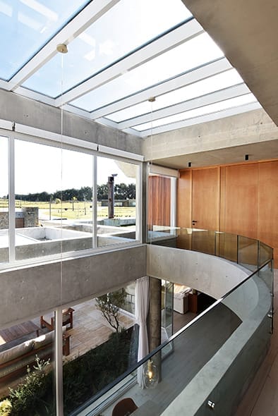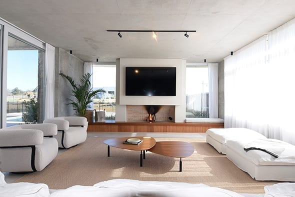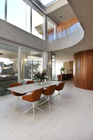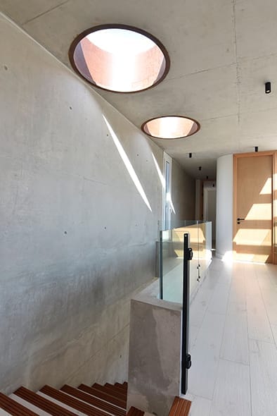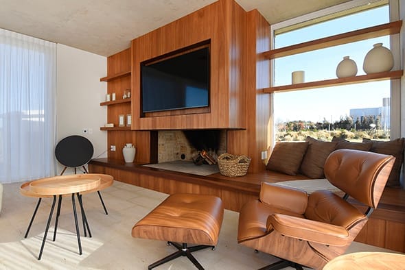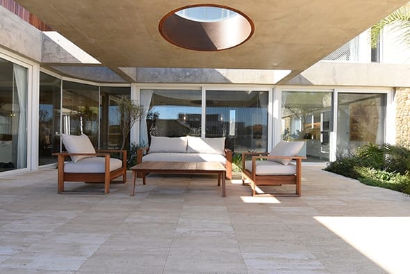 El pavimento interior, realizado en madera, y el exterior, compuesto por travertino, crean una transición fluida entre los espacios interiores y exteriores que mucho tiene que ver con la calidez y sensación de confort que trasmite el espacio atrapado.