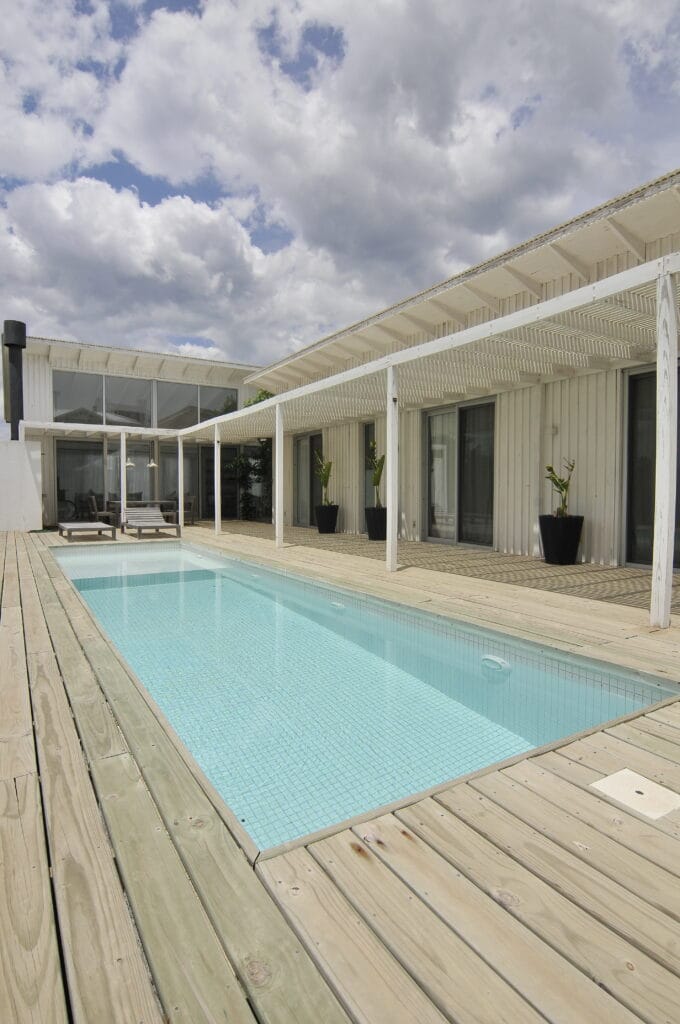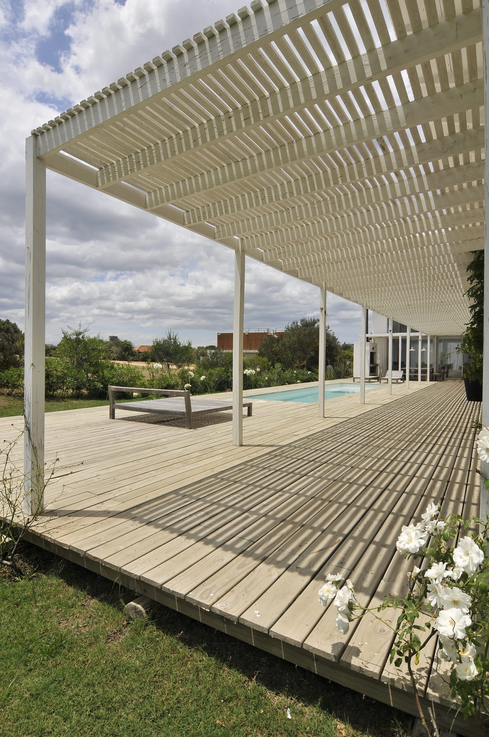 Abierta hacia afuera se centra dentro del terreno en forma de ¨L¨. Planteada en tres volúmenes unidos por una pérgola exterior, su galería interior y la caminería de deck transforman a la vivienda en una sola al ser vista desde el exterior.