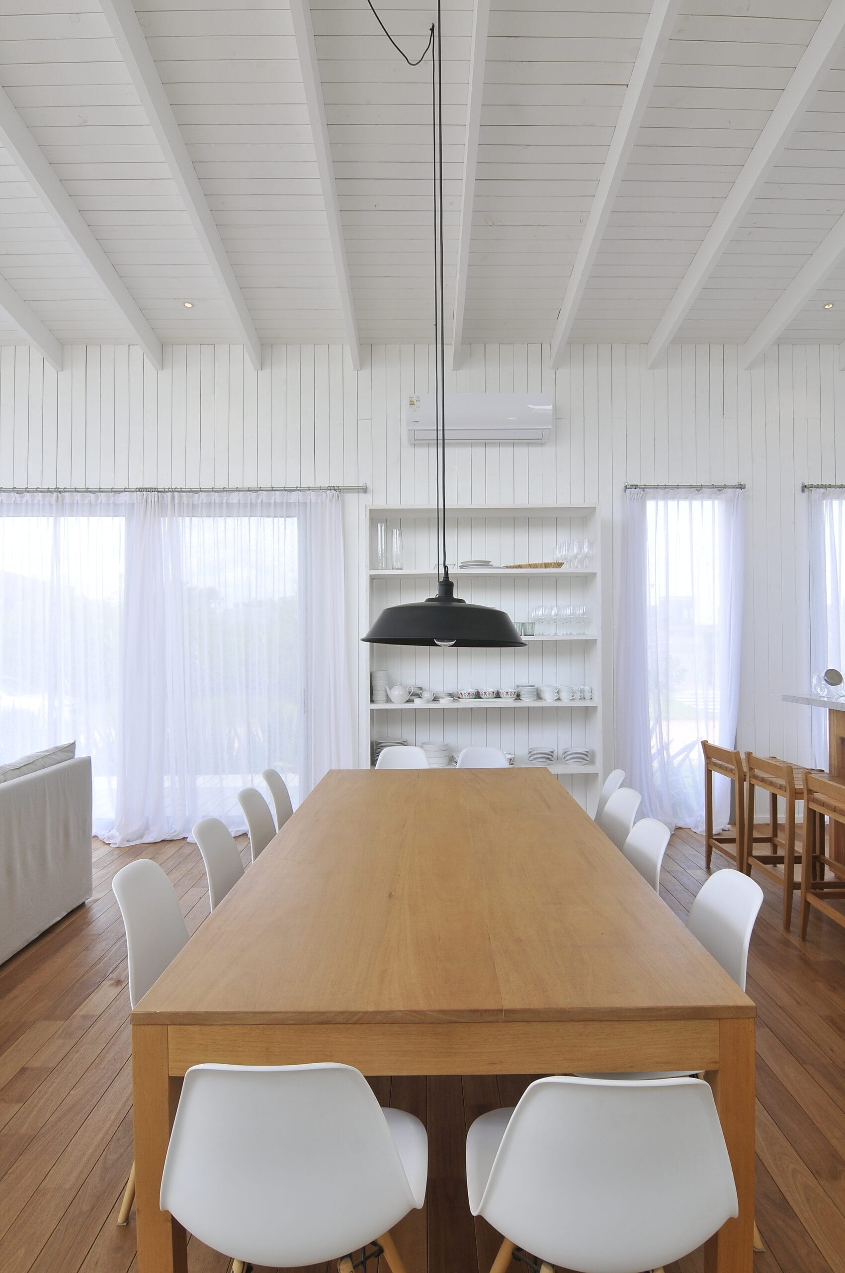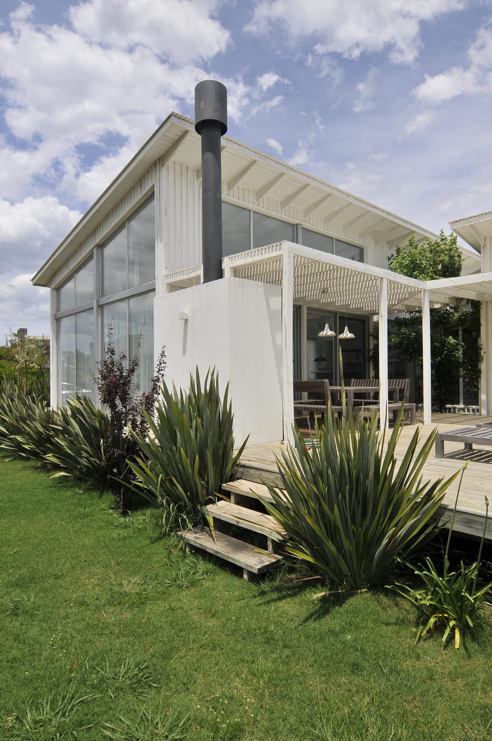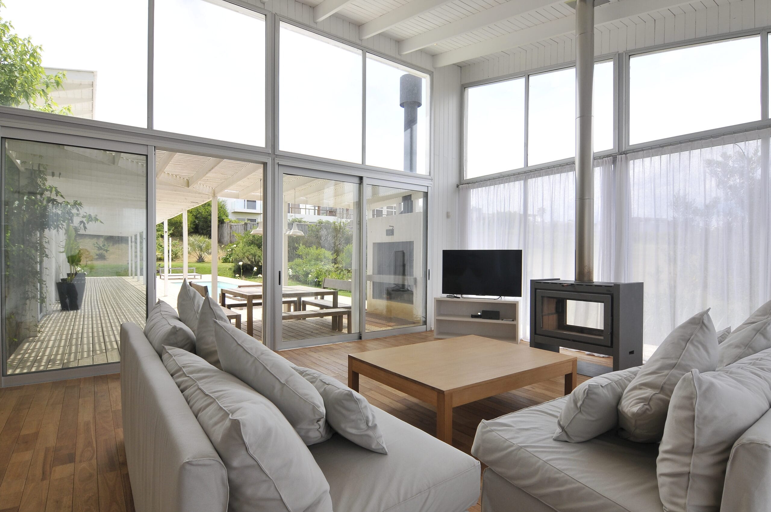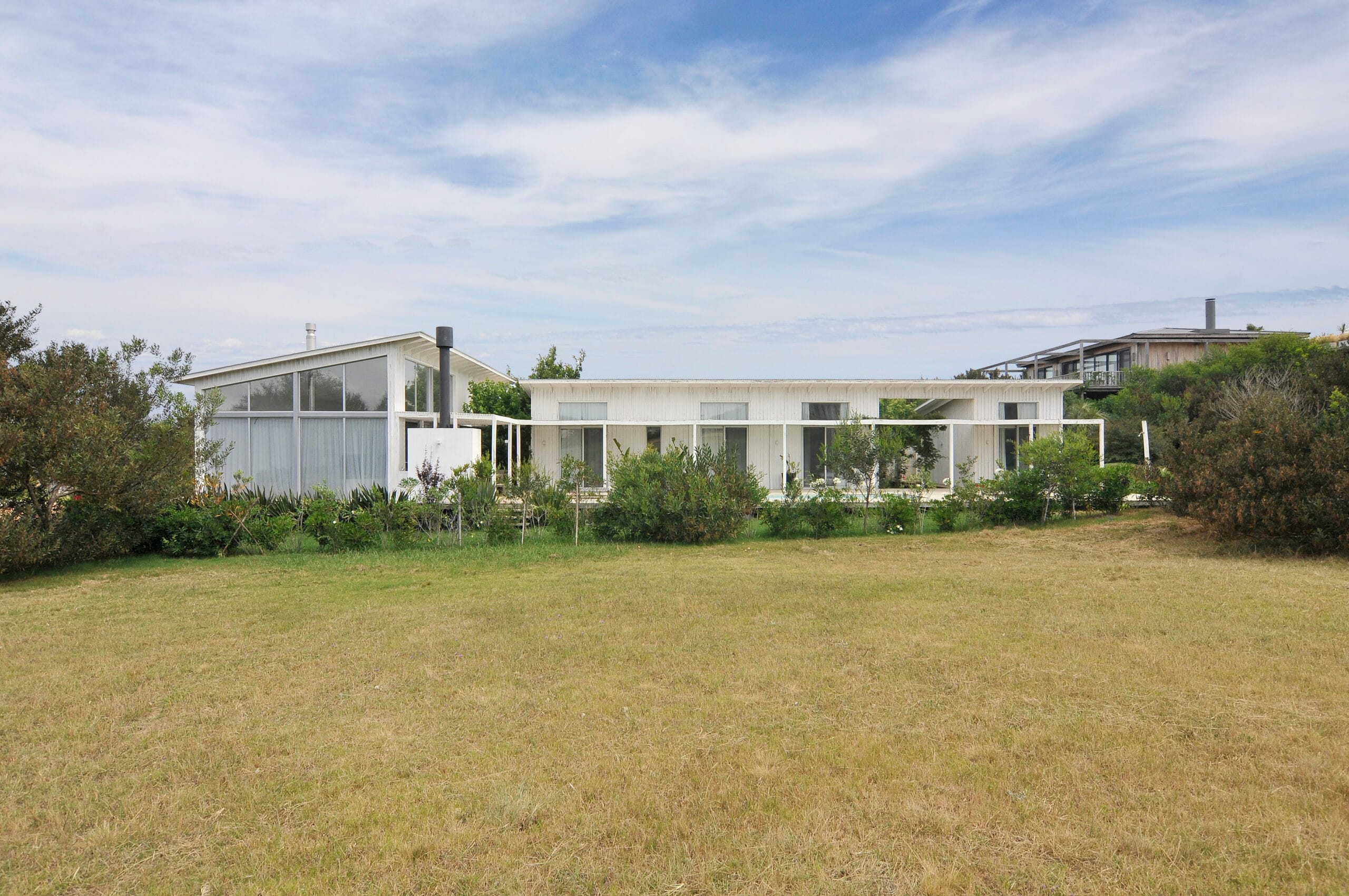 La caminería y el jardín se enlazan con la arquitectura, resultando una casa relajada y divertida, blanca y despojada. El living-comedor es muy transparente, la luz llega a través de grandes ventanales de piso a techo abiertos en todas las direcciones. La totalidad de la casa mantiene esta doble transparencia enfatizando una vista despejada hacia la piscina.