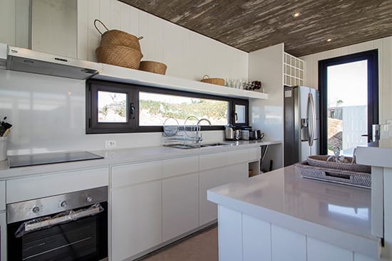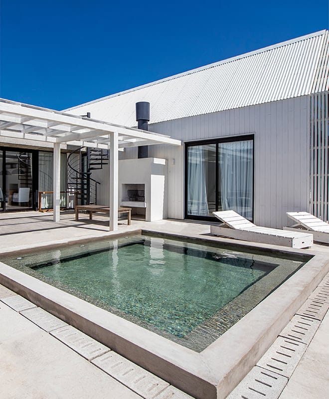 En el patio se ubicó un piletón cuadrado, una galería con pérgola y un fogón, que son el corazón de esta casa. A esto se le suma una gran terraza sobre el volumen con techo plano, con una increíble vista al mar.