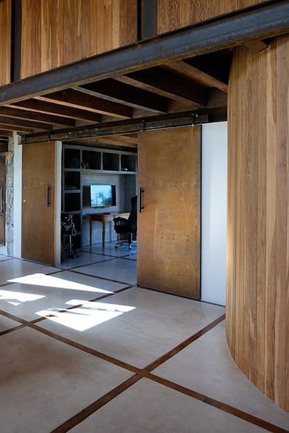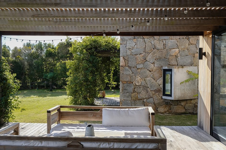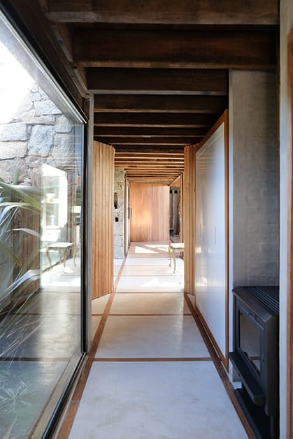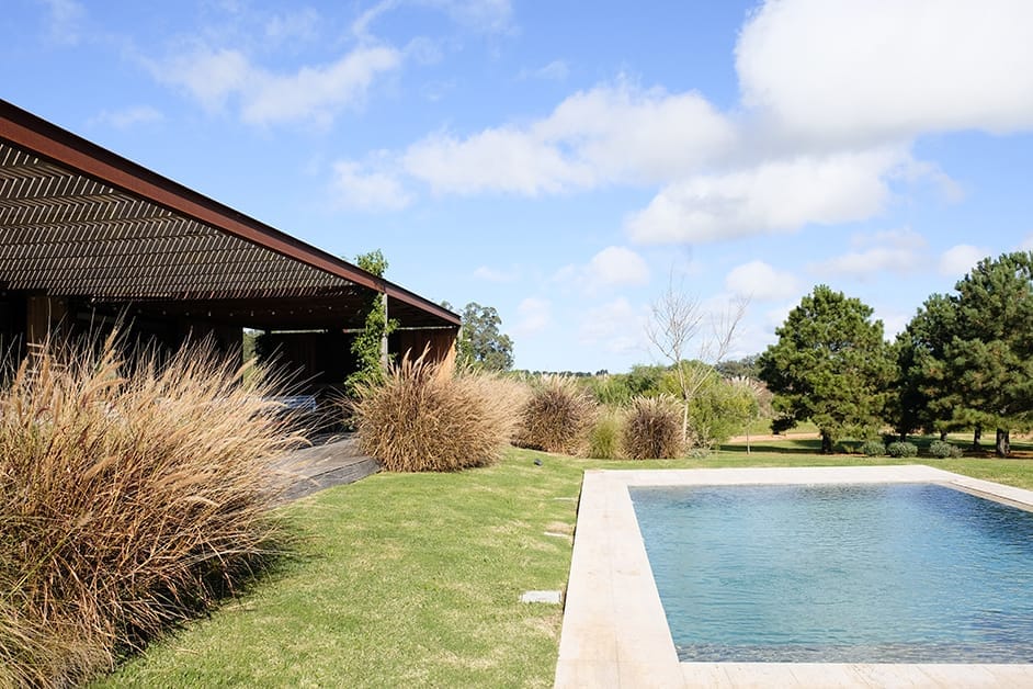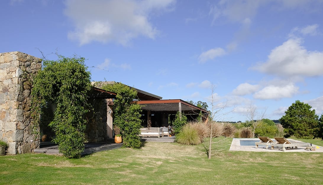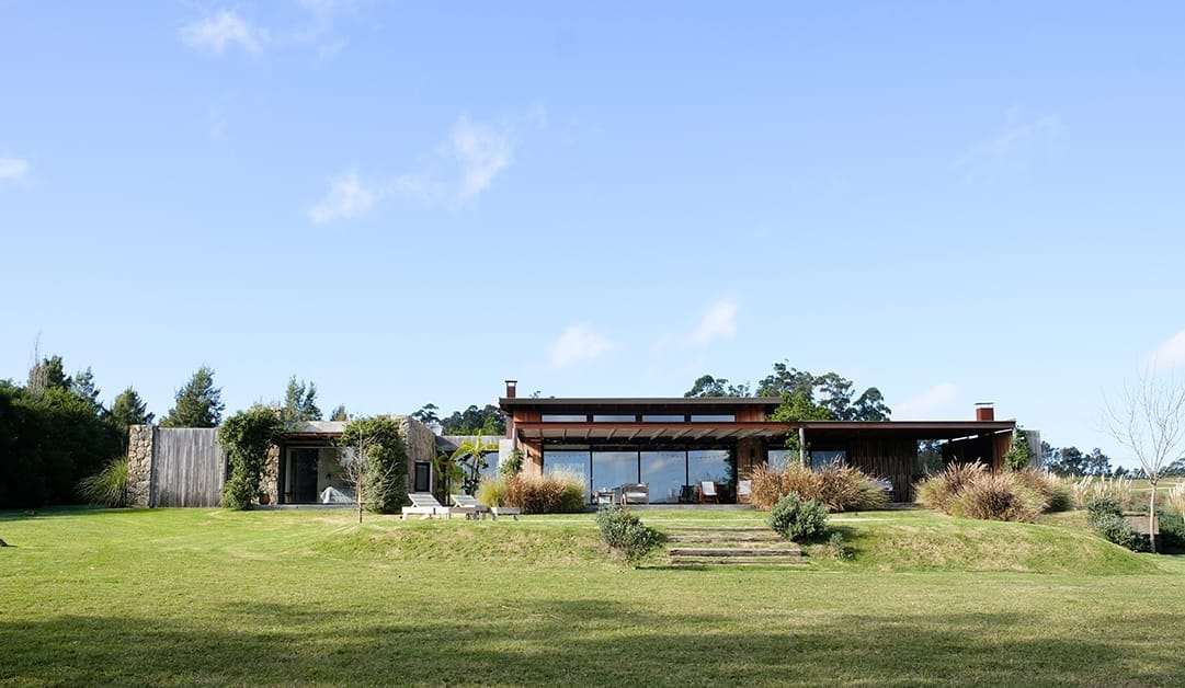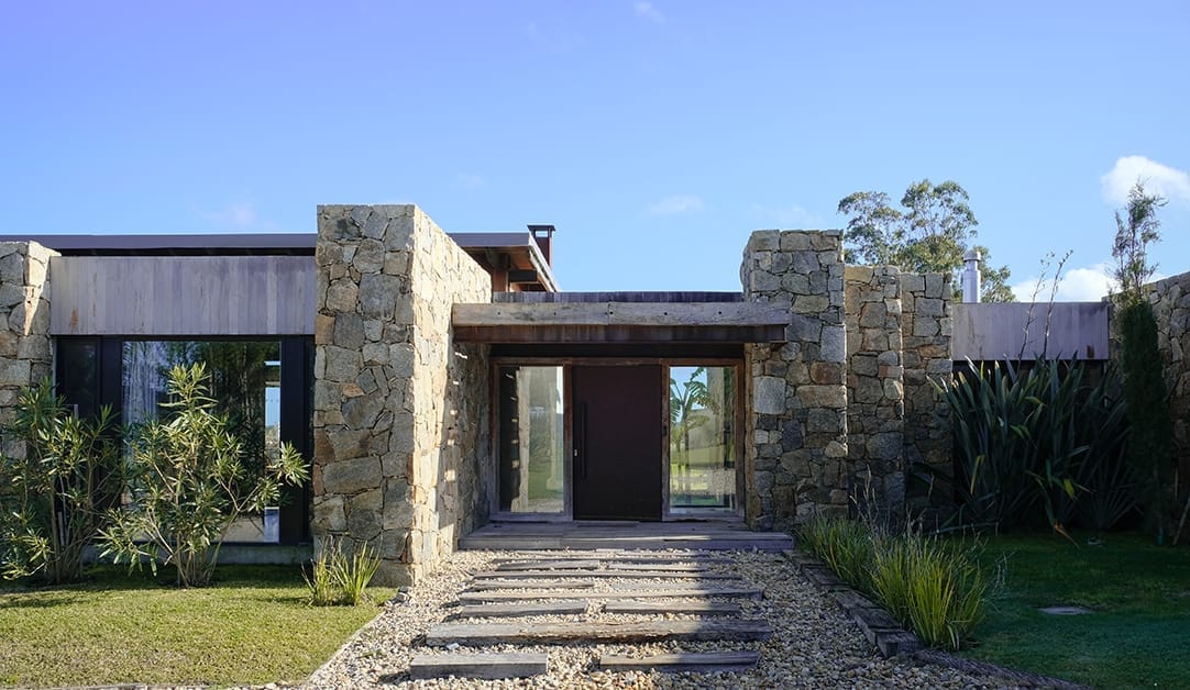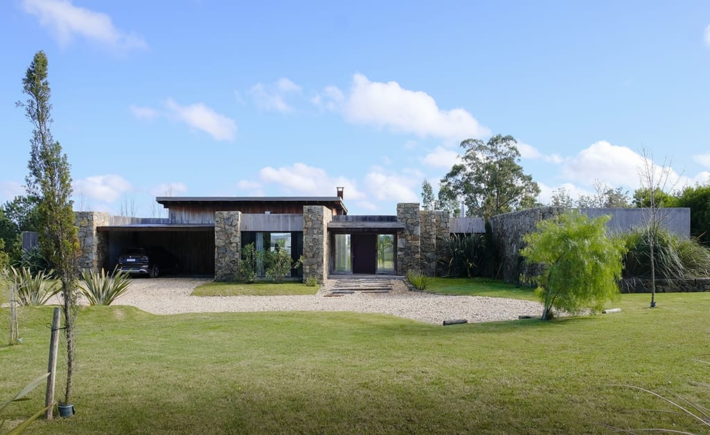 Los detalles en hierro imprimen carácter al diseño de estos espacios, los perfiles estructurales vistos, la chapa oxidada de la estufa y la gran puerta de entrada. El vidrio será también protagonista de estos interiores, introduciendo la luz, el color de los jardines y la textura de la piedra a los espacios y recorridos de la casa. El Estudio Algorta Carrau vive una etapa de desarrollo y crecimiento que incorpora la activa participación de los arquitectos Diego y Santiago Facio Russo, que aportan a la ya consagrada mirada de su titular, Diego Algorta Carrau.