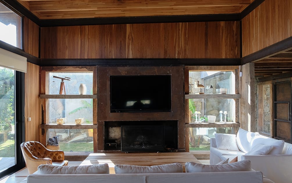 El sistema constructivo elegido y los materiales utilizados responden directamente a este paisaje, la estructura es el resultado de una combinación entre perfilería de hierro y muros portantes de ladrillo, los cerramientos verticales incorporan el ladrillo, la madera y el vidrio. Los acabados exteriores revelan el sistema constructivo, revestimientos de lapacho para todo lo que es montaje de muros livianos y estructura de hierro, y grandes paredes de piedra terminan los muros portantes de ladrillo. La elección y uso de estos materiales, además de implicar poco mantenimiento, da como resultado una casa que envejece con imagen muy noble, el óxido del hierro, el lapacho y la piedra dan carácter a un importante juego de volúmenes que generan luces y sombras contrastantes y en constante movimiento durante el día. Las terminaciones interiores suman al ambiente cálido buscado, el pavimento en paños de hormigón lustrado entre juntas de madera, muros y tabiques de madera y ladrillo con junta enrasada pintados, cubierta con estructura de madera a la vista, vigas y cielorraso de madera.