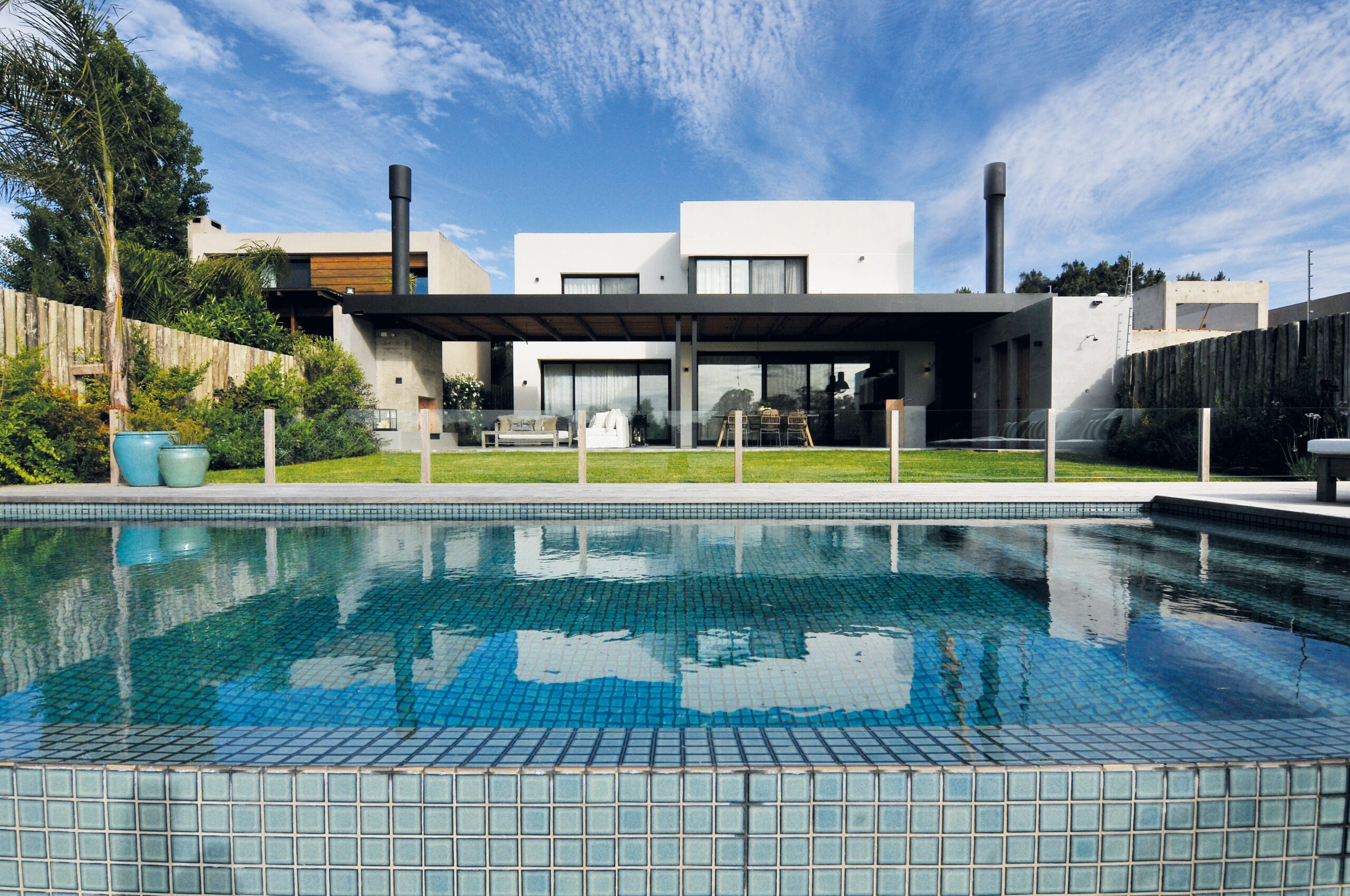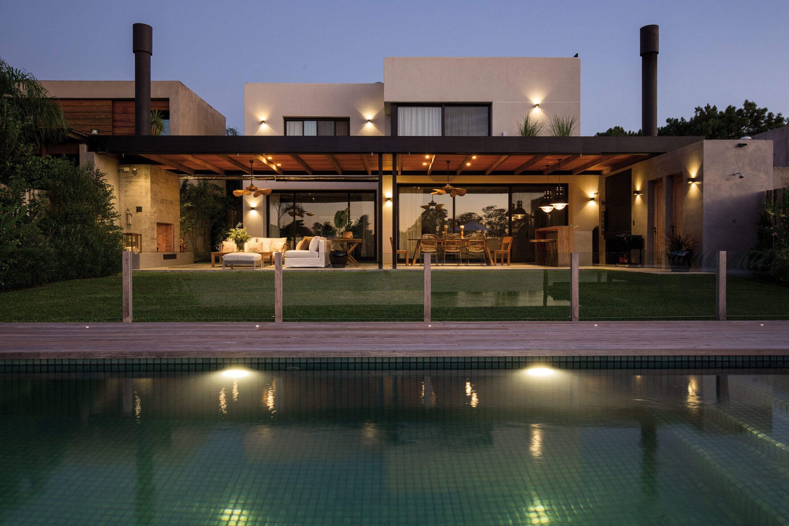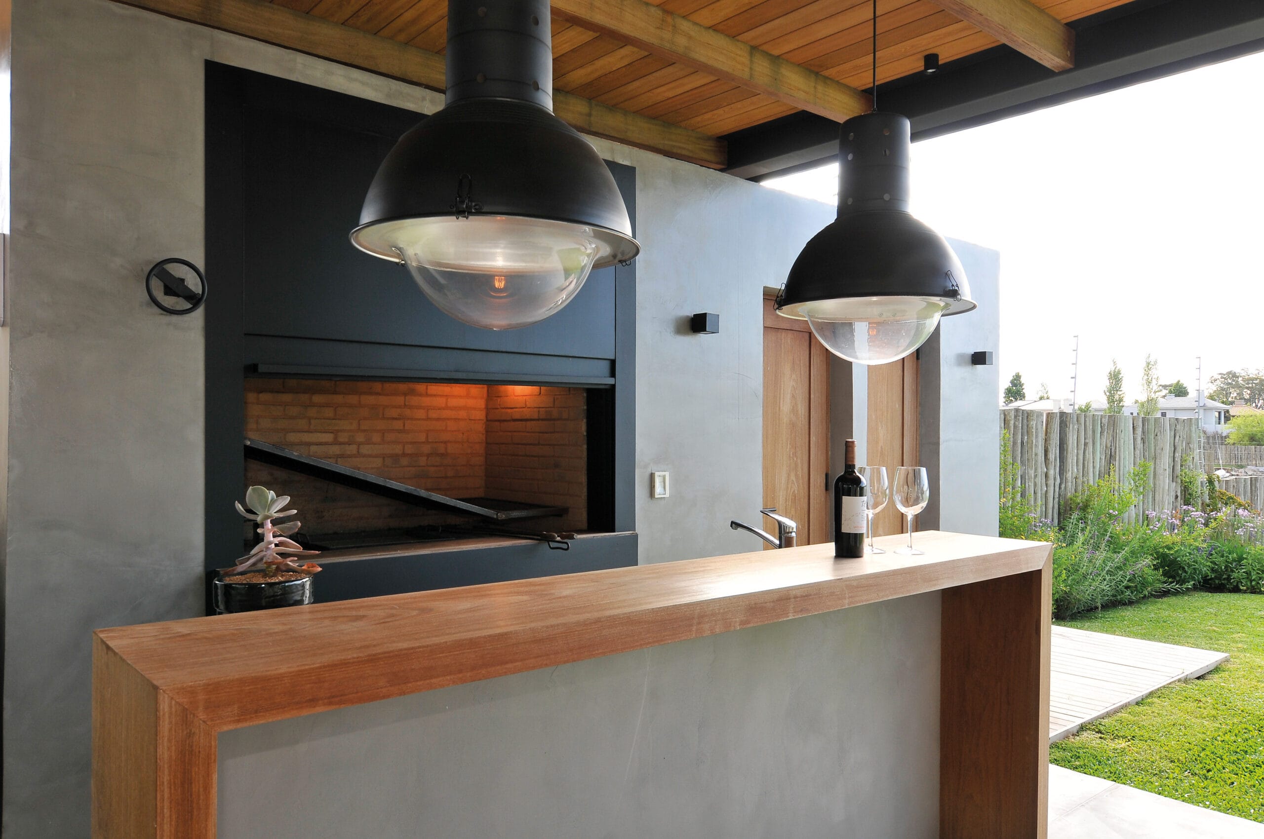 El hormigón visto empleado en los volúmenes del parrillero y el hogar exterior, coronados con un gran alero de hierro volado aporta mucho al dialogo plástico que la casa propone desde sus fachadas. El espacio resultante está flanqueado en el lateral por un parrillero de chapa y un hogar de hormigón visto. Se apoya en las medianeras, ocupando así todo el largo de la casa en su fachada posterior y desde su condición de espacio techado y semi abierto permite que el ambiente sea utilizable durante todo el año a partir de su multiplicidad de usos, living, comedor y estar y fundamentalmente de la riqueza que propone su plena integración al jardín y el lago.