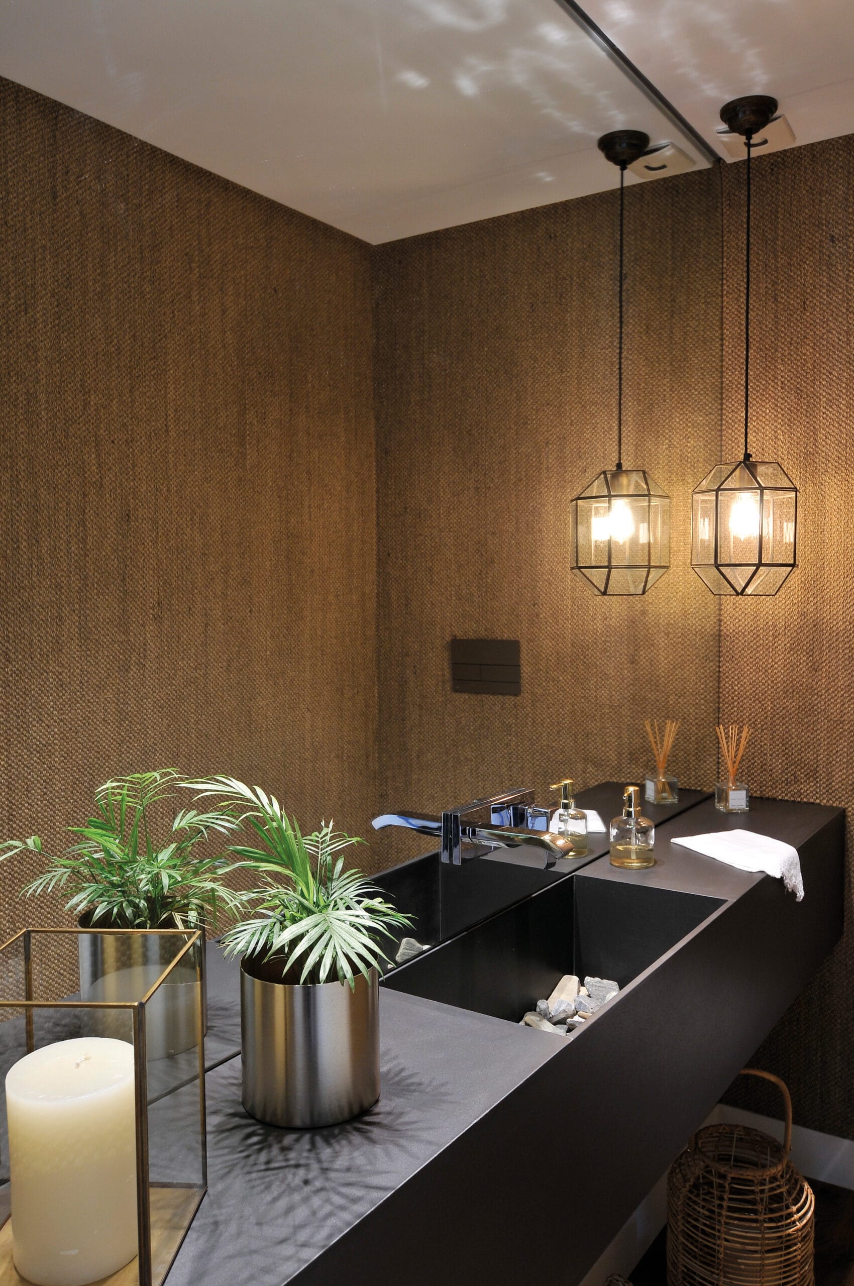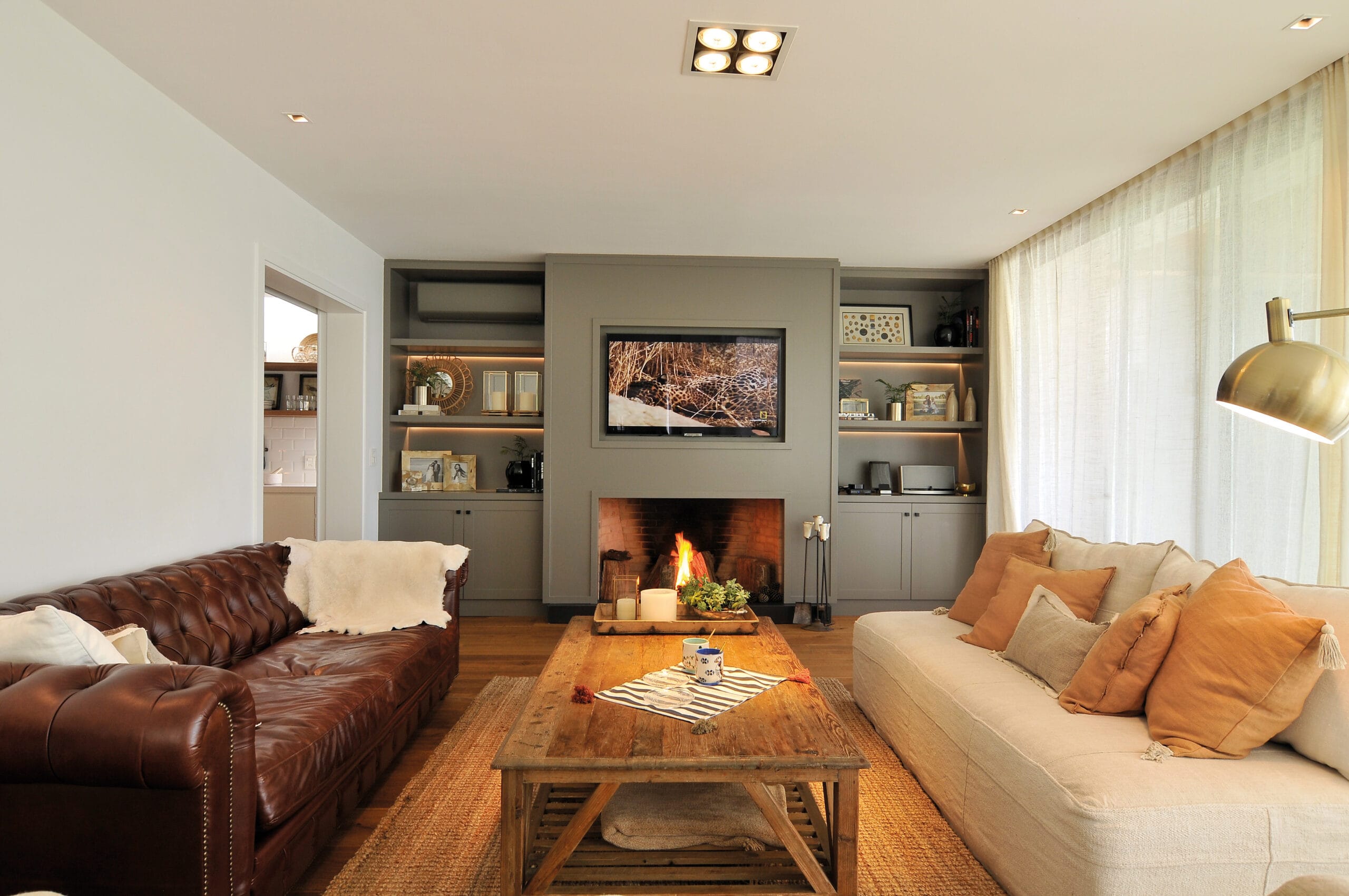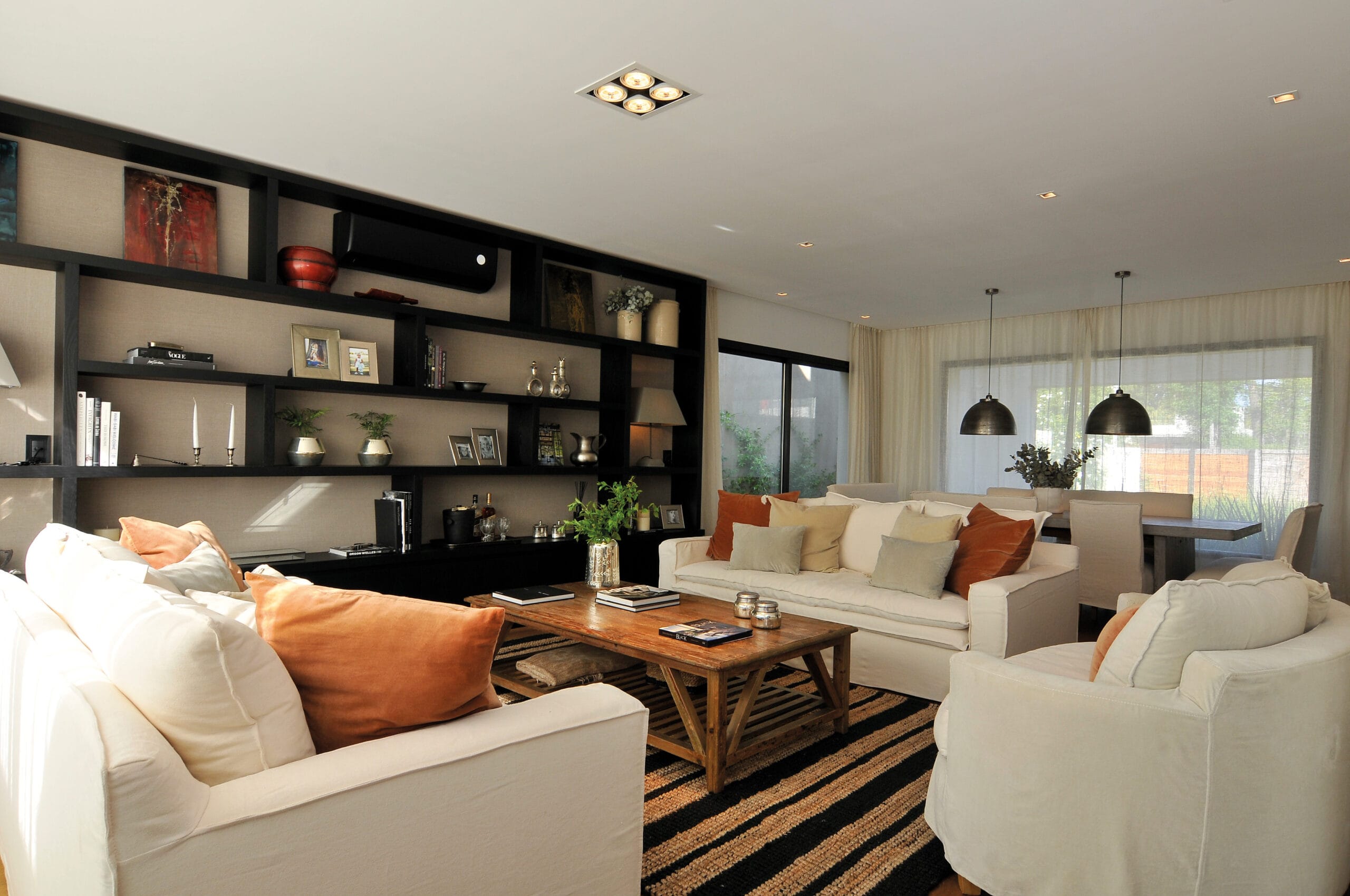 El hormigón visto empleado en los volúmenes del parrillero y el hogar exterior, coronados con un gran alero de hierro volado aporta mucho al dialogo plástico que la casa propone desde sus fachadas. El espacio resultante está flanqueado en el lateral por un parrillero de chapa y un hogar de hormigón visto. Se apoya en las medianeras, ocupando así todo el largo de la casa en su fachada posterior y desde su condición de espacio techado y semi abierto permite que el ambiente sea utilizable durante todo el año a partir de su multiplicidad de usos, living, comedor y estar y fundamentalmente de la riqueza que propone su plena integración al jardín y el lago.