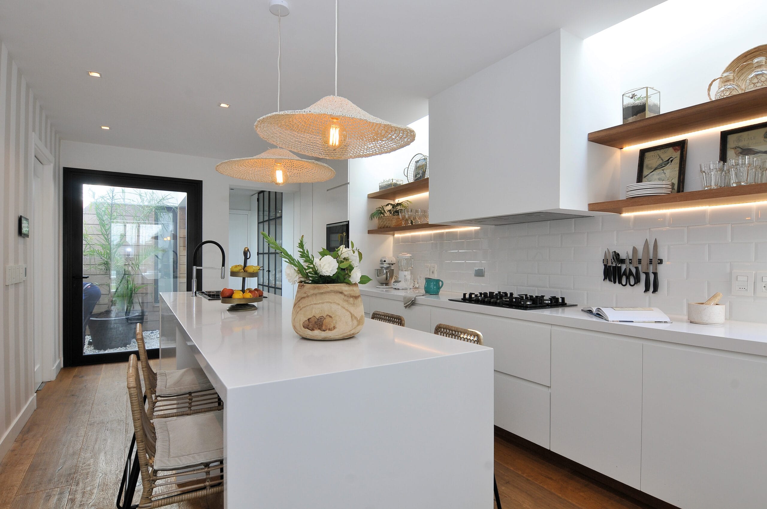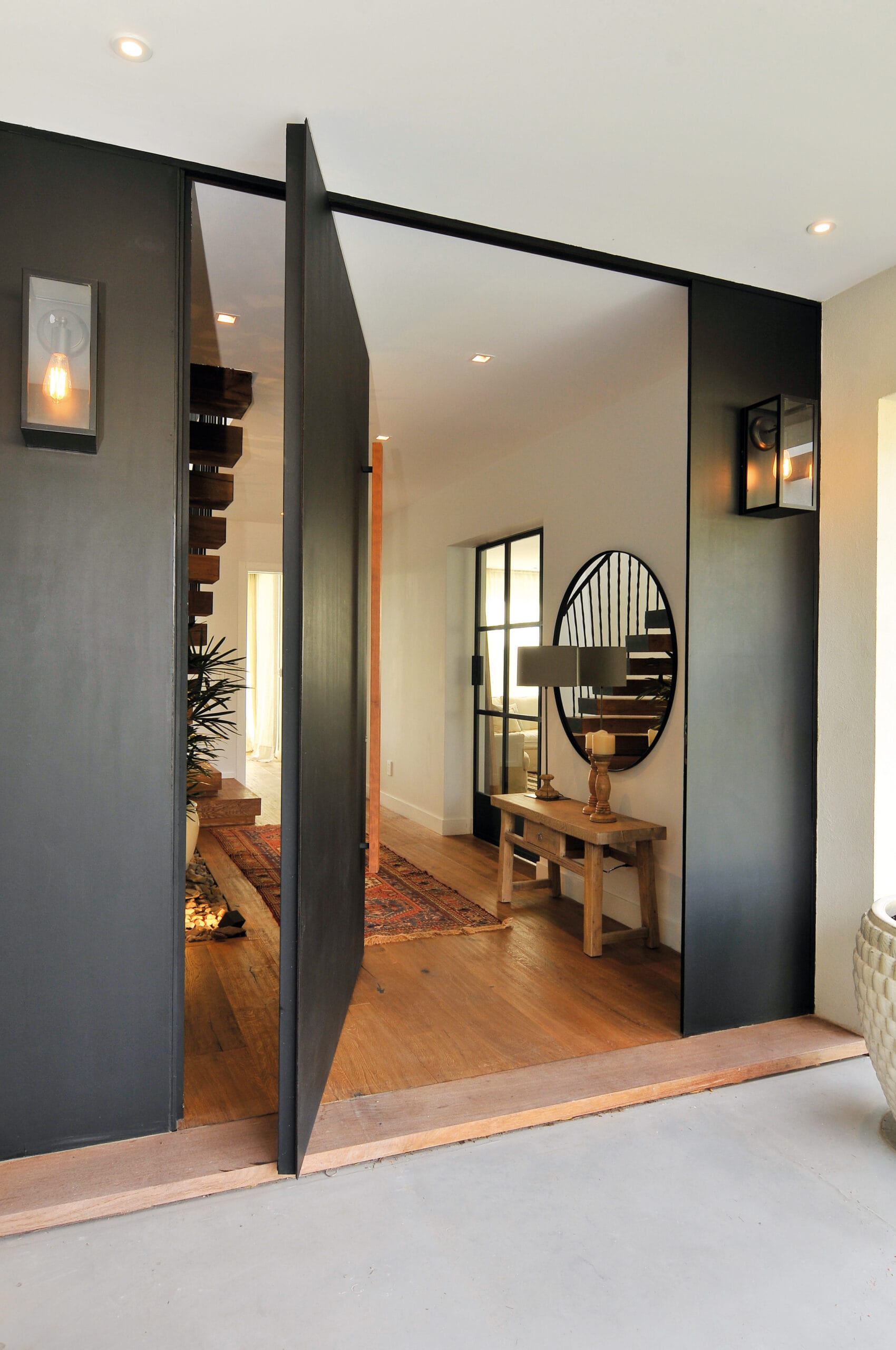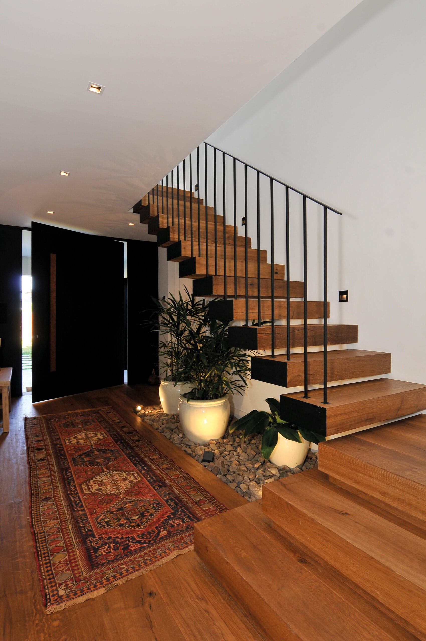 Una de las premisas básicas del proyecto consistía en lograr que todos los ambientes contaran con vistas hacia el lago. El terreno, con sus quince metros de frente y un retiro lateral condicionaban al proyecto pero a partir de esa limitación el proyecto se enriqueció. Ese retiro lateral, con orientación norte, fue aprovechado para el mejor asoleamiento del living comedor ubicado en la planta baja y también para el baño de la planta alta. A la vez esa calle interior permitió generar una comunicación directa desde el frente hacia el fondo del terreno sin necesidad de ingresar a la casa.