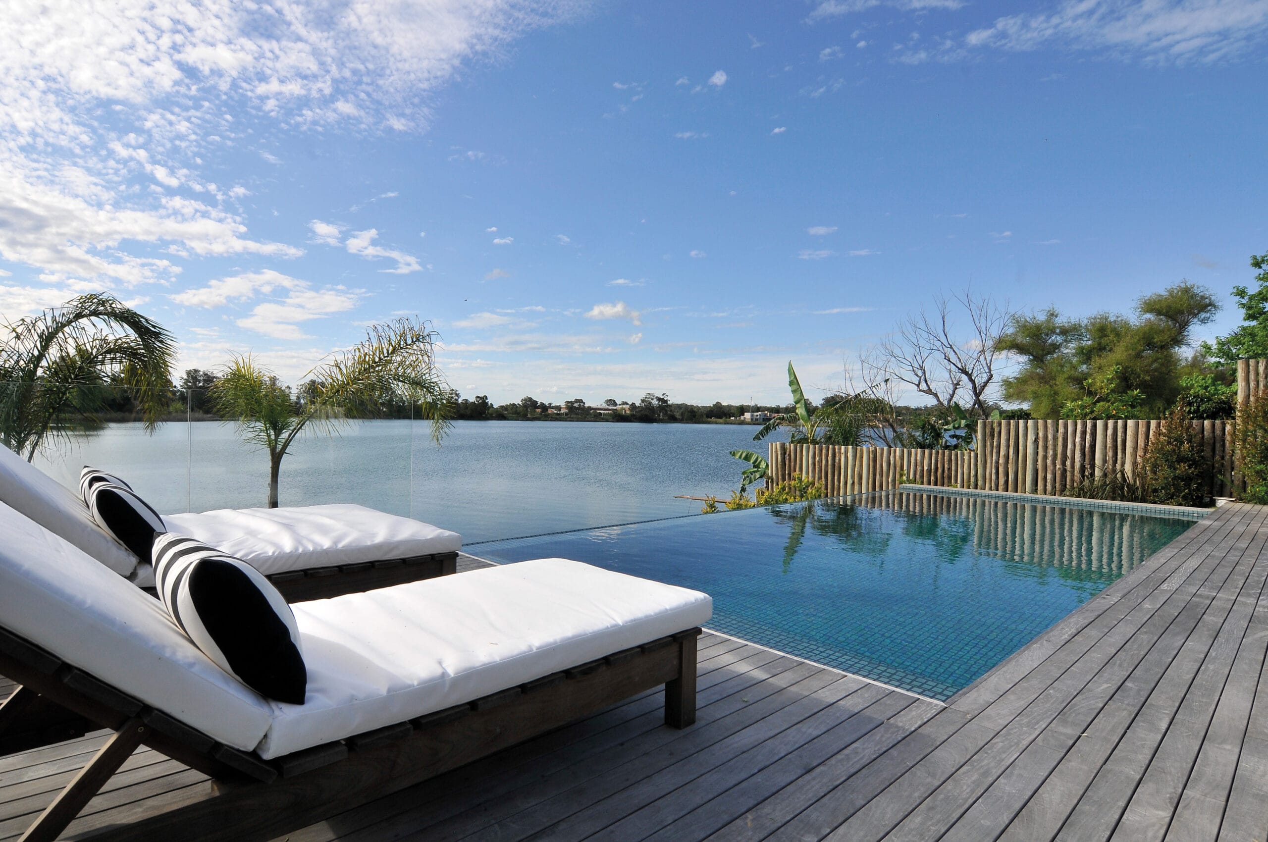 El Estudio Butler Zambrano participó con el habitante en la elección del lote. El proceso creativo resultó entonces enriquecido con las primeras impresiones y por supuesto con evaluaciones singulares acerca de las posibilidades. La opción entre dos solares linderos y con rivera hacia la laguna permitió que los Arquitectos evaluaran orientaciones, niveles de altura y optaran por la tierra que mejor se relacionaba con el proyecto que ya tenían en mente y guardaba directa relación con el paisaje de la urbanización y con el carácter que ese paisaje instalaba. La orientación del terreno escogido con el fondo orientado hacia el oeste y con rivera sobre un gran lago alimentó la idea de generar importantes ambientes exteriores que gozaran de maravillosas vistas y se enriquecieran con puestas de sol sobre una piscina de borde infinito, sobre elevada respecto al nivel del lago.