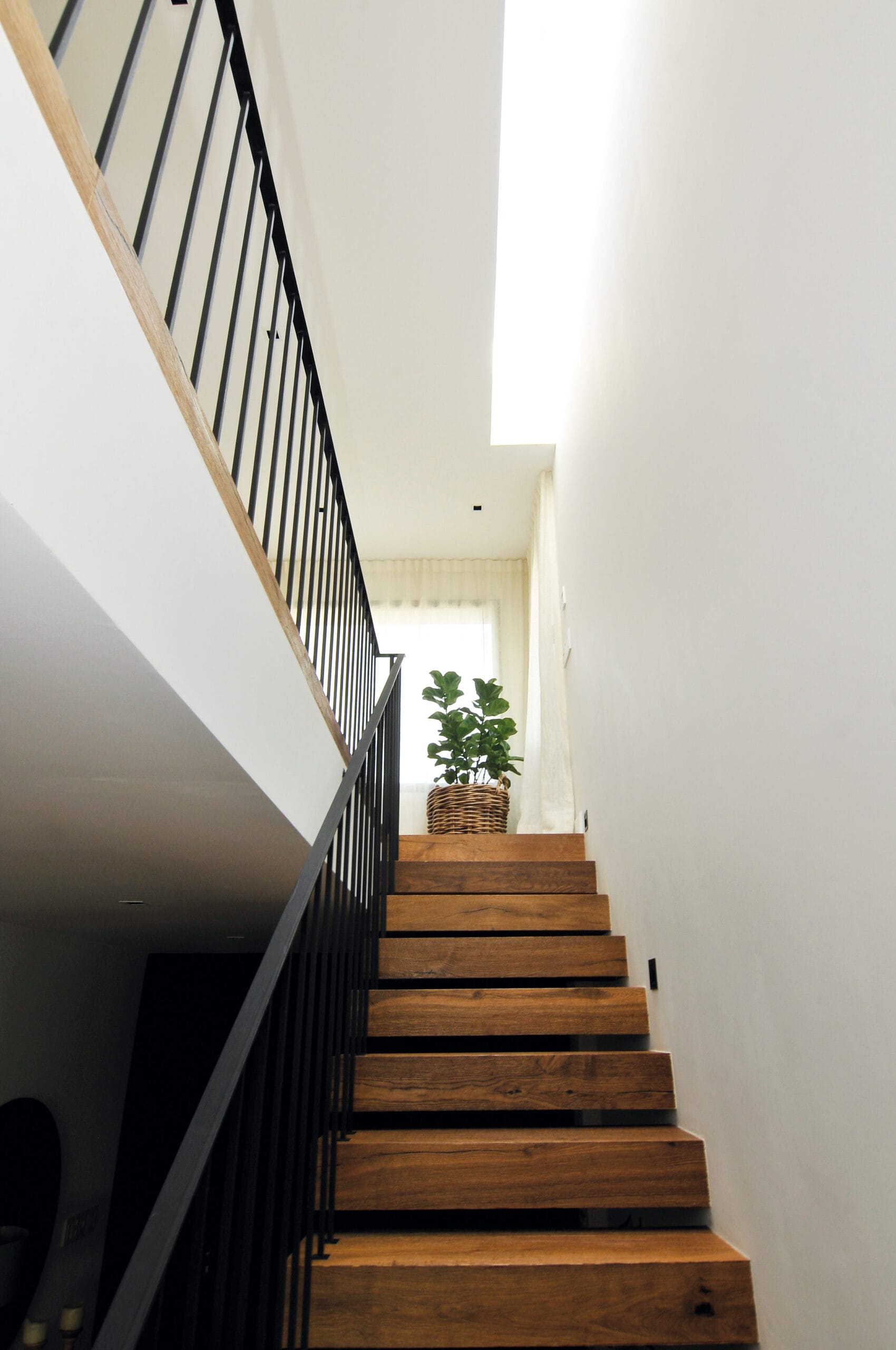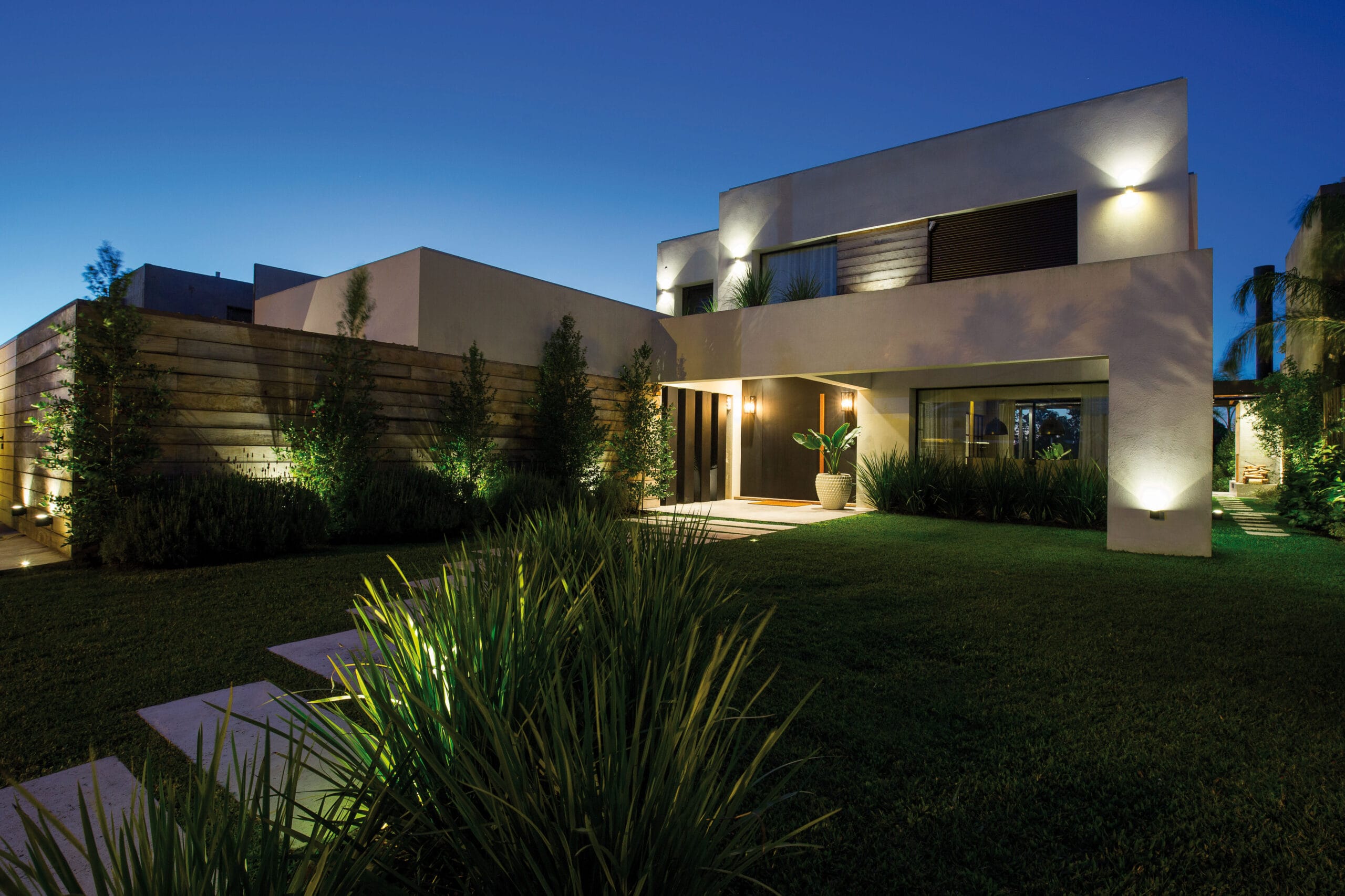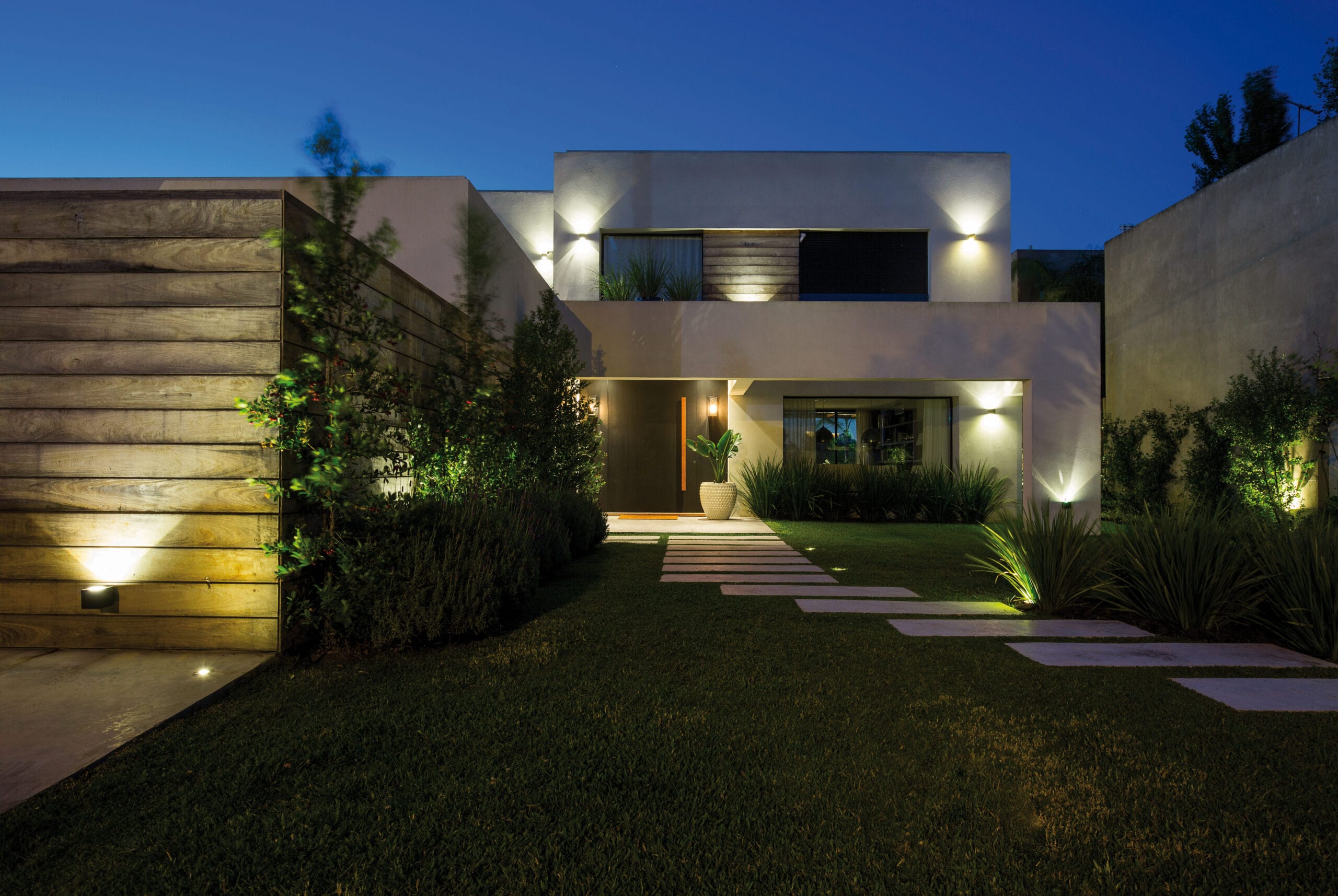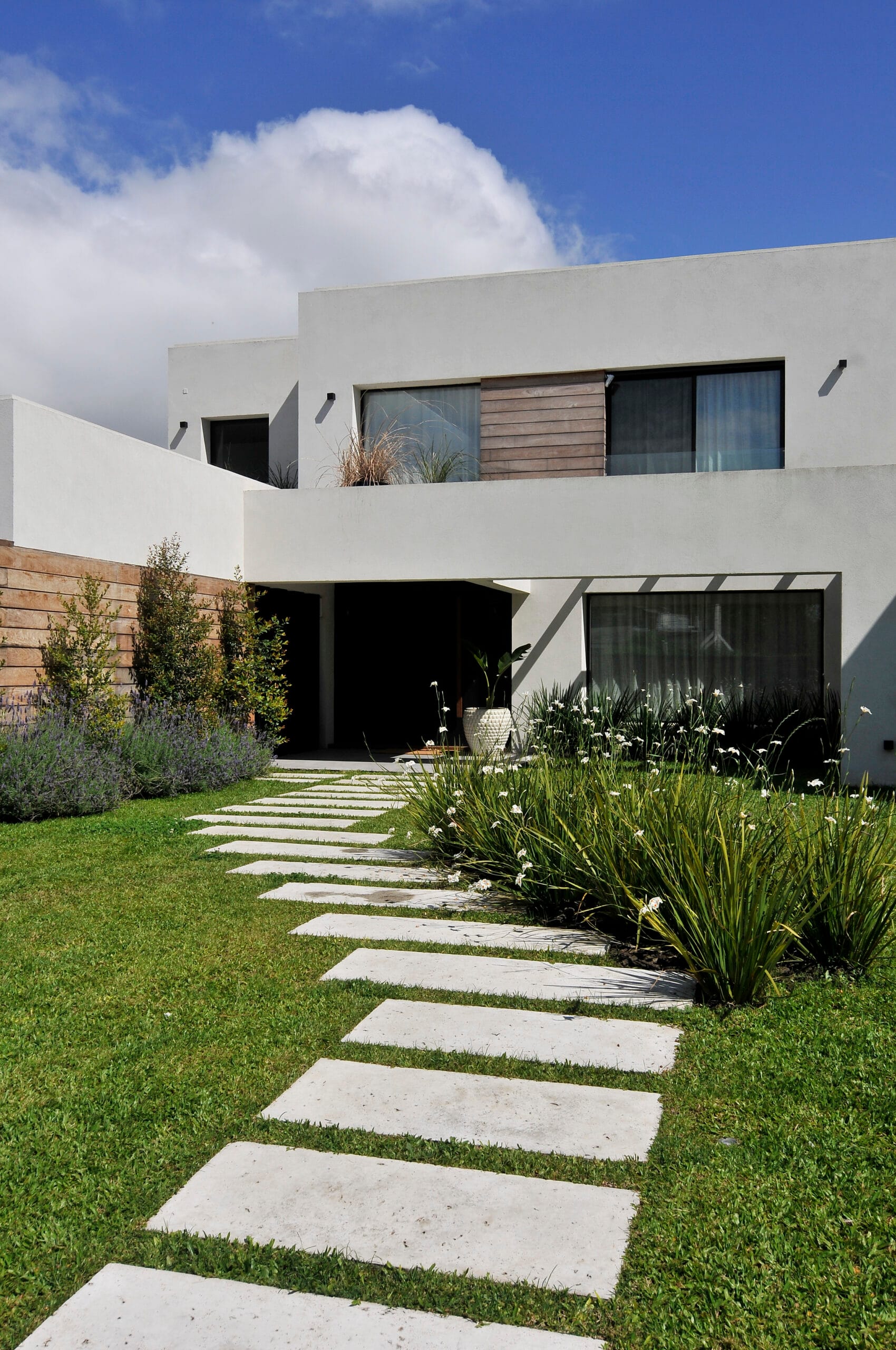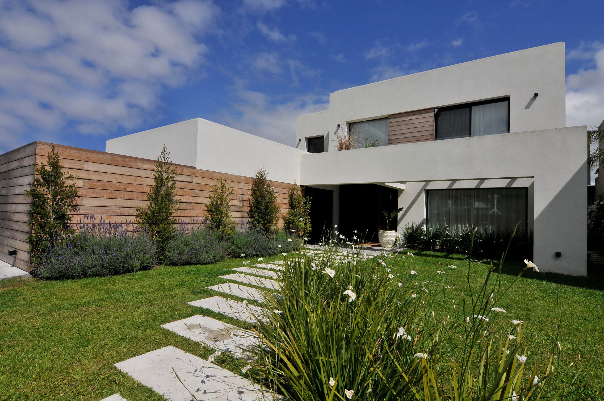 La volumetría de la casa formada por líneas rectas, jerarquiza las líneas horizontales, con tablas de madera que revisten en parte la fachada. El revestimiento de madera empieza en el frente, como cerco del tender y continua remarcando el volumen del área de servicio. Revoques con acabado texturado natural liso que asigna planos neutros y realzan los planos revestidos con madera y también el hierro empleado en otros tramos de la fachada, aleros, puerta principal y cercos.