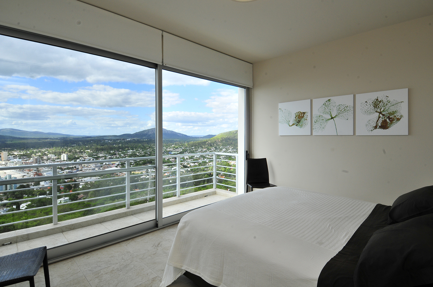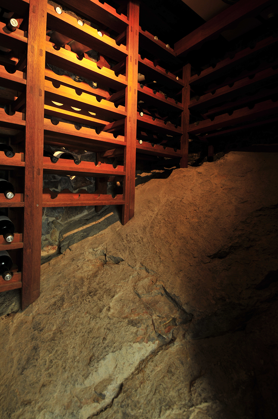 La suite principal con vestidor como el resto de los dormitorios es simple y cómoda, donde la vista es el elemento principal. Se destaca un hogar el cual se comunica a su vez con el baño contiguo. La cabecera hecha a medida por Cassoni es de láminas de palisandro al igual que la mayoría de los muebles de la propiedad. Siguiendo las mismas líneas y tonos que en el resto de la casa, el baño luce apliques de vidrio en tonos azules de origen artesanal al igual que la bacha, un jacuzzi doble ideal para el relax y un hogar que se comunica con la suite principal generando un ambiente único en días fríos. Un diván Le Corbusier dispuesto hacia la gran ventana invita a descansar. Dentro del garaje y continuando con la piedra que oficia de muro, se encuentra refugiada una pequeña cava poblada de bebidas que se mantienen y hasta evolucionan a partir de la temperatura ideal que propone la piedra.