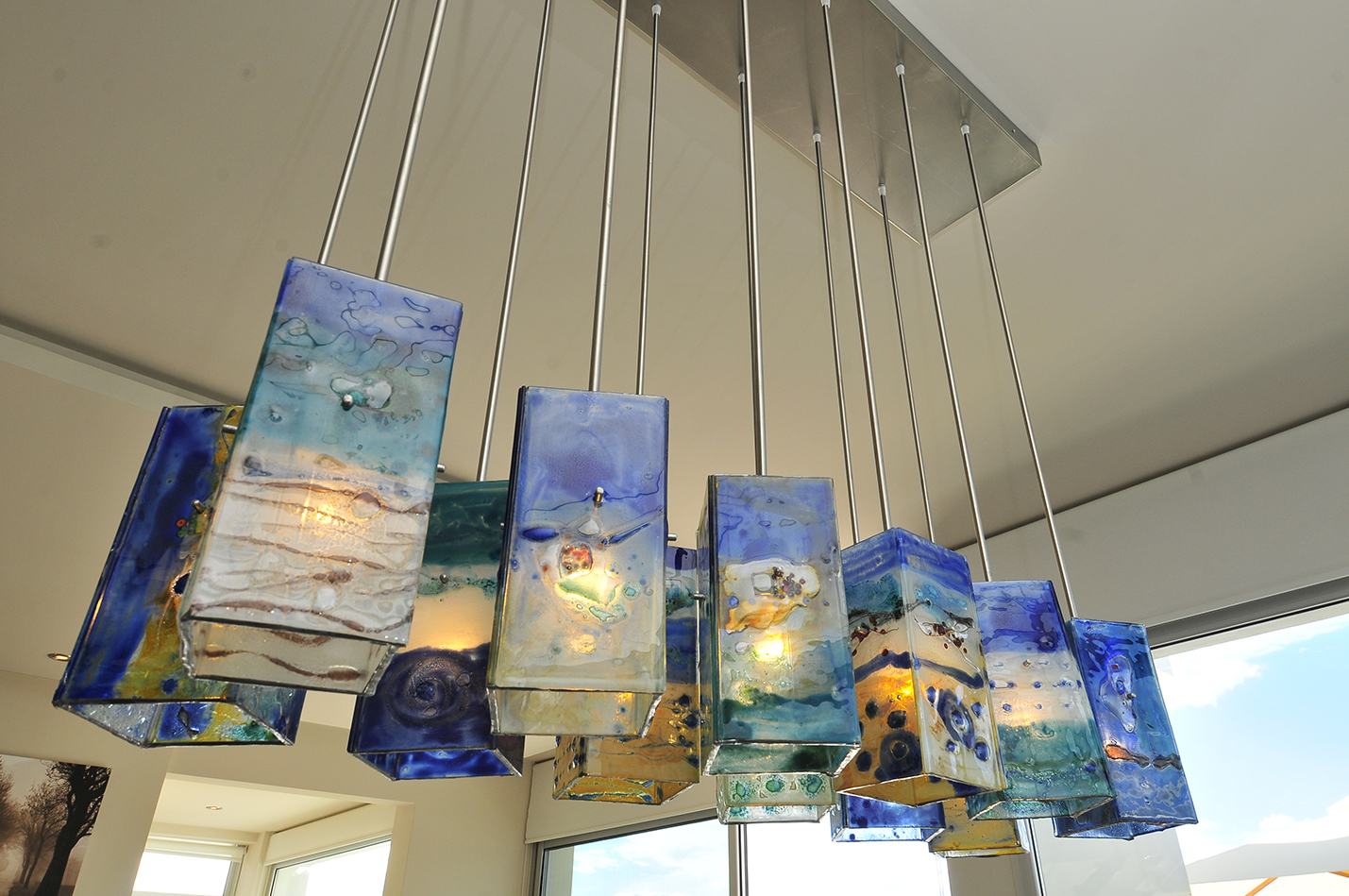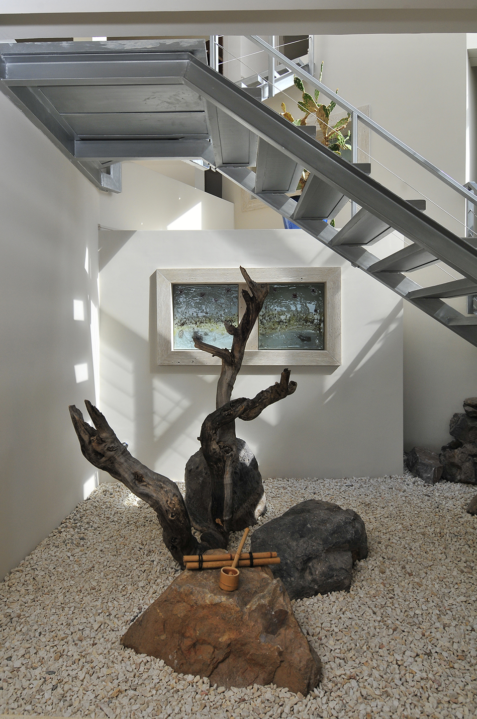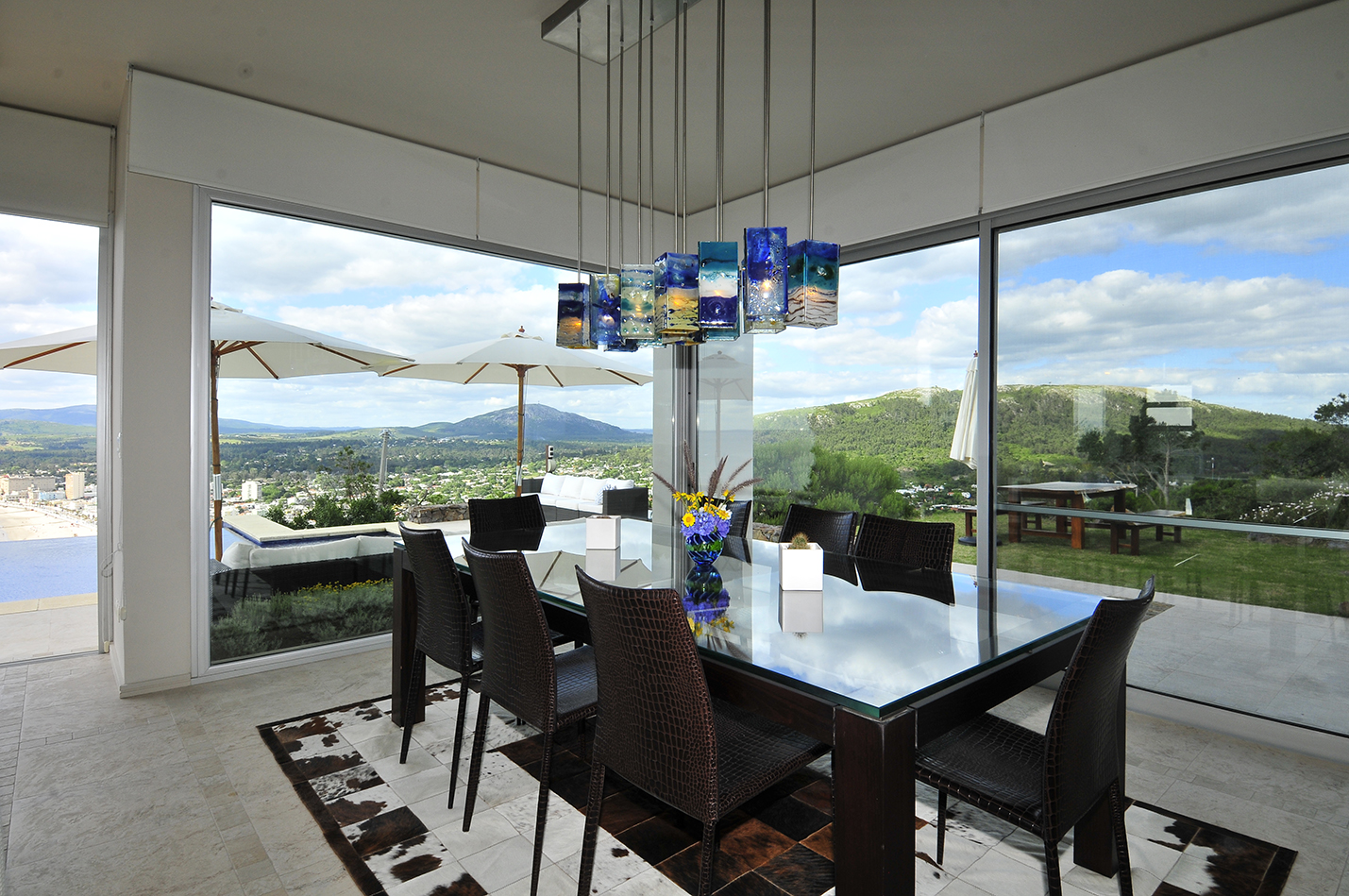 En el comedor la luminaria creada por la artesana Magdalena Díaz construida en vidrio de color establece un singular contraste con lo moderno del mobiliario y con los tonos blancos que predominan casi por completo. La escalera revestida en Travertino, oficia como espacio integrador entre ambas plantas, utiliza un requisito fundamental, contener amplias vistas tras techo y muro de vidrio. El sector debajo de la escalera opera como sitio expositor, en este caso se dispone una rama de árbol seco, rodeada por piedras blancas creando un espacio único. Más atrás, sobre la pared posterior se encuentra el trabajo realizado en vidrio por la artesana Magdalena Díaz.