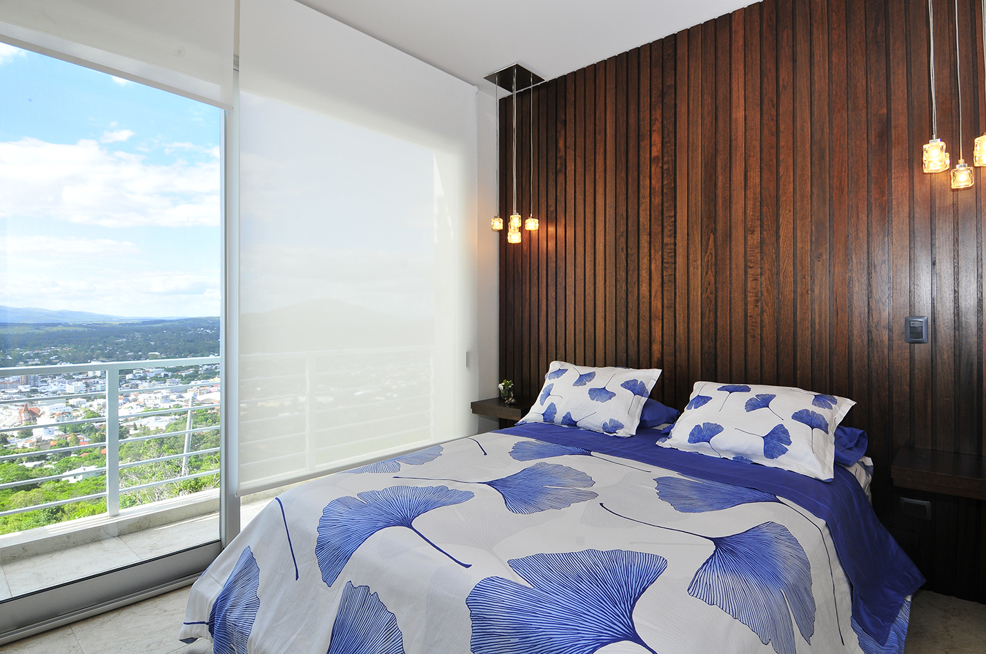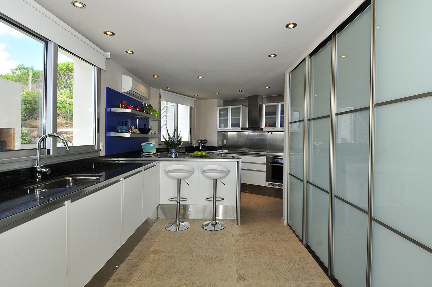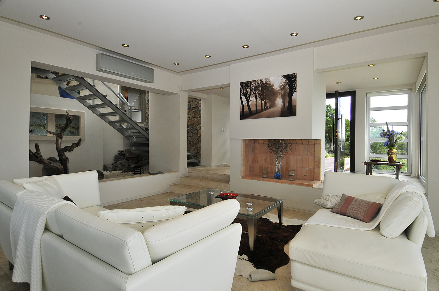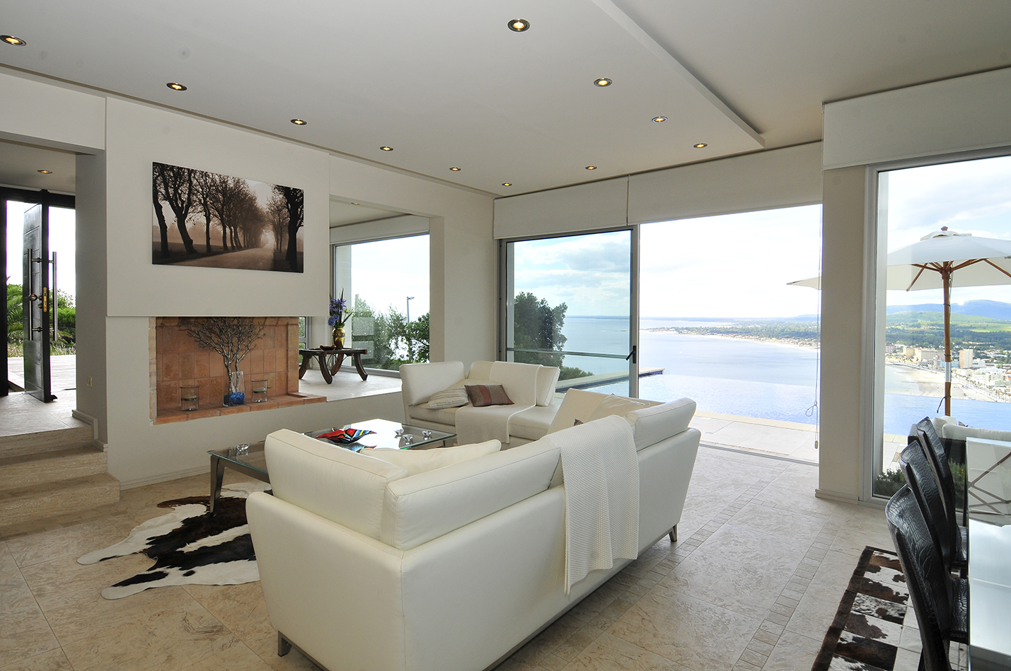 En un ambiente integrado se dispone el living, el comedor y la cocina, diseñado estratégicamente para compartir y aprovechar al máximo las vistas que ofrece hacia el mar y las sierras, generando un espacio abierto, transparente. Este espacio conecta directamente con la terraza que se extiende hasta la piscina. Los muebles se encuentran en perfecta sintonía con la arquitectura, son diseños exclusivos hechos a medida por Cassoni, conciben un ambiente moderno y despojado. En el living, el hogar funciona como bloque, generando dos espacios bien definidos, por un lado el área social y por otro el recibidor, delimitado a su vez por un desnivel. La magia de los distintos planos opera y aporta mucho a las atmósferas generadas en cada ambiente.