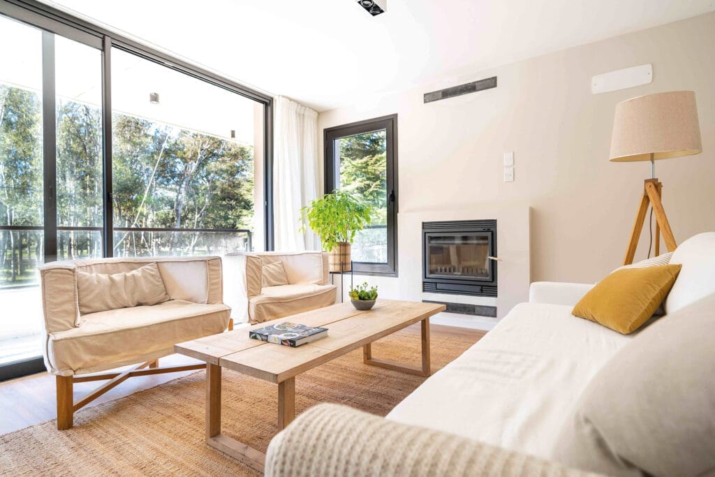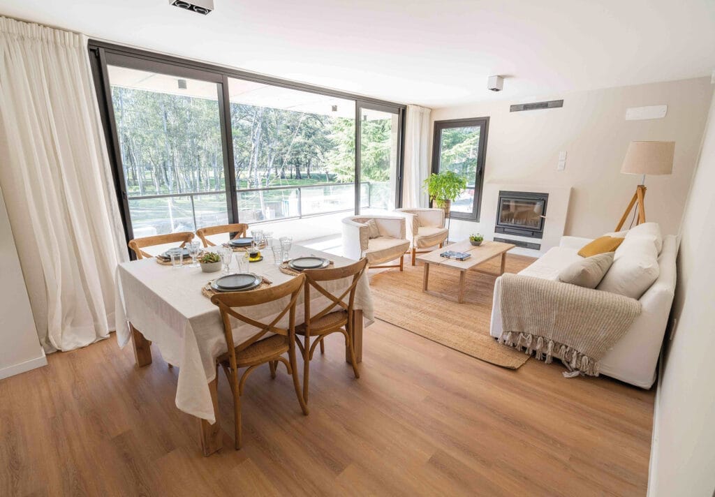 El edificio presenta un estilo contemporáneo orgánico, con dos grandes bloques que constituyen una estructura que se adosa a través del paisaje. Destaca el revestimiento en madera y la transparencia que ofrecen todas las unidades generando estrecho vínculo con el exterior y sus inmejorables vistas hacia el lago.
