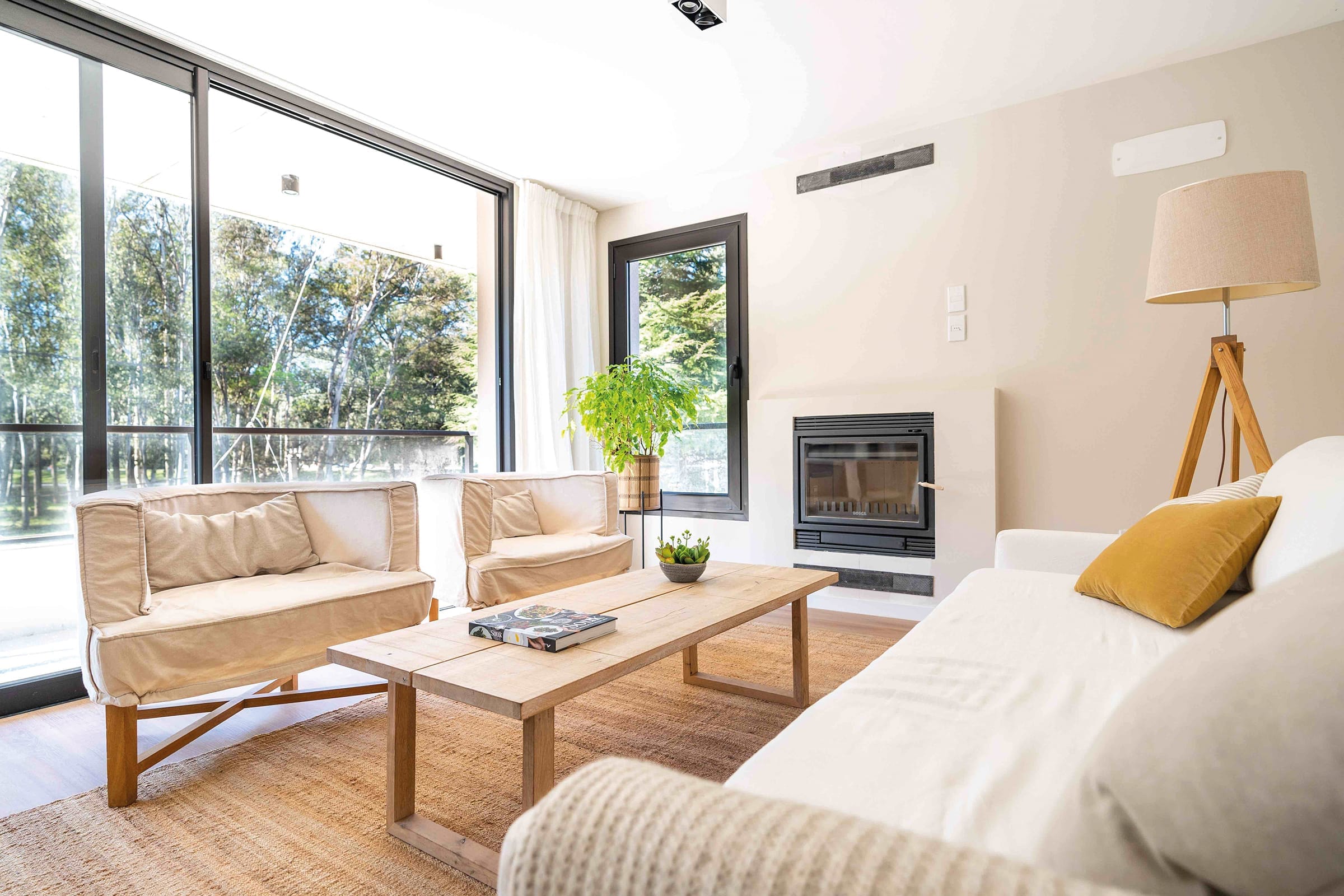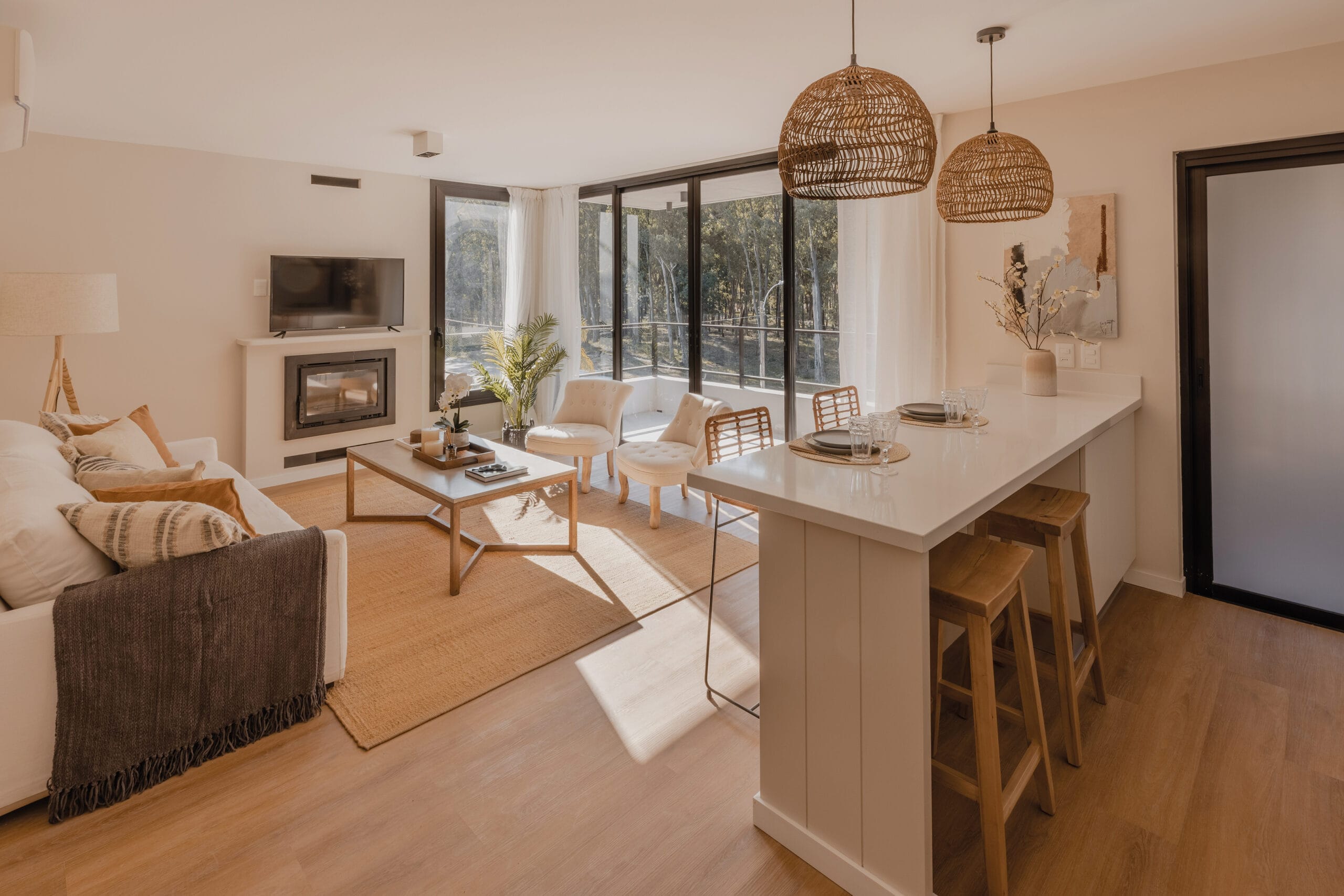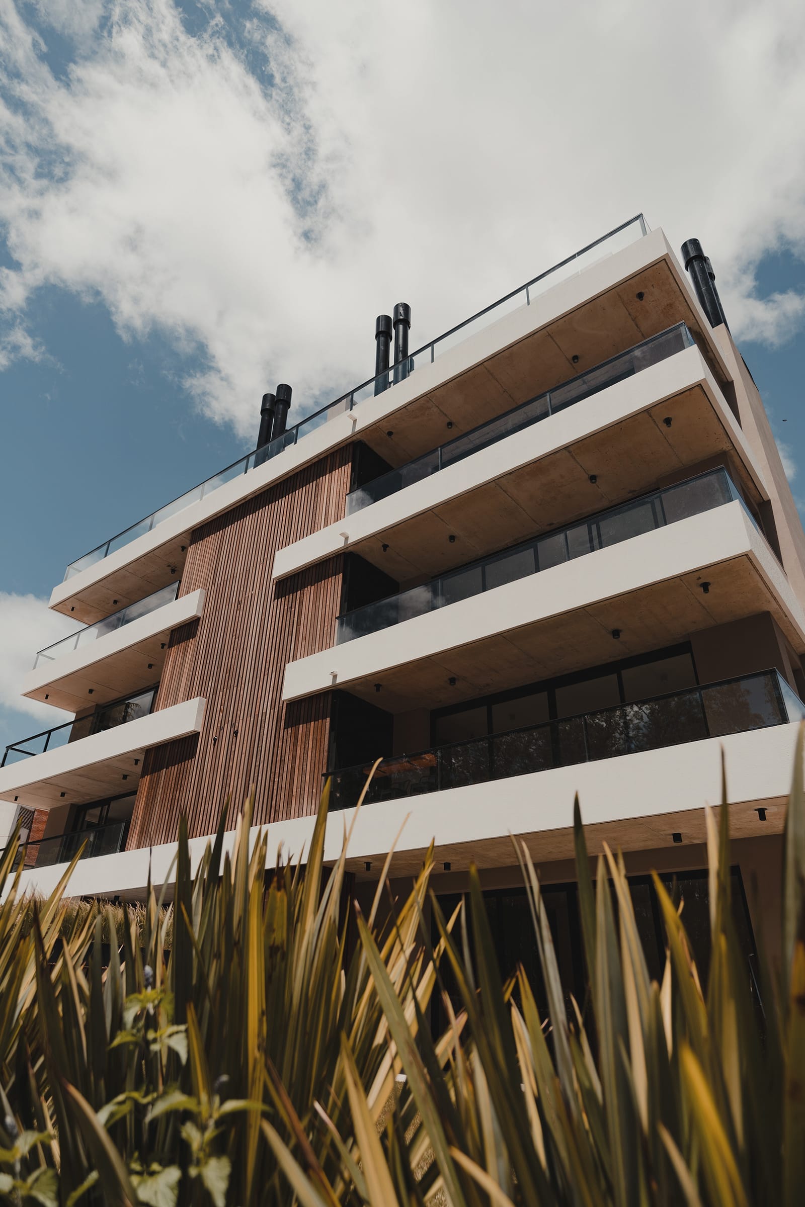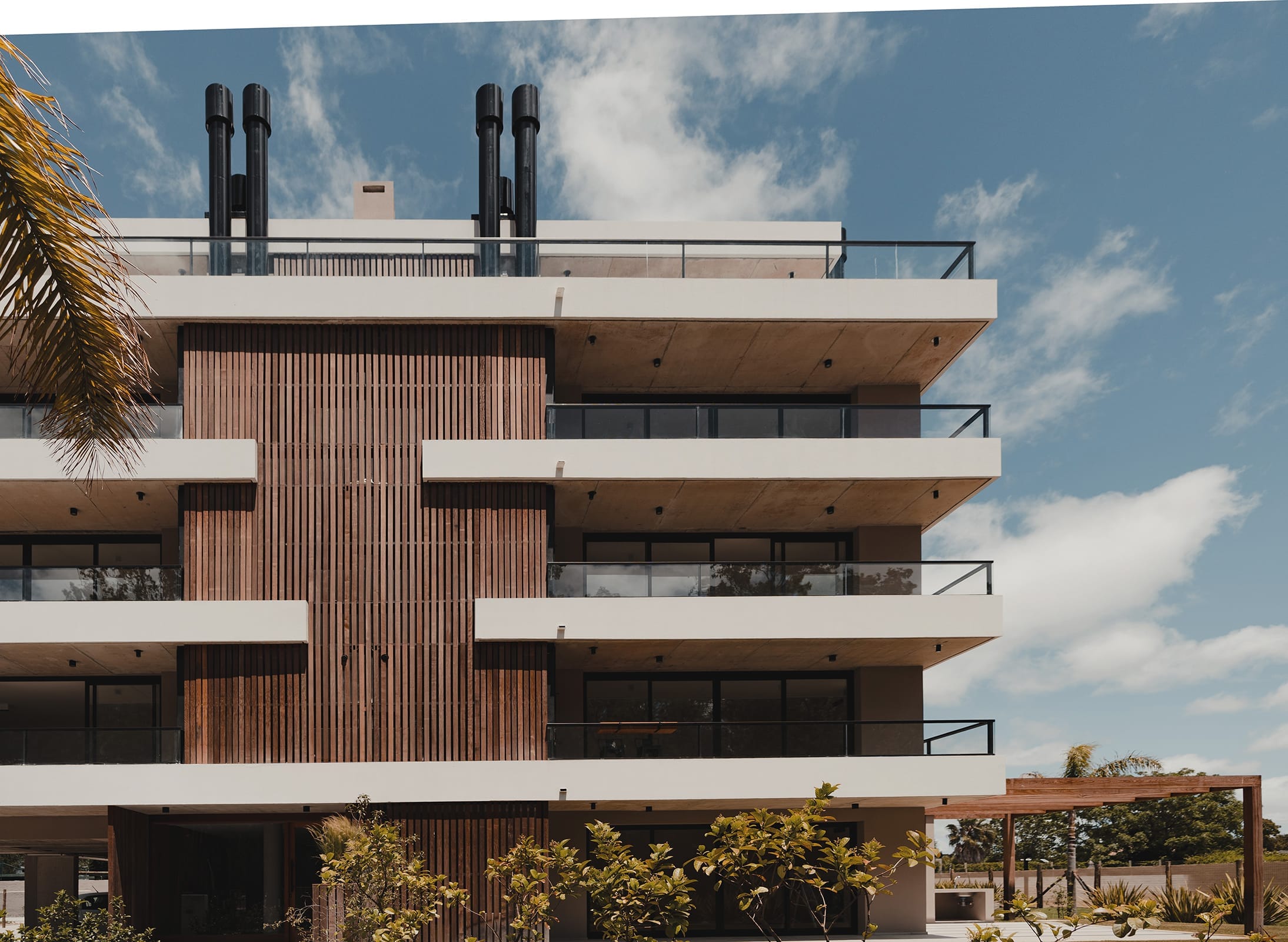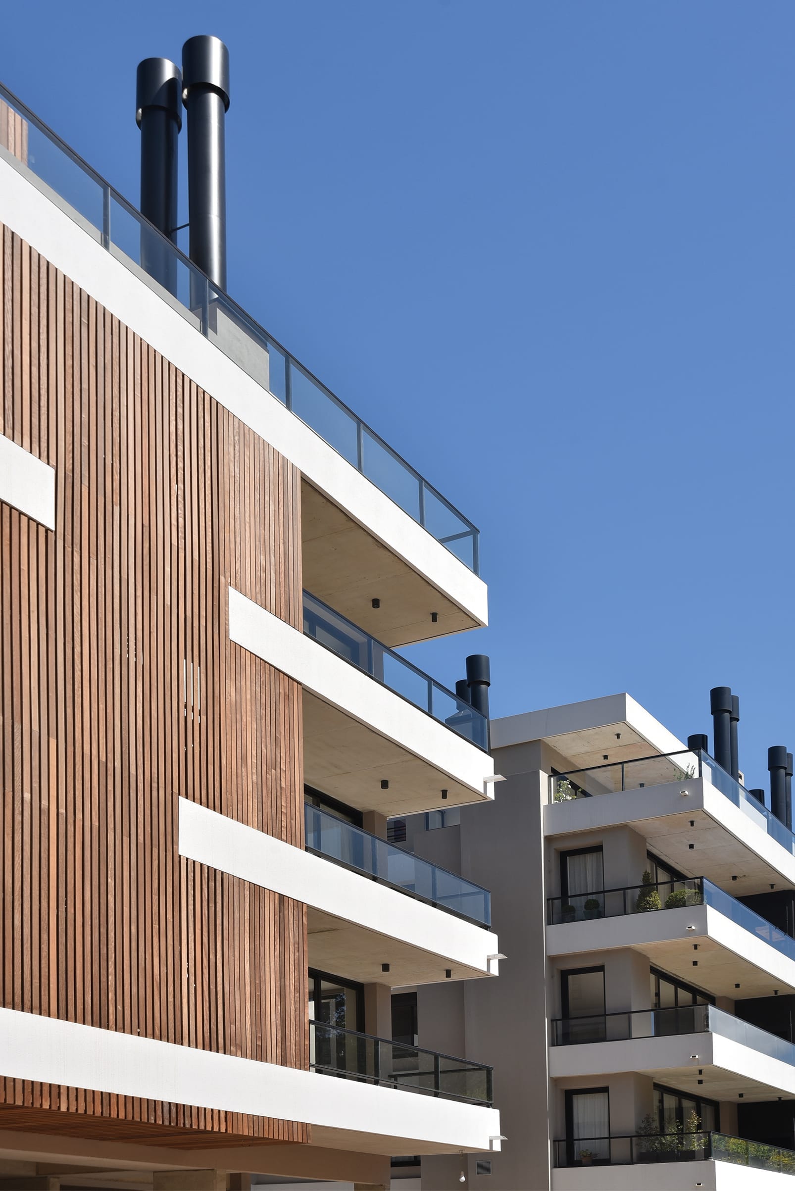 El edificio presenta un estilo contemporáneo orgánico, con dos grandes bloques que constituyen una estructura que se adosa a través del paisaje. Destaca el revestimiento en madera y la transparencia que ofrecen todas las unidades generando estrecho vínculo con el exterior y sus inmejorables vistas hacia el lago.