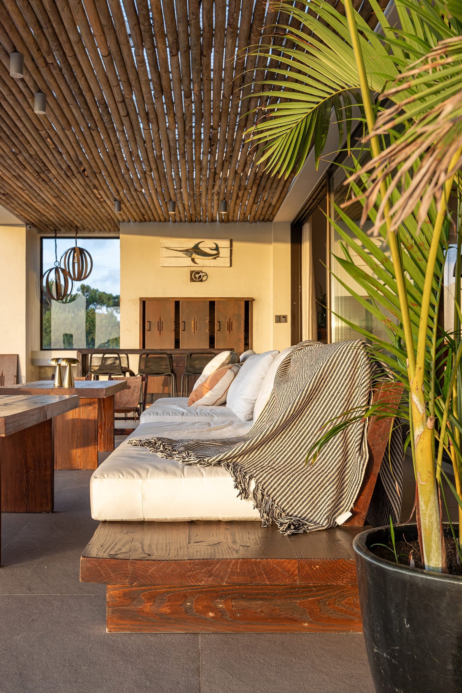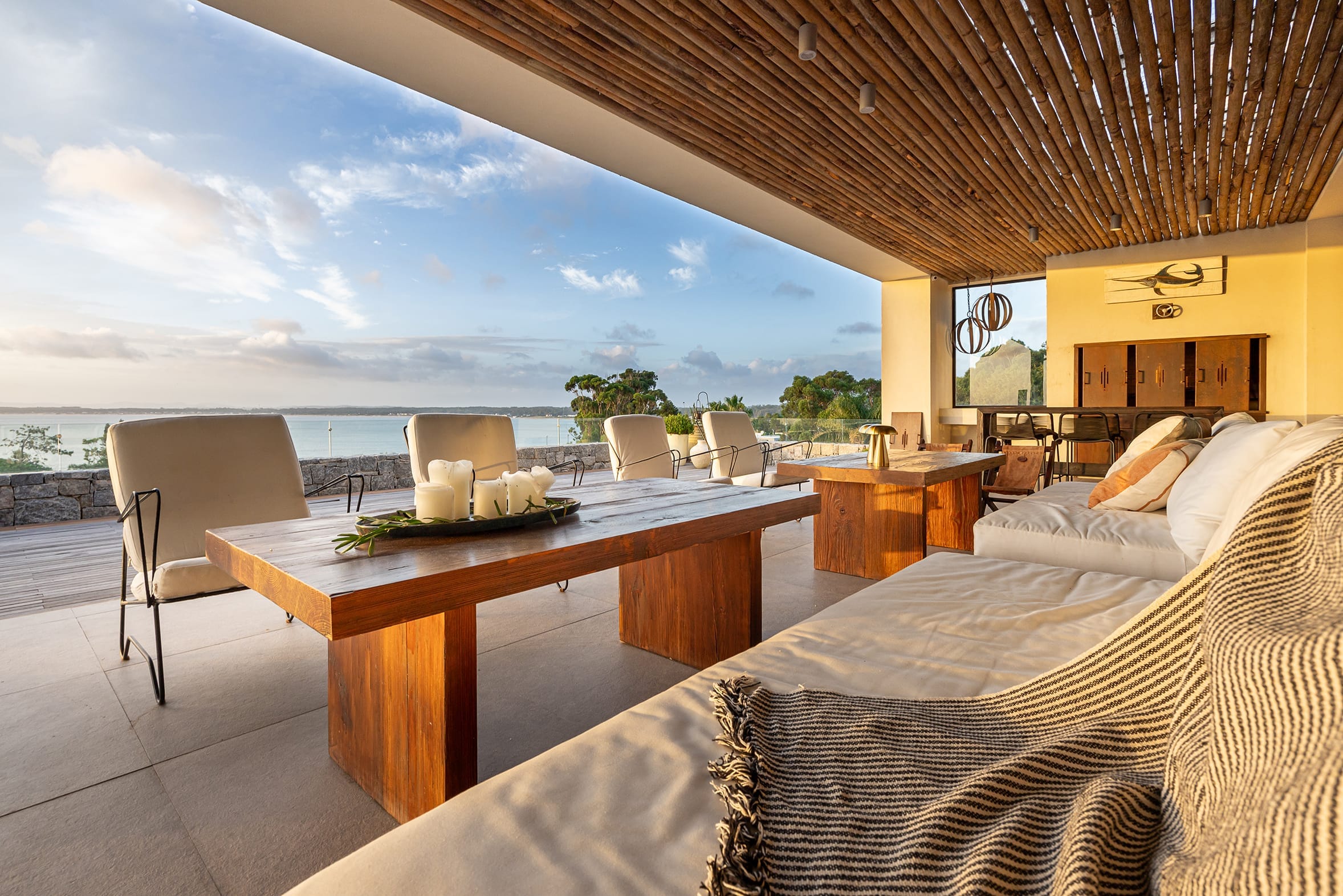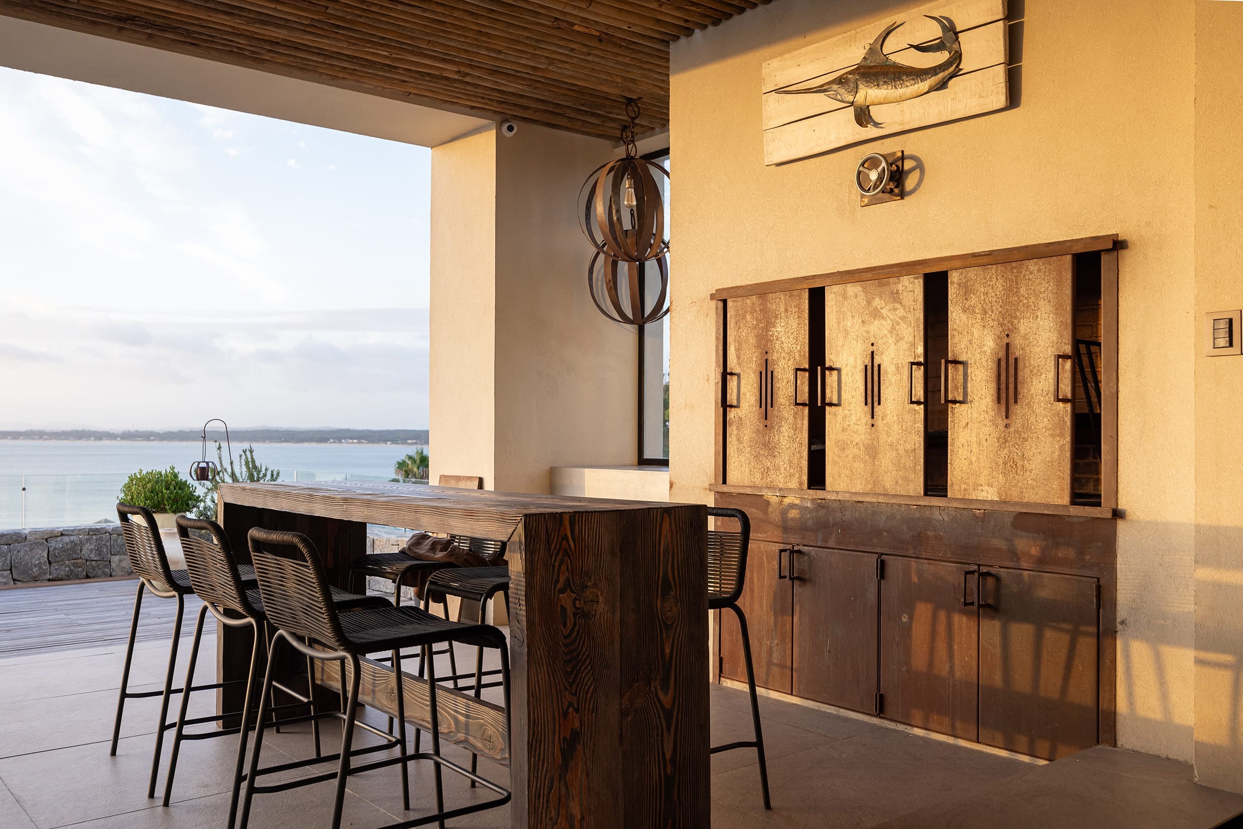 Una pérgola de material revestida con cerno de eucaliptus vuela sobre la gran terraza que recorre toda la fachada posterior, orientada hacia la bahía.