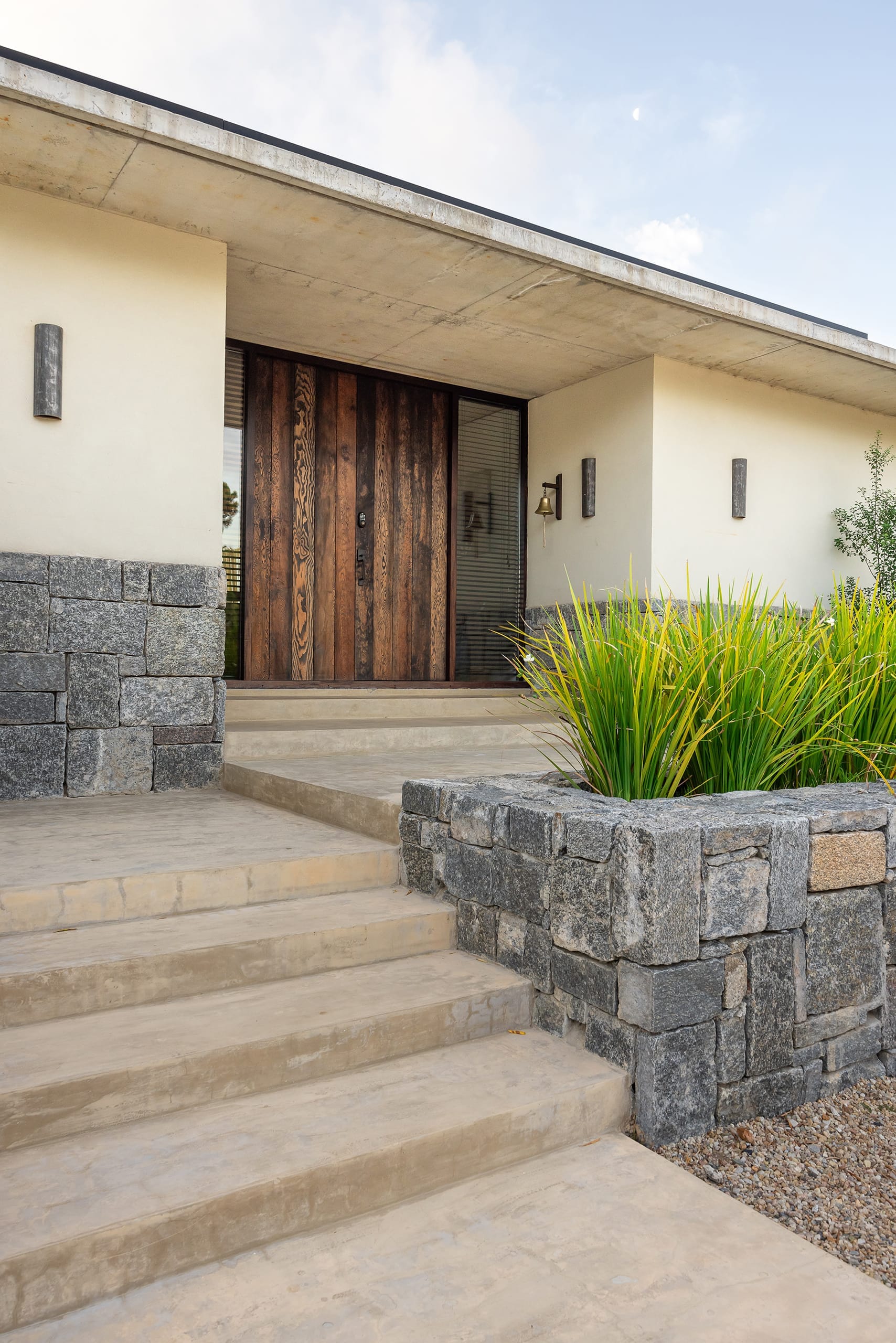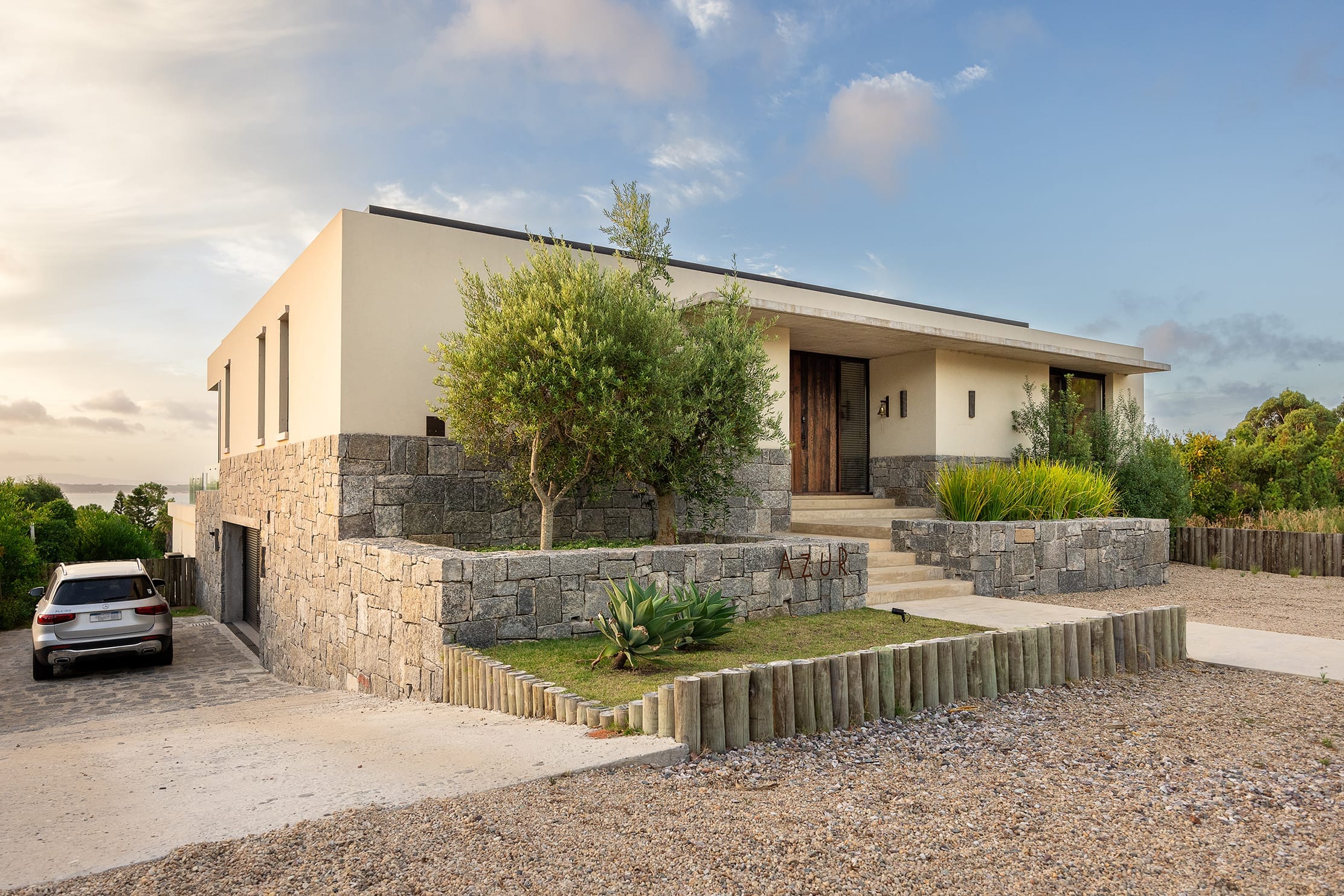 El terreno se encuentra en cuarta fila sobre la costa y enseñaba una pendiente pronunciada que al tiempo que aseguraba vistas fantásticas sobre la bahía, también debía enfrentar la visión de las casas construidas en ese mismo eje visual. Con la idea de aprovechar al máximo los recursos que prevé la normativa municipal, Delbene procedió a rellenar el terreno de modo tal de mantener el nivel de la calle de acceso y luego proyectar el volumen jugando con un desnivel controlado. Aprovechando la venta de las partes y restos emergentes de la demolición del viejo hotel San Rafael, Delbene adquirió unos importantes lotes de las piedras que revestían el añoso basamento para utilizarlos en el revestimiento de la base de su volumen, un rectángulo perfecto que ocupa alrededor de doscientos metros cuadrados por nivel resuelto con planta invertida que se desarrolla en dos niveles.