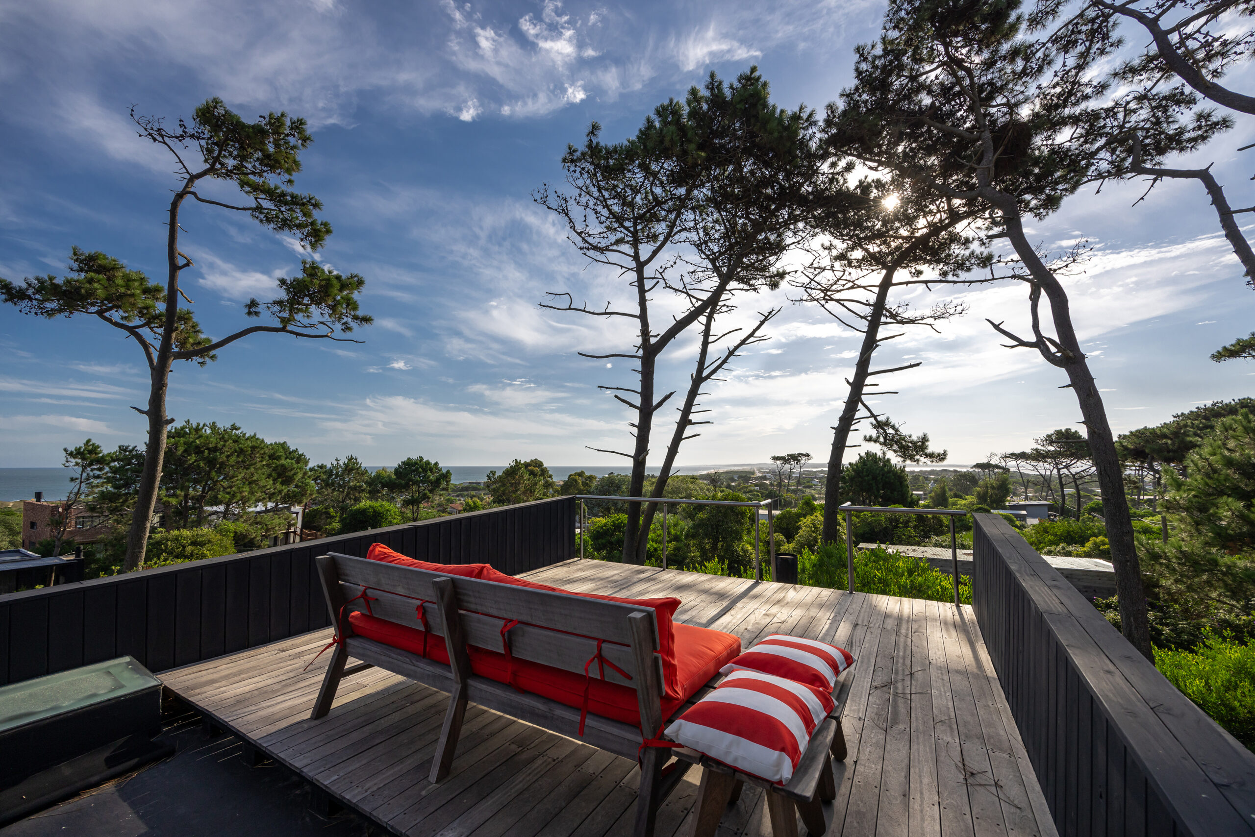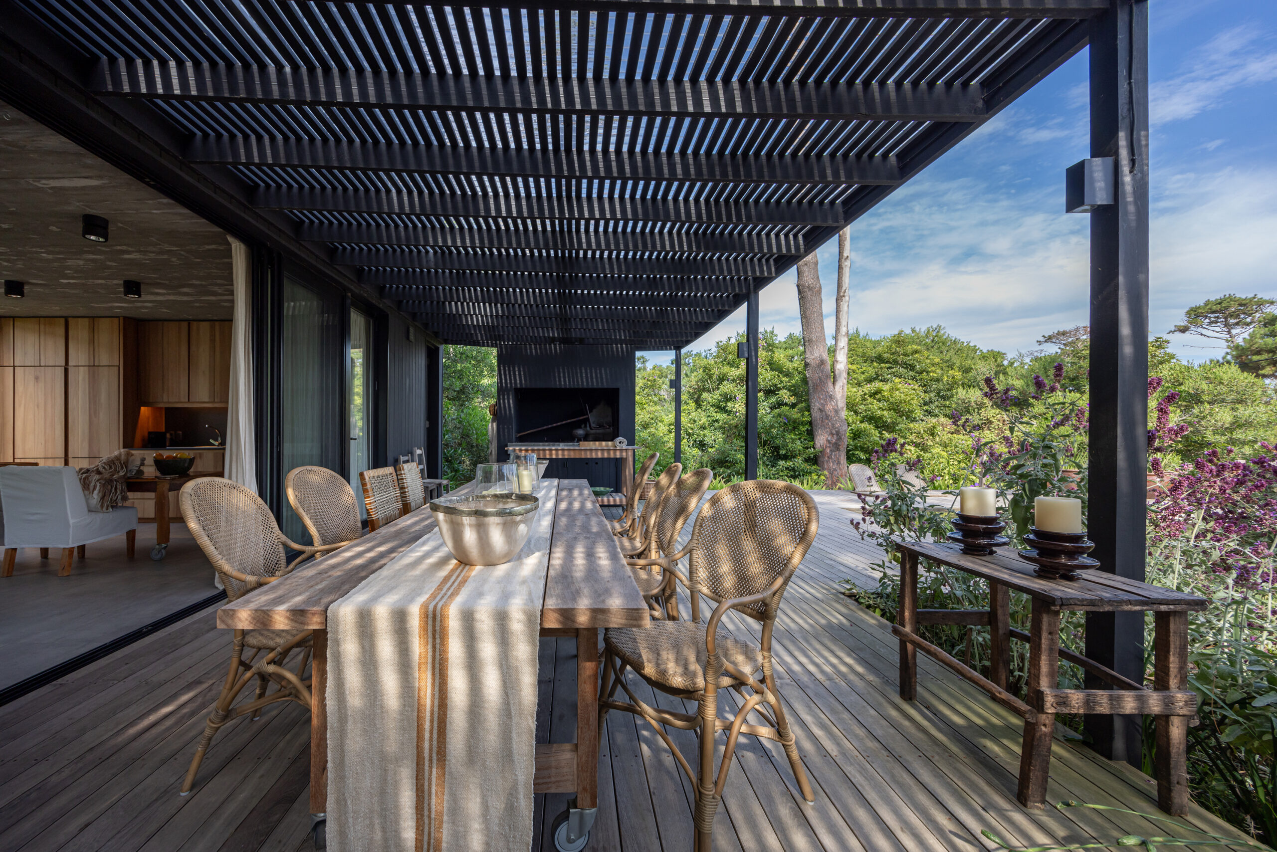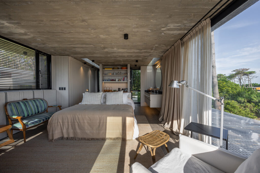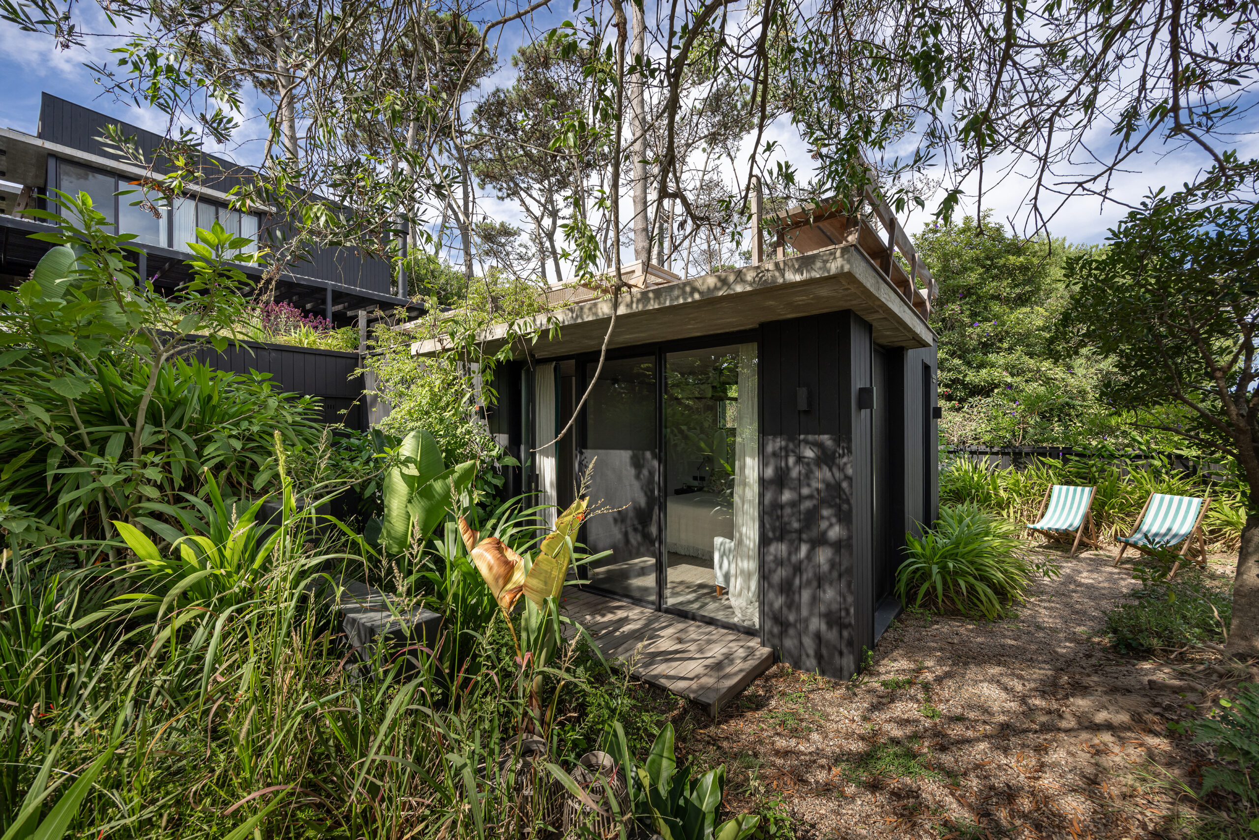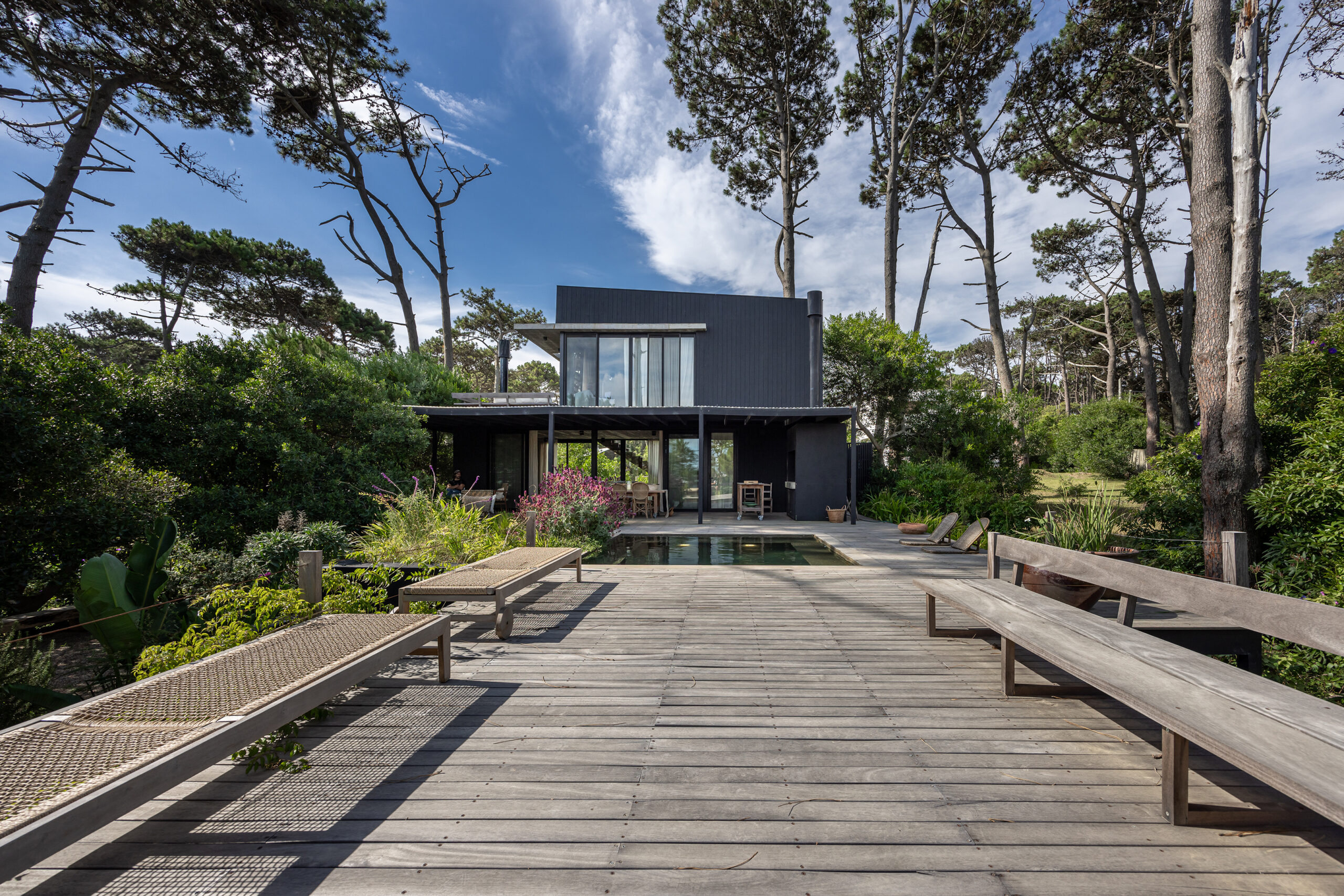 Este proyecto busca la fusión perfecta entre la arquitectura moderna y los elementos naturales de la costa uruguaya, con especial énfasis en el paisajismo. La vivienda, ubicada en un terreno rodeado de bosque, aprovecha las vistas panorámicas al mar desde la última planta, generando una experiencia única tanto en el interior como en el exterior del hogar. El diseño de la casa se concibe como un refugio que integra la belleza del paisaje costero y forestal, respetando la identidad de la zona y celebrando sus características naturales. A través de un enfoque contemporáneo, la casa se adapta al terreno con volúmenes que se despliegan en tres niveles, cada uno conectado de manera fluida con el entorno. La disposición de las estancias busca crear una transición suave entre el interior y el exterior, logrando que la casa se convierta en una extensión del paisaje natural. La organización de los espacios responde a una jerarquía funcional: la planta baja, dedicada a las áreas comunes, fluye hacia amplias terrazas exteriores que ofrecen una conexión directa con el bosque. En la planta alta se sitúa la única suite del volumen principal, con espacios de estar al exterior en una gran terraza, inmersa en el bosque, y la última planta con un gran roof top, donde la panorámica al océano y al bosque se convierte en un elemento esencial de la experiencia. El uso de materiales locales y vernáculos de la costa uruguaya es fundamental en este proyecto. Se opta por la madera autóctona de la región, utilizada tanto en la estructura como en el revestimiento de las fachadas exteriores e interiores. La madera, con su calidez y textura natural, se pintó de negro lo que la funde con el entorno, se combina con el hormigón para generar una arquitectura que dialoga con la naturaleza circundante, a la vez que mantiene una solidez estructural. Además de la madera, se incorporan materiales vernáculos característicos de la costa, como la piedra local, laja en la pileta, dando continuidad a la tradición constructiva de la región. Estos materiales no solo son duraderos, sino que también se integran estéticamente con el entorno, creando un ambiente armonioso y respetuoso con el paisaje. El paisajismo juega un papel crucial en este proyecto, actuando como un puente entre la casa y el entorno natural. Se ha diseñado un jardín que respeta la vegetación nativa de la región costera, utilizando especies autóctonas que fomentan la biodiversidad local. El paisaje se extiende de manera orgánica hacia el bosque y las áreas exteriores de la casa, creando un ambiente natural donde se mezclan caminos de piedras, áreas de decks y arbustos que dan protagonismo a las vistas.