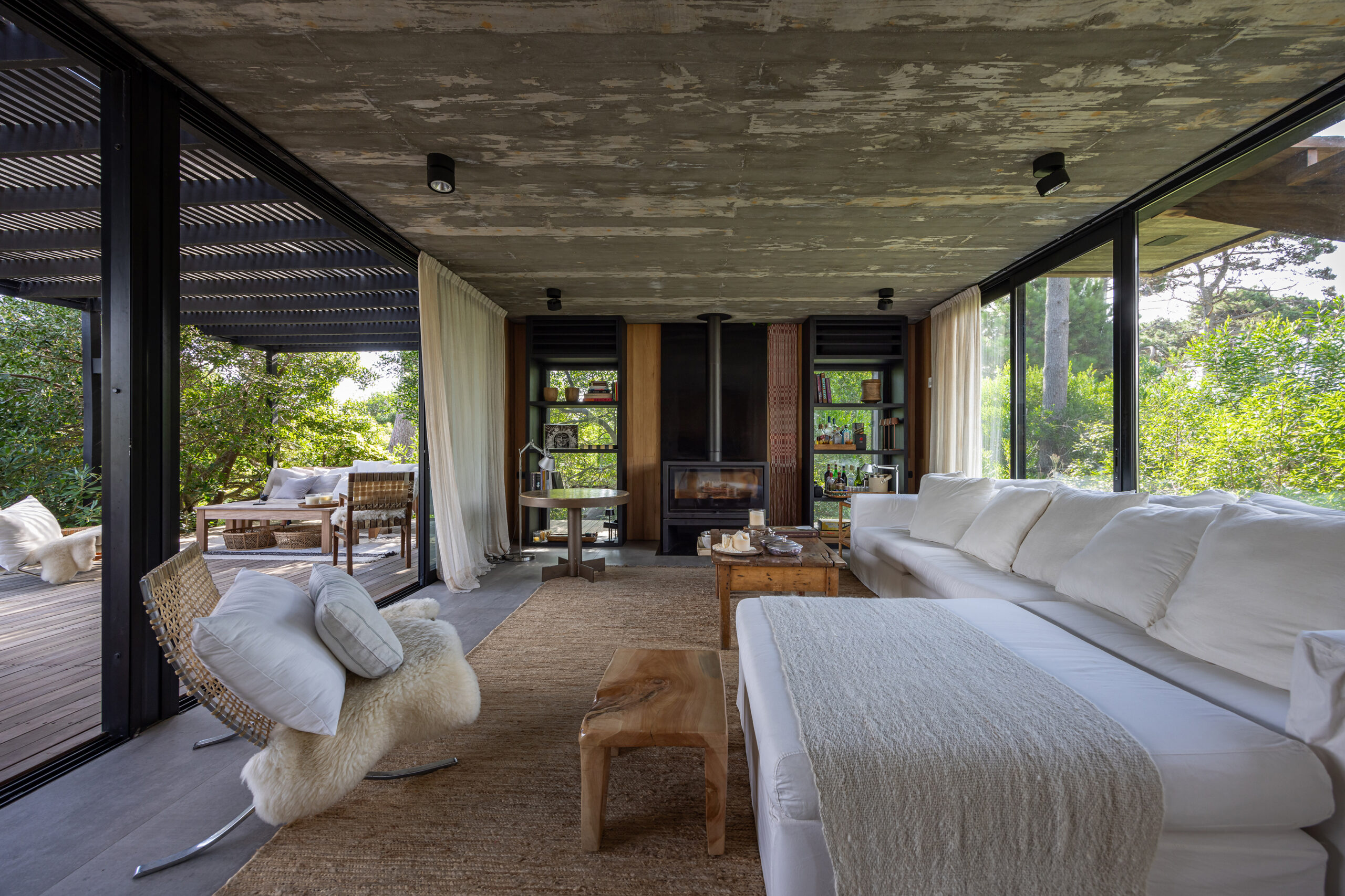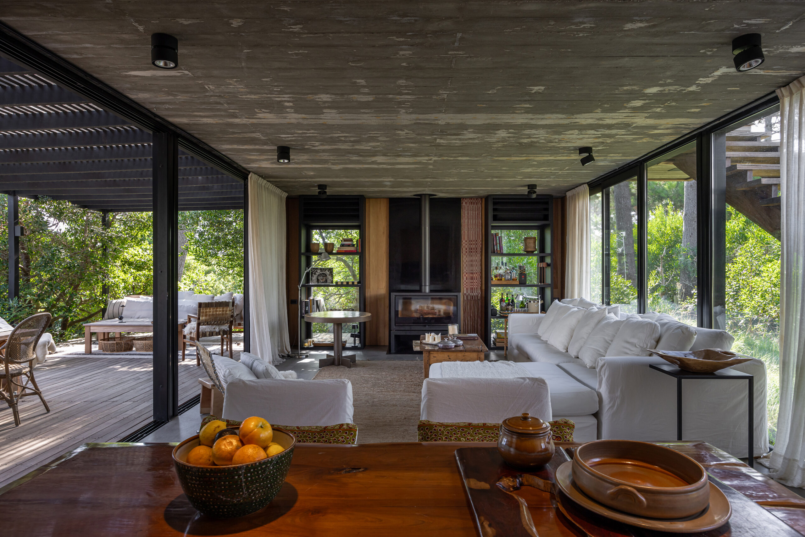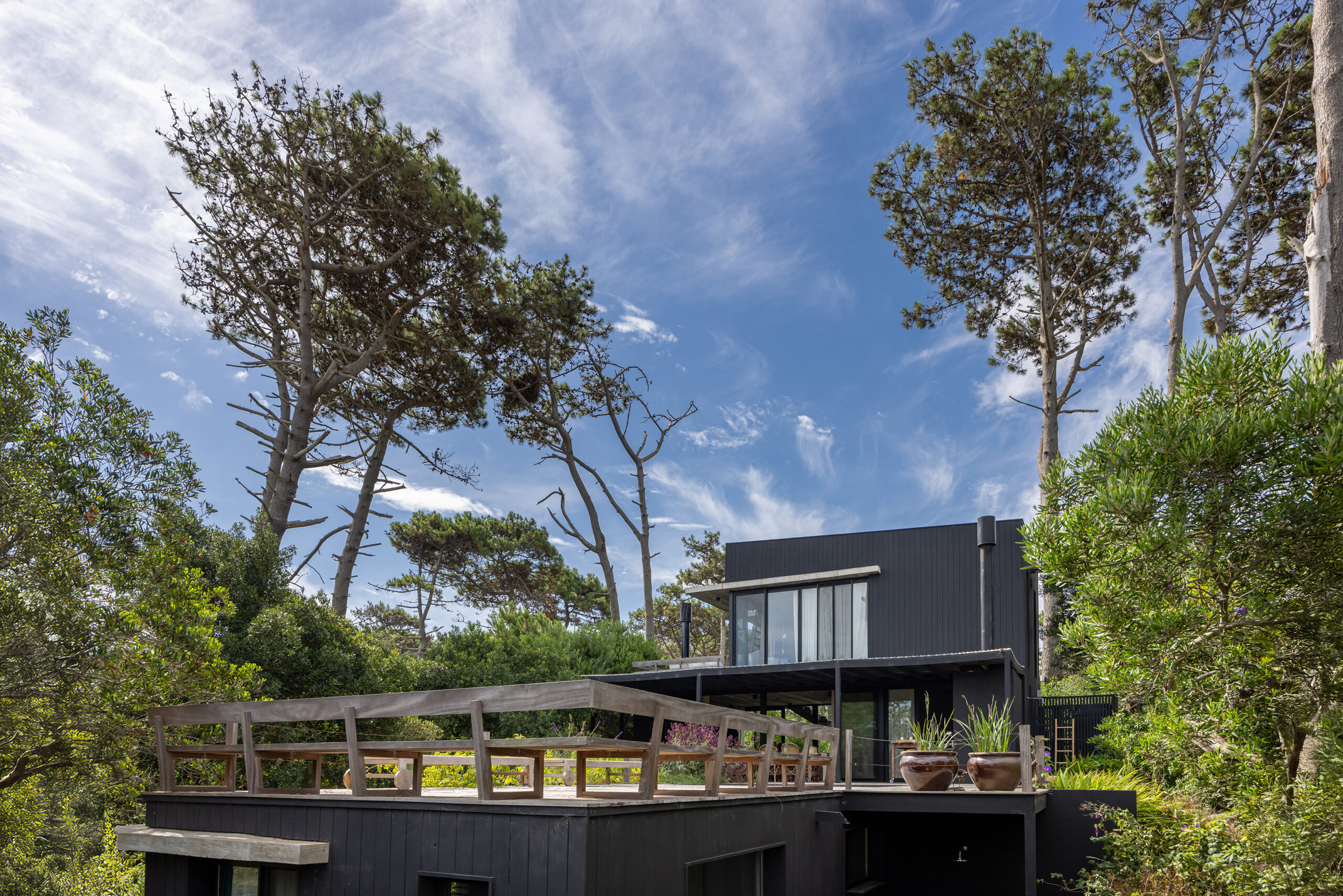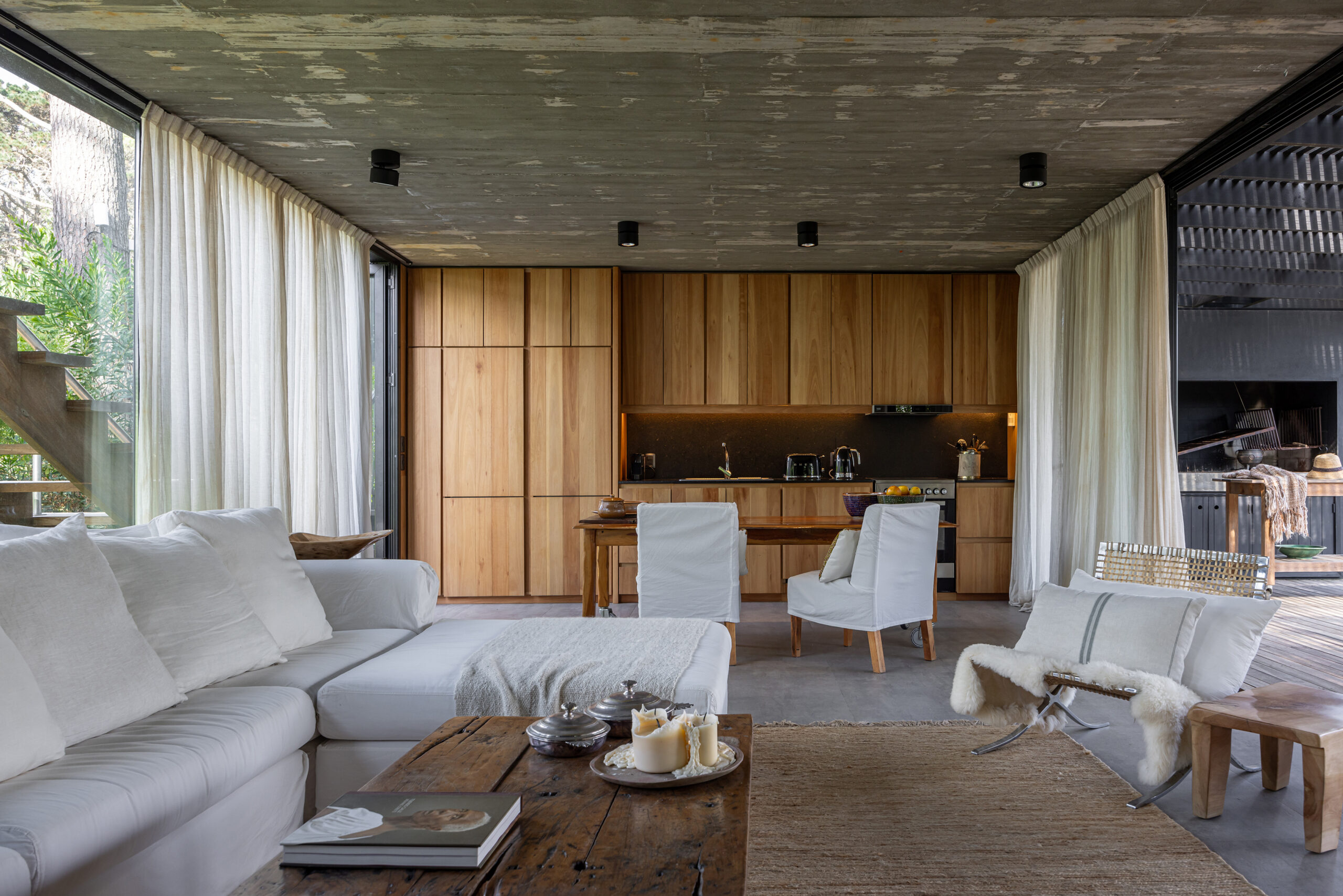 Este proyecto busca la fusión perfecta entre la arquitectura moderna y los elementos naturales de la costa uruguaya, con especial énfasis en el paisajismo. La vivienda, ubicada en un terreno rodeado de bosque, aprovecha las vistas panorámicas al mar desde la última planta, generando una experiencia única tanto en el interior como en el exterior del hogar. El diseño de la casa se concibe como un refugio que integra la belleza del paisaje costero y forestal, respetando la identidad de la zona y celebrando sus características naturales. A través de un enfoque contemporáneo, la casa se adapta al terreno con volúmenes que se despliegan en tres niveles, cada uno conectado de manera fluida con el entorno. La disposición de las estancias busca crear una transición suave entre el interior y el exterior, logrando que la casa se convierta en una extensión del paisaje natural. La organización de los espacios responde a una jerarquía funcional: la planta baja, dedicada a las áreas comunes, fluye hacia amplias terrazas exteriores que ofrecen una conexión directa con el bosque. En la planta alta se sitúa la única suite del volumen principal, con espacios de estar al exterior en una gran terraza, inmersa en el bosque, y la última planta con un gran roof top, donde la panorámica al océano y al bosque se convierte en un elemento esencial de la experiencia. El uso de materiales locales y vernáculos de la costa uruguaya es fundamental en este proyecto. Se opta por la madera autóctona de la región, utilizada tanto en la estructura como en el revestimiento de las fachadas exteriores e interiores. La madera, con su calidez y textura natural, se pintó de negro lo que la funde con el entorno, se combina con el hormigón para generar una arquitectura que dialoga con la naturaleza circundante, a la vez que mantiene una solidez estructural. Además de la madera, se incorporan materiales vernáculos característicos de la costa, como la piedra local, laja en la pileta, dando continuidad a la tradición constructiva de la región. Estos materiales no solo son duraderos, sino que también se integran estéticamente con el entorno, creando un ambiente armonioso y respetuoso con el paisaje. El paisajismo juega un papel crucial en este proyecto, actuando como un puente entre la casa y el entorno natural. Se ha diseñado un jardín que respeta la vegetación nativa de la región costera, utilizando especies autóctonas que fomentan la biodiversidad local. El paisaje se extiende de manera orgánica hacia el bosque y las áreas exteriores de la casa, creando un ambiente natural donde se mezclan caminos de piedras, áreas de decks y arbustos que dan protagonismo a las vistas.