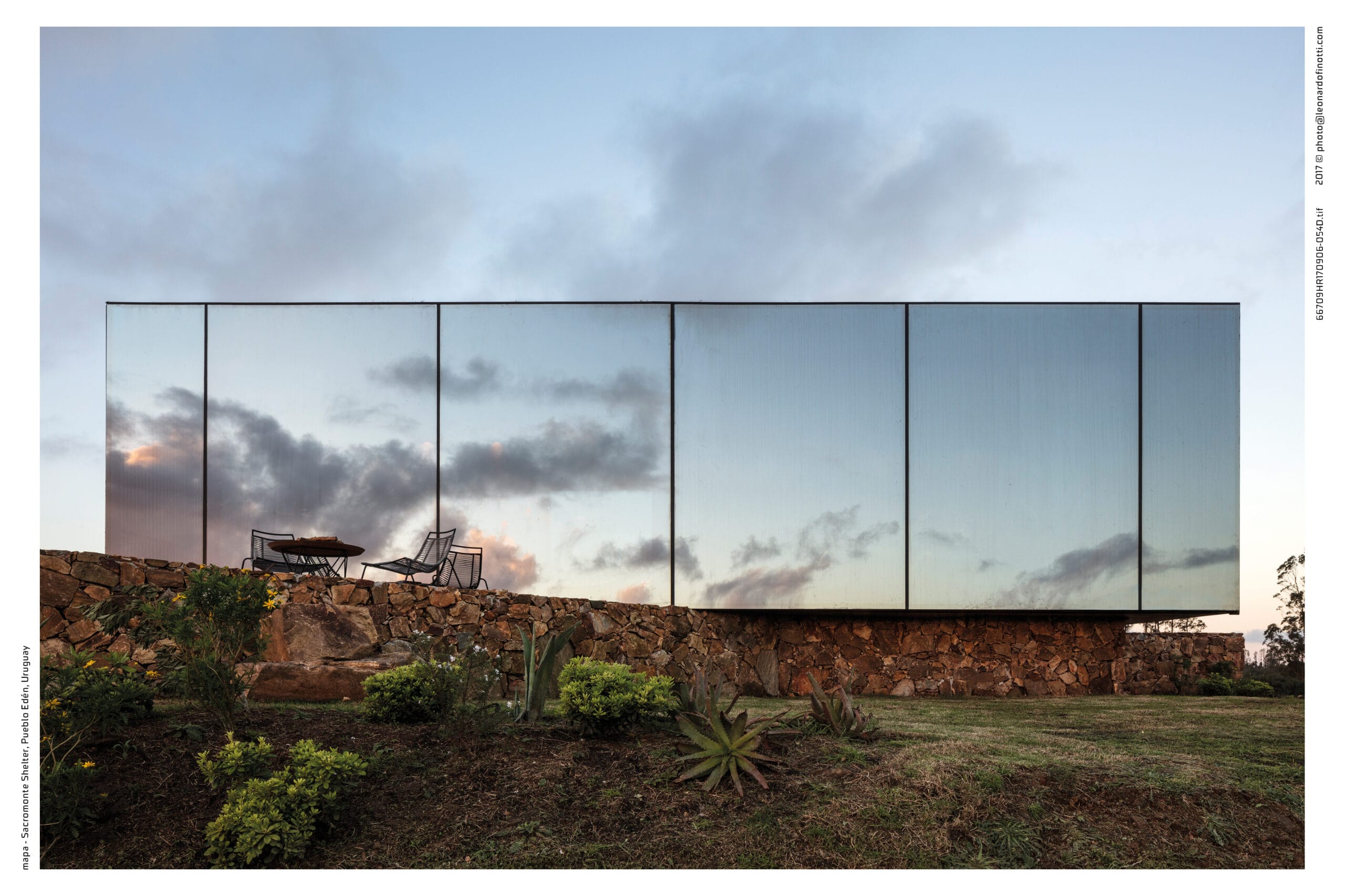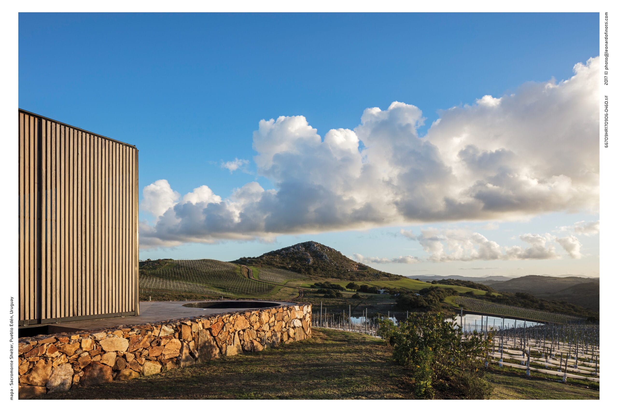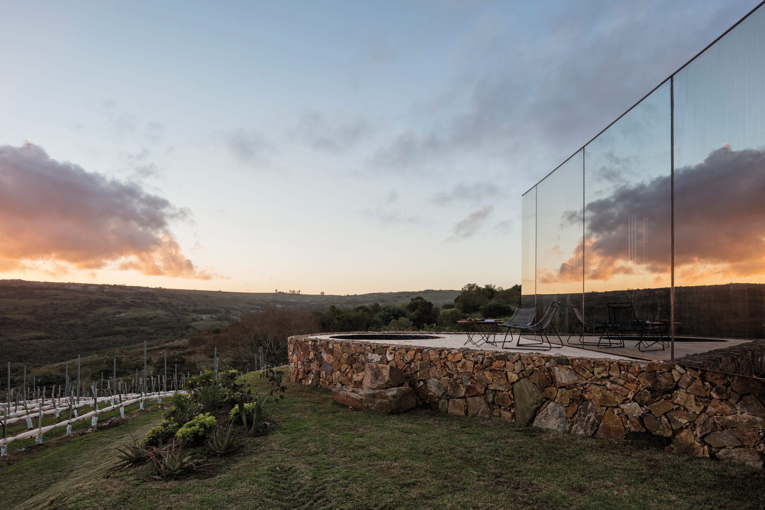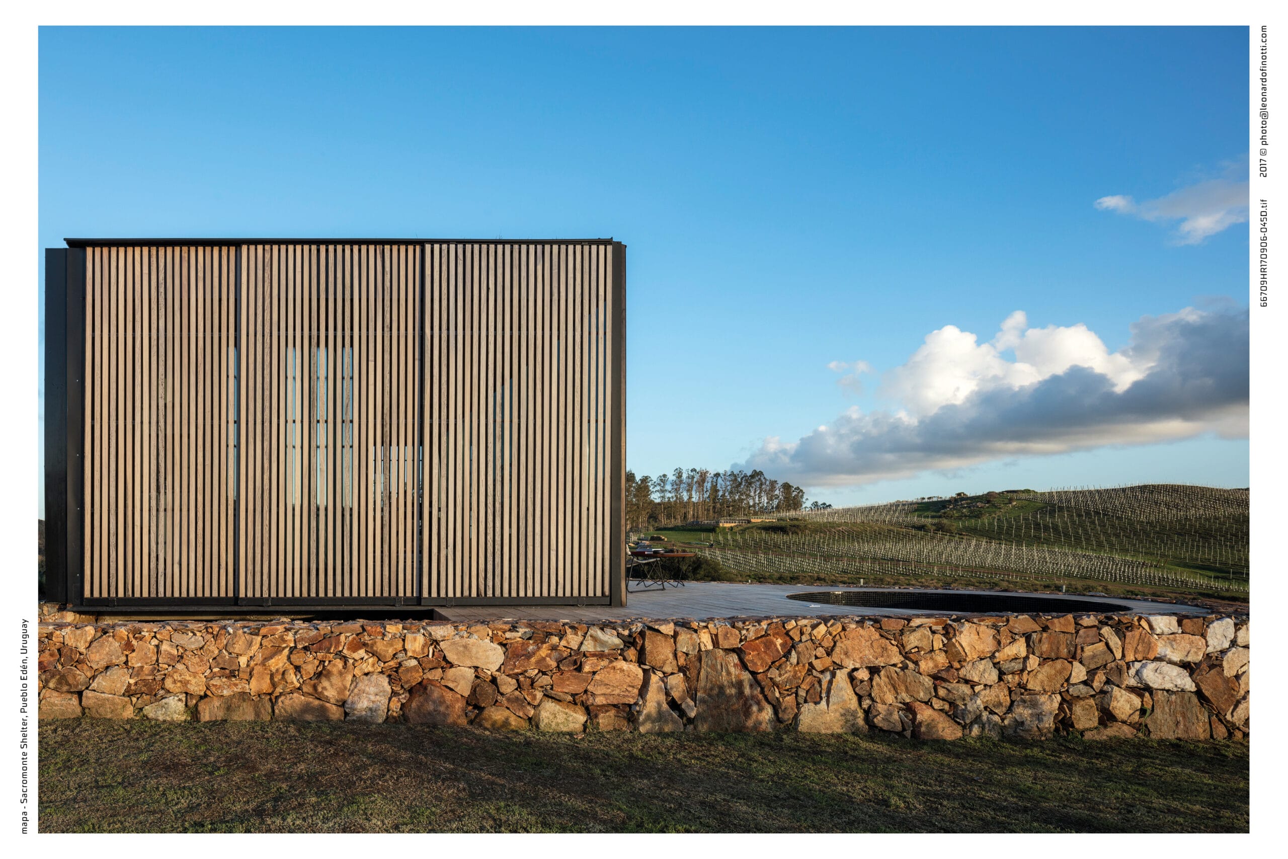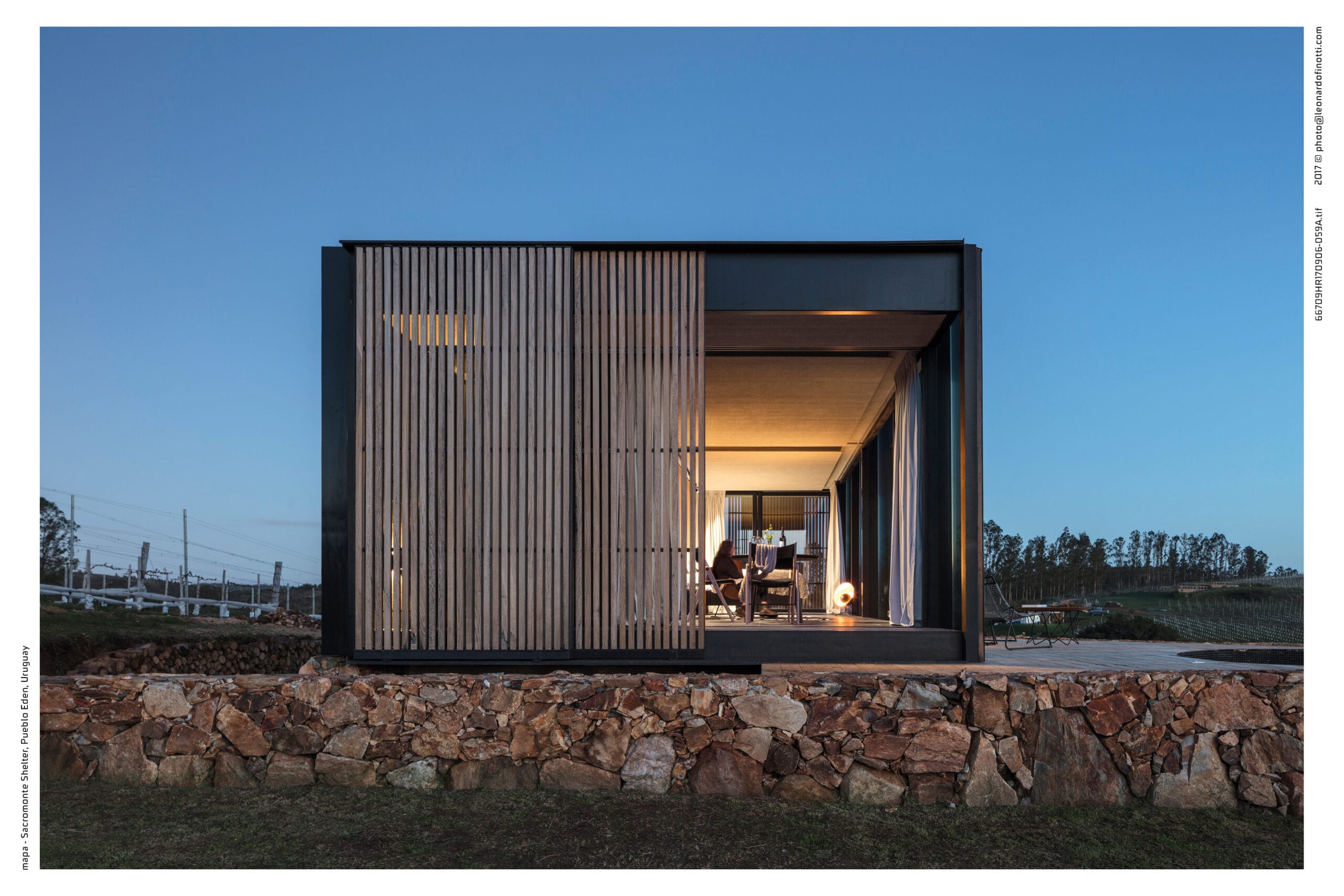 Sacromonte es una invitación a encontrarnos con la naturaleza remota y el mundo de los vinos finos, donde la sofisticación y lo originario conviven en una nueva experiencia de paisaje. Sus tierras ocupan más de 100 hectáreas se enclavan en un emplazamiento privilegiado: las sierras salvajes del este de Uruguay. Equidistante de Punta del Este, José Ignacio y Pueblo Garzón, configura un ecosistema único de disfrute, del que forma parte con espíritu propio. Sacromonte es paisaje. Es un campo de fuerzas relacionales, de antiguas intensidades y nuevos impulsos que coexisten en una nueva entidad inédita. Así, la naturaleza, lo productivo, las infraestructuras, las edificaciones y lo energético configuran un campo de estímulos a descubrir, un campo de experiencias. En este paisaje interactúan jóvenes viñedos que se adaptan a las características de los suelos, un cerro desde el cual entender el paisaje, verdes áreas de pradera, dos reservas de agua natural y varios arroyos que corren por los valles rodeados de densa vegetación autóctona. Es el explorador contemporáneo el encargado de recorrerlos y trazar su propio guion a través de diversos escenarios de los que es co-protagonista junto al paisaje. Las habitaciones de Sacromonte nacen en una fábrica en el área metropolitana de Montevideo. Se trata de un proceso rápido, de menos de 10 semanas, para luego ser transportadas más de 200 km de distancia, en un solo día. Al dejar la ciudad atrás, las habitaciones dejan de serlo, para transformarse en refugios de paisaje, dejan de ser objetos para devenir experiencias. En su estructura metálica modular, que combina steel framing y light steel framing, prima la simpleza constructiva y el uso eficiente de los materiales. Sus terminaciones son simples y contundentes, los materiales son usados según su naturaleza. En contraste, los muros que reciben los módulos prefabricados son construidos en simultáneo en el lugar con piedras locales que toman diversas formas orgánicas y se adaptan para posibilitar cada implantación. Se completan con piscinas circulares que integran una nueva experiencia sensorial del paisaje. De diferentes espesores entre los que se desarrolla la vida. El plano posterior se compone de un apilamiento de troncos de madera que rememora a los apilamientos de leña propios de la vida en la naturaleza. La siguiente capa alberga las áreas húmedas de baño y cocina, una estufa a leña y un hueco profundo ideal para leer un libro o dormir una siesta cobijado en el paisaje. Separado por un plano de madera, sigue el espacio principal de dormitorio, living y comedor, que se abre completamente al paisaje al que enfrenta, siendo parte de él. El plano frontal se conforma con un plano de vidrio espejado que cubre de un efecto casi mágico al refugio, posicionándolo en un tenso límite: entre el camuflaje y el tiempo de la naturaleza y el brillo irreal de lo tecnológico y del hoy.